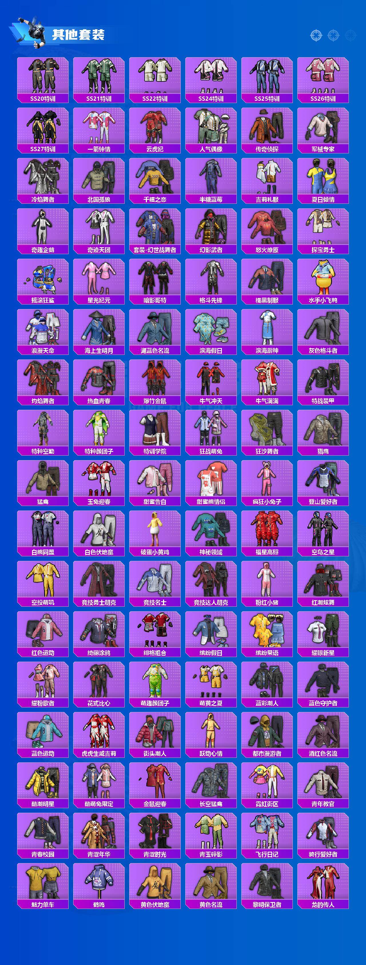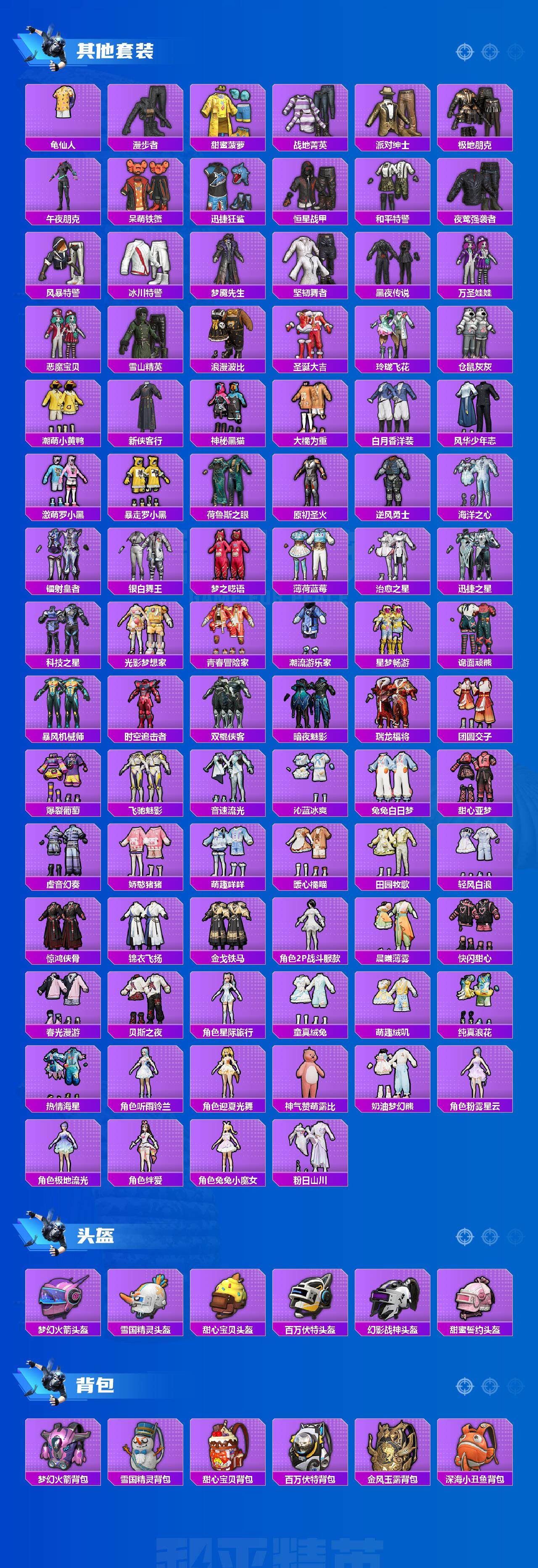 套装-浪漫天命,套装-龟仙人,套装-暗影哥特,套装-粉红小猪,套装-狂沙舞者,套装-破蛋小黄鸡,套装-漫步者,套装-雪山精英,新侠客行套装,白月香洋装套装,风华少年志套装,海洋之心套装,套装-梦之呓语,薄荷蓝莓套装,套装-诡面顽熊,套装-瑞龙福将,套装-团圆交子