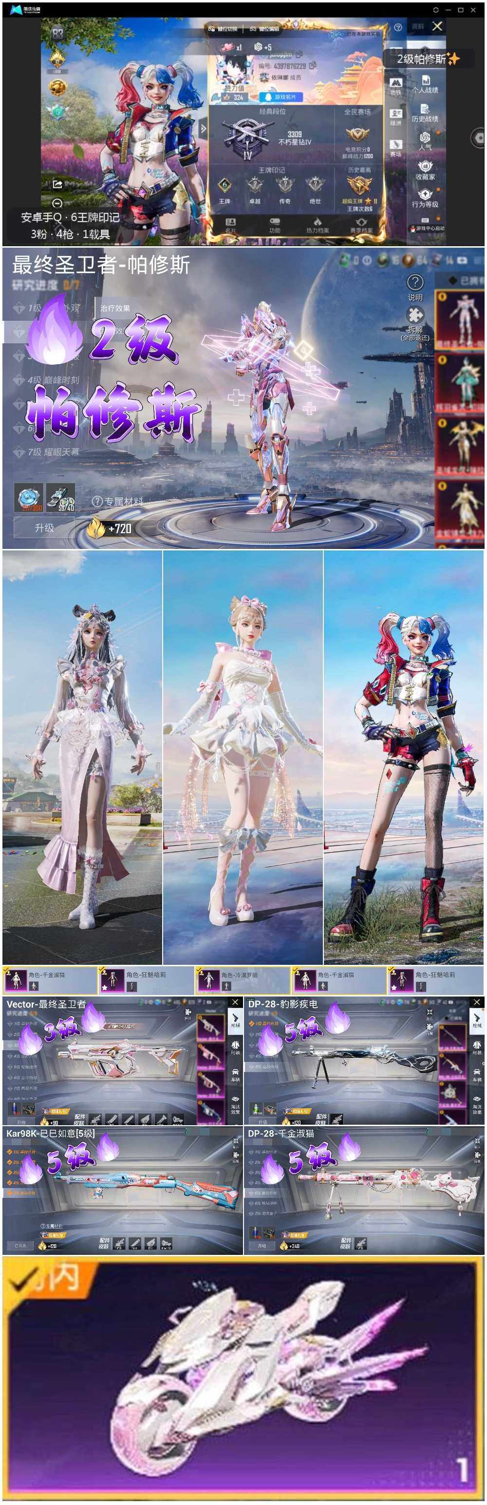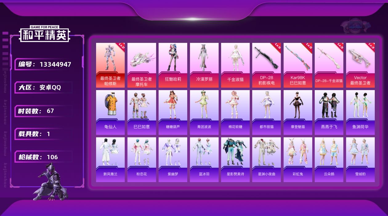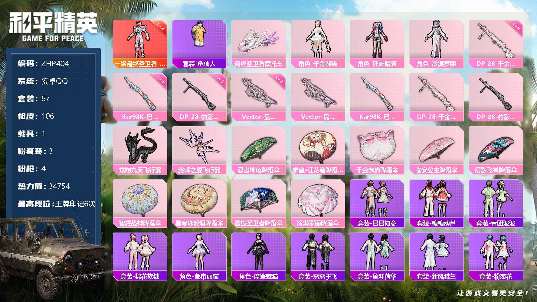 [13344947]可二次【店主推荐捡漏号!可直接换绑】/素材身法号 安卓 手Q-1神装-3粉装-4特效枪-1载具-2粉色飞行器-3.4w热力值-6王牌印记-67套装-106枪皮【红色神装等级】:最终圣卫者-帕修斯(二级)【热门品类】:套装-龟仙人【粉色载具】:最终圣卫者摩托车【粉色套装】:角色-千金淑猫,角色-狂魅哈莉,角色-冷漠罗丽【粉色枪皮等级】:Vector-最终圣卫者(三级),Kar98K-巳巳如意(五级),DP-28-千金淑猫(五级),DP-28-豹影疾电(五级)【粉色飞行器】:龙翔九天飞行器,终晖之翼飞行器