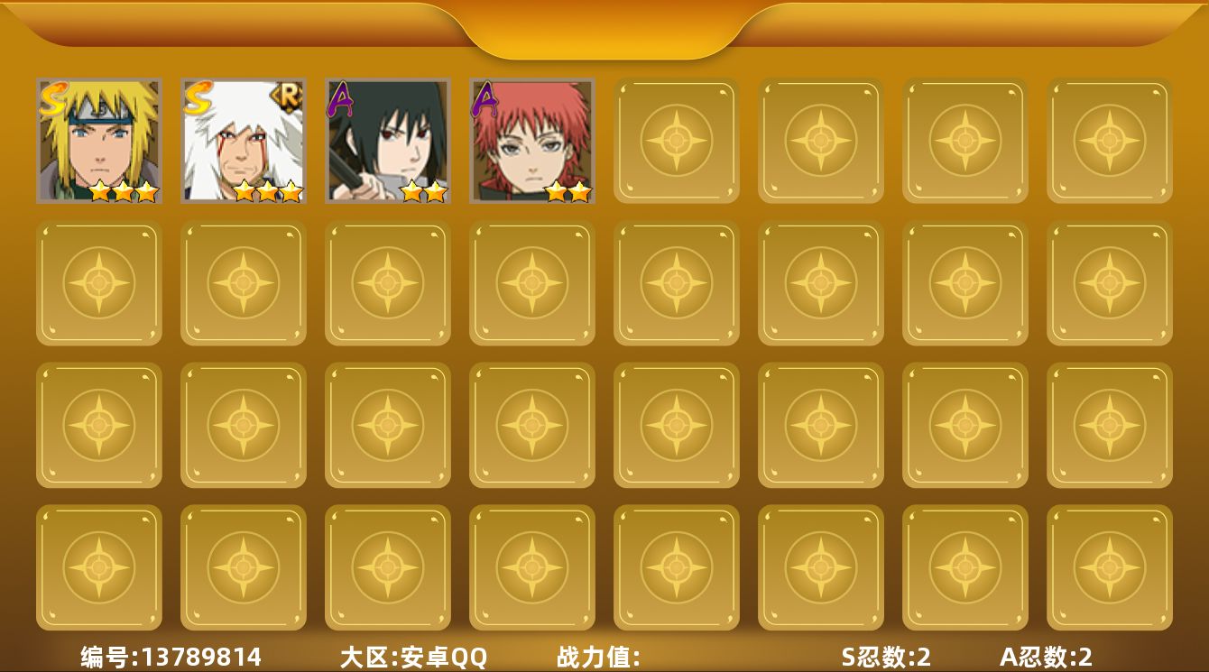 [13789814]2S级忍者数-2A级忍者数 【S级忍者】:自来也「舞之豪杰」(3星自来也「舞之豪杰」),波风水门(3星波风水门) 【A级忍者】:蝎(2星蝎),宇智波佐助「须佐能乎」(2星宇智波佐助「须佐能乎」)