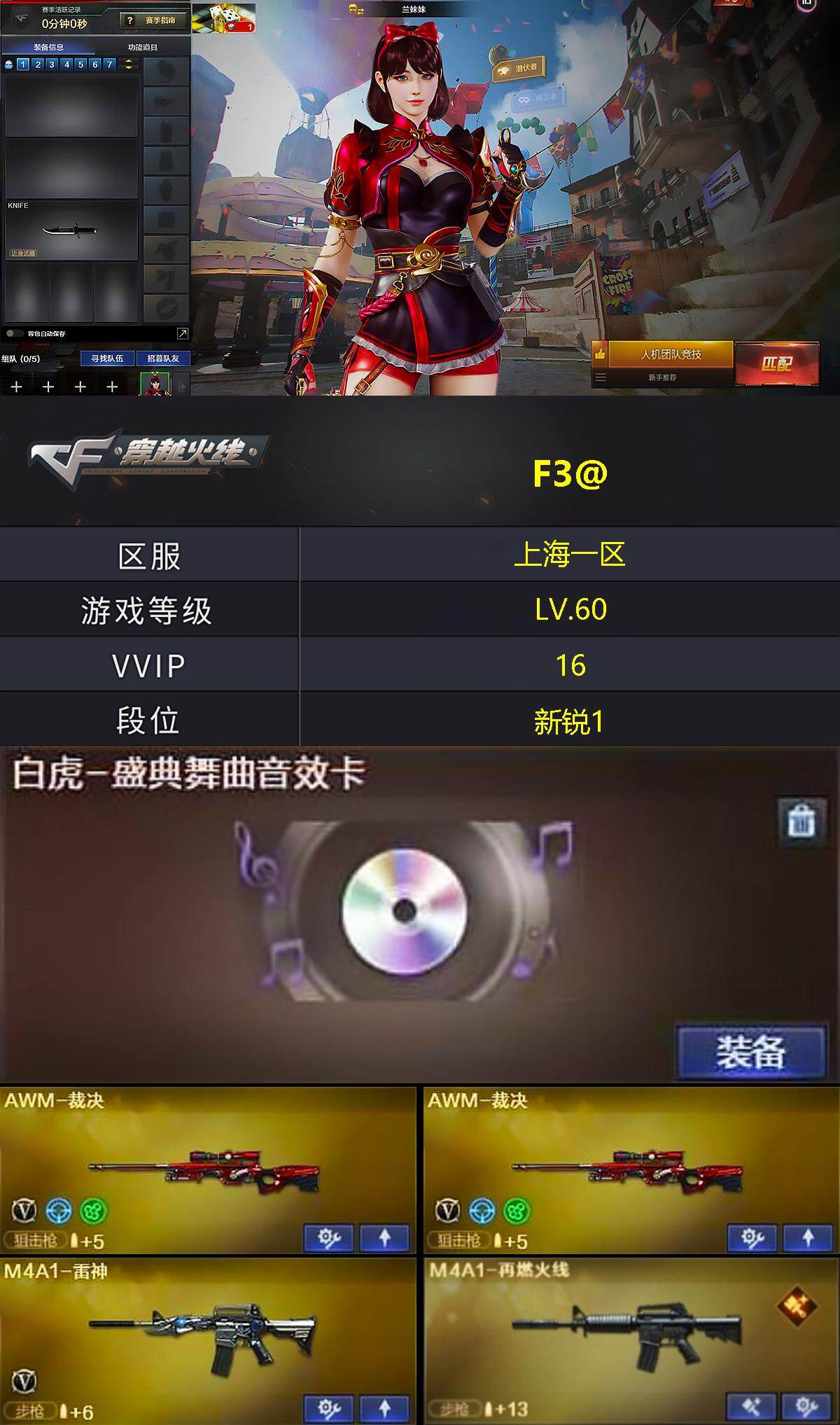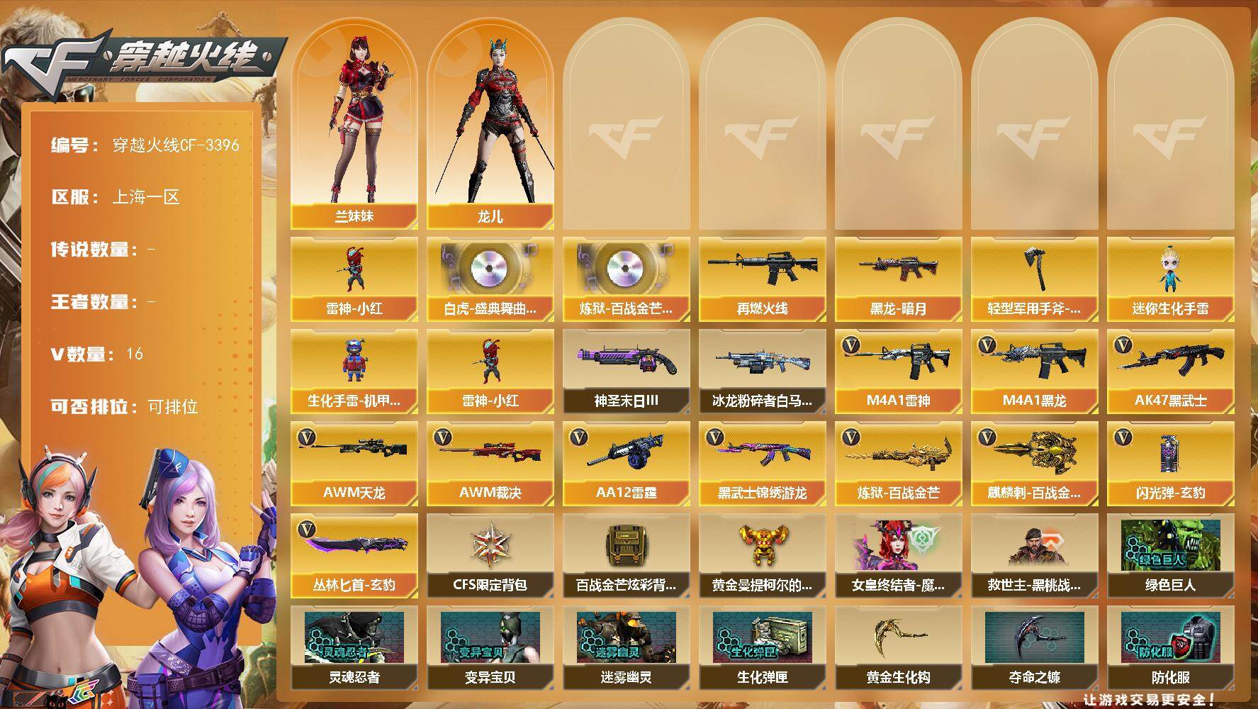[13582618]上海一区-16V-0王者-0炫金 【热门武器】:雷神-小红 【音效卡】:白虎-盛典舞曲音效卡,炼狱-百战金芒-庆典舞曲音效卡 【皮肤】:M4A1-再燃火线,黑龙-暗月,轻型军用手斧-再燃火线 【角色】:兰妹妹,龙儿 【人偶武器】:雷神-小红,迷你生化手雷,生化手雷-机甲核心*2 【挑战大师】:冰龙粉碎者-白马银枪,神圣爆裂者-末日III 【英雄级武器】:M4A1-黑龙,M4A1-雷神,AK47-黑武士,黑武士-锦绣游龙,AWM-天龙,AWM-裁决*2,炼狱-百战金芒,AA-12-雷霆,麒麟刺-百战金芒,丛林匕首-玄豹,闪光弹-玄豹 【道具】:CFS限定背包,百战金芒炫彩背包,黄金曼提柯尔的背包,女皇终结者-魔龙之吻,救世主-黑桃战神,黄金生化钩,绿色巨人,灵魂忍者*2,变异宝贝,迷雾幽灵*2,生化弹匣,夺命之镰,防化服*3,金色流光-枪王排位,星辰流光-枪王排位,流光-再燃火线,枪王排位28赛季金色流光,语音特效-盛典烟火,萌萌小葵表情,EP战队名片,EP战队喷图,EP战队击杀图标,防弹头盔*3,防弹衣*3,C4工具钳*3,手雷包*3 【特殊枪械】: