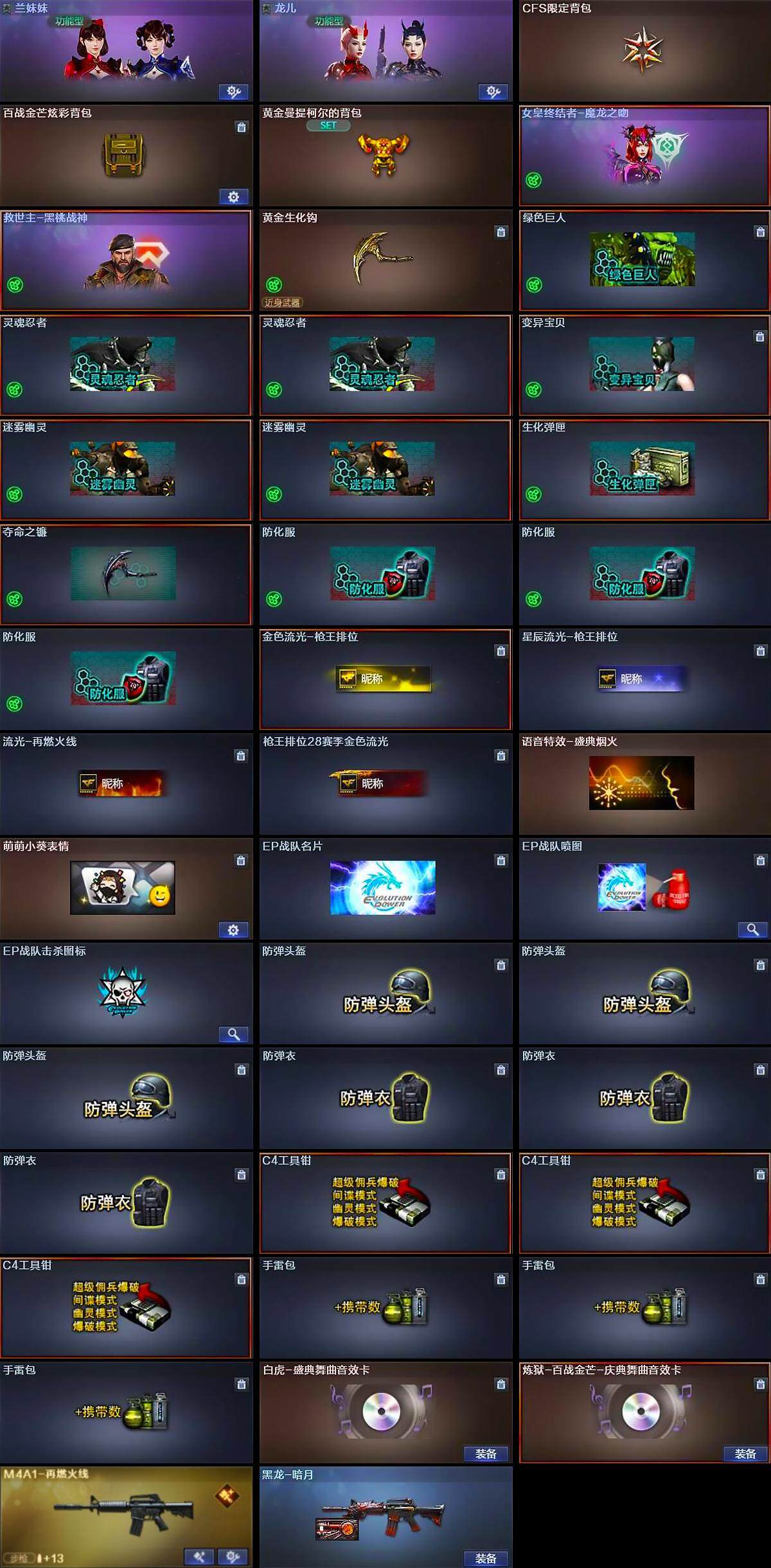 【道具】:CFS限定背包,百战金芒炫彩背包,黄金曼提柯尔的背包,女皇终结者-魔龙之吻,救世主-黑桃战神,黄金生化钩,绿色巨人,灵魂忍者*2,变异宝贝,迷雾幽灵*2,生化弹匣,夺命之镰,防化服*3,金色流光-枪王排位,星辰流光-枪王排位,流光-再燃火线,枪王排位28赛季金色流光,语音特效-盛典烟火,萌萌小葵表情,EP战队名片,EP战队喷图,EP战队击杀图标,防弹头盔*3,防弹衣*3,C4工具钳*3,手雷包*3