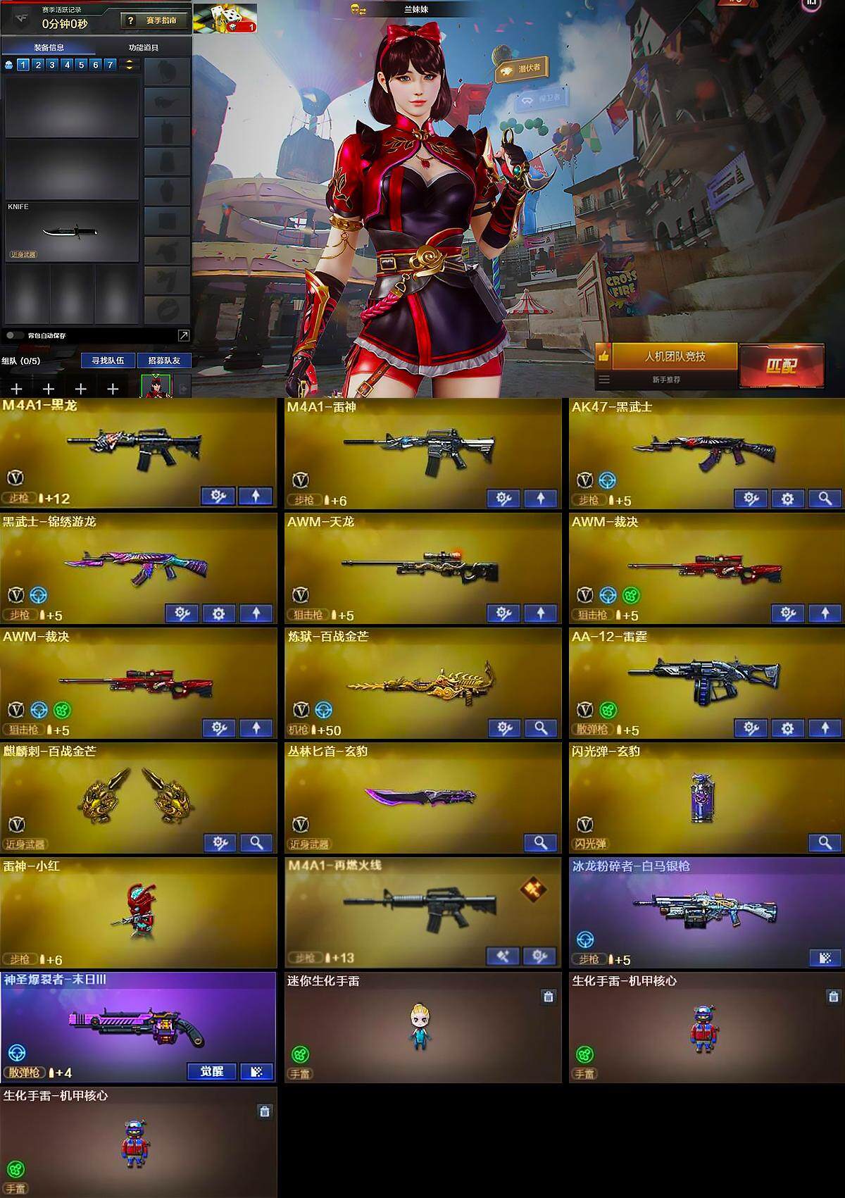 【英雄级武器】:M4A1-黑龙,M4A1-雷神,AK47-黑武士,黑武士-锦绣游龙,AWM-天龙,AWM-裁决*2,炼狱-百战金芒,AA-12-雷霆,麒麟刺-百战金芒,丛林匕首-玄豹,闪光弹-玄豹