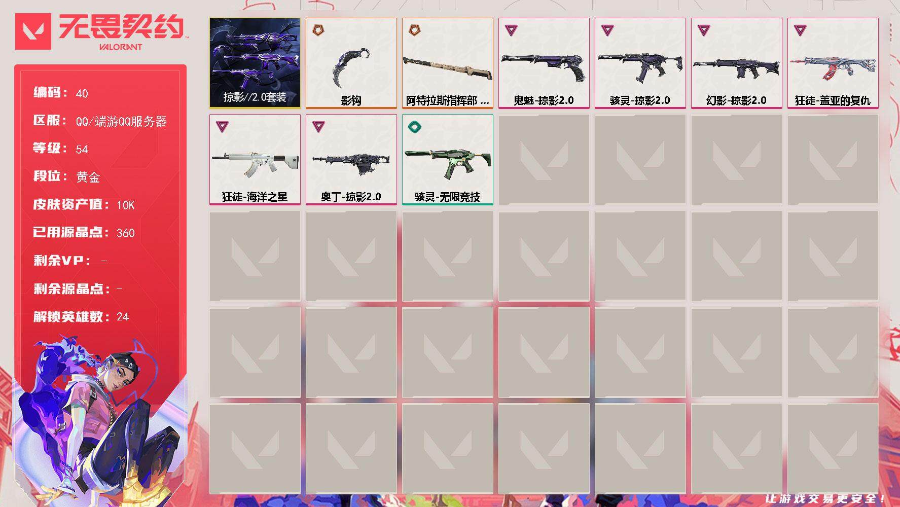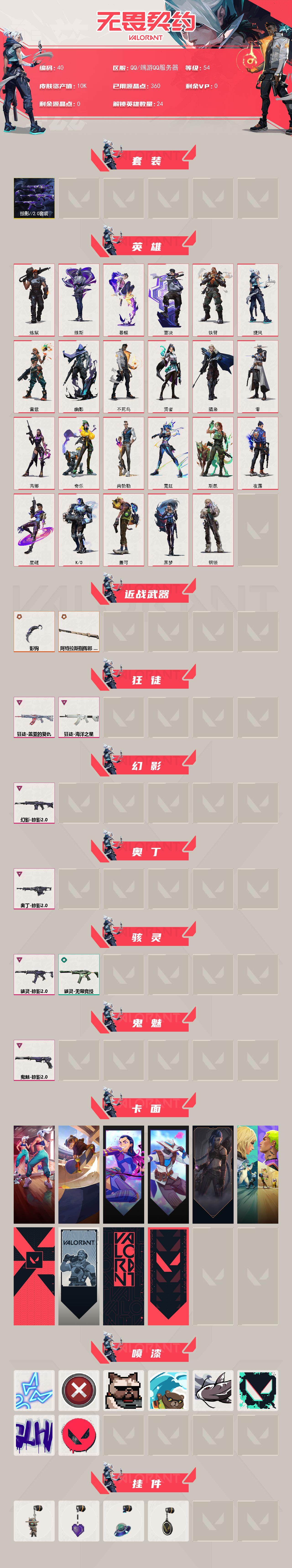 [13587058]【套装】:掠影//2.0套装 【英雄】:炼狱,维斯,暮蝶,壹决,铁臂,捷风,雷兹,幽影,不死鸟,贤者,猎枭,零,芮娜,奇乐,尚勃勒,霓虹,斯凯,夜露,星礈,K/O,盖可,黑梦,钢锁 【近战 武器】:近战武器-影钩,近战武器-阿特拉斯指挥部 甩棍 【狂徒】:狂徒-盖亚的复仇,狂徒-海洋之星 【幻影】:幻影-掠影//2.0 【奥丁】:奥丁-掠影//2.0 【骇灵】:骇灵-掠影//2.0,骇灵-无限竞技 【鬼魅】:鬼魅-掠影//2.0 【卡面】:热舞环节 卡面,Clutch 卡面,无畏契约GO!第一卷:芮娜 卡面,无畏契约GO!第一卷:零 卡面,《双城之战》金克丝 卡面,钢锁vs盖可 卡面,代号红色 卡面,新兵报到 卡面,V契约 卡面,无畏契约 卡面 【喷漆】:霓光四射 喷漆,买装还是存钱 喷漆,关门放狗 喷漆,酷熊冲浪 喷漆,松叶 喷漆,胜利属于无畏契约 喷漆,GLHF 喷漆,无畏契约 喷漆 【挂饰】:无畏契约GO!第一卷 零 挂饰,薰衣草之心 挂饰,天外飞客 挂饰,无畏契约 纪念币 挂饰