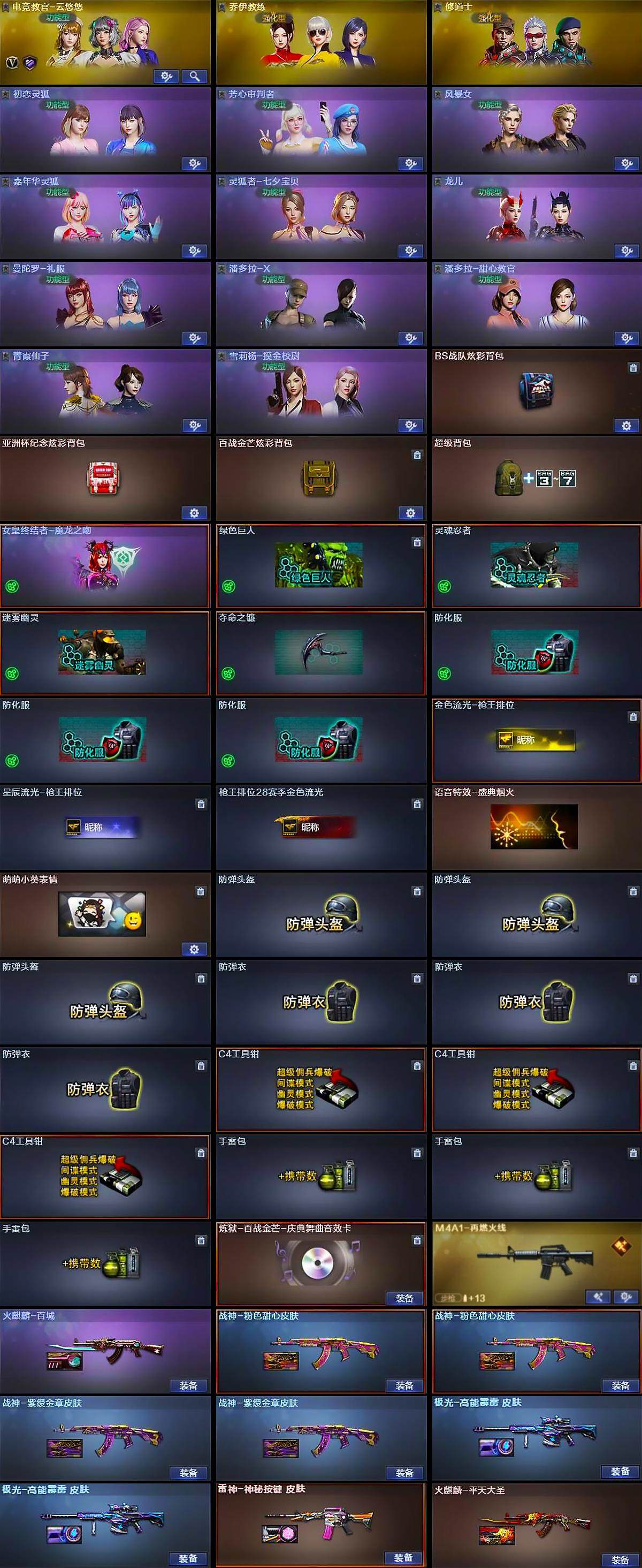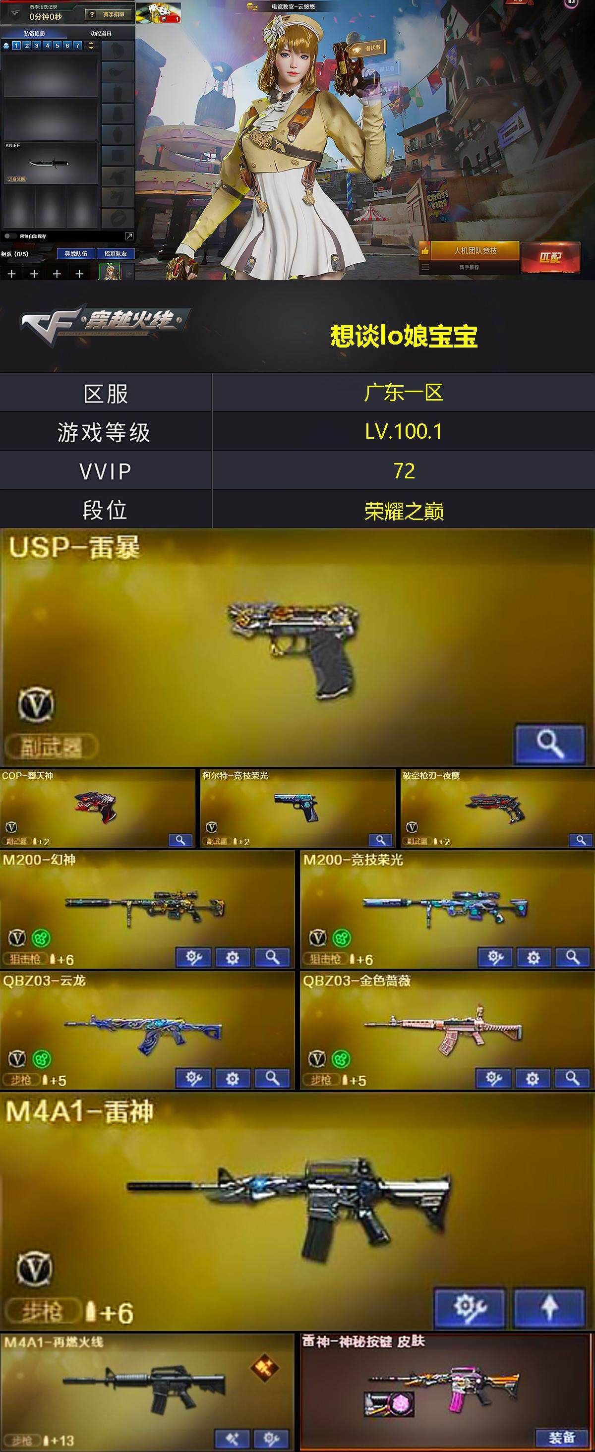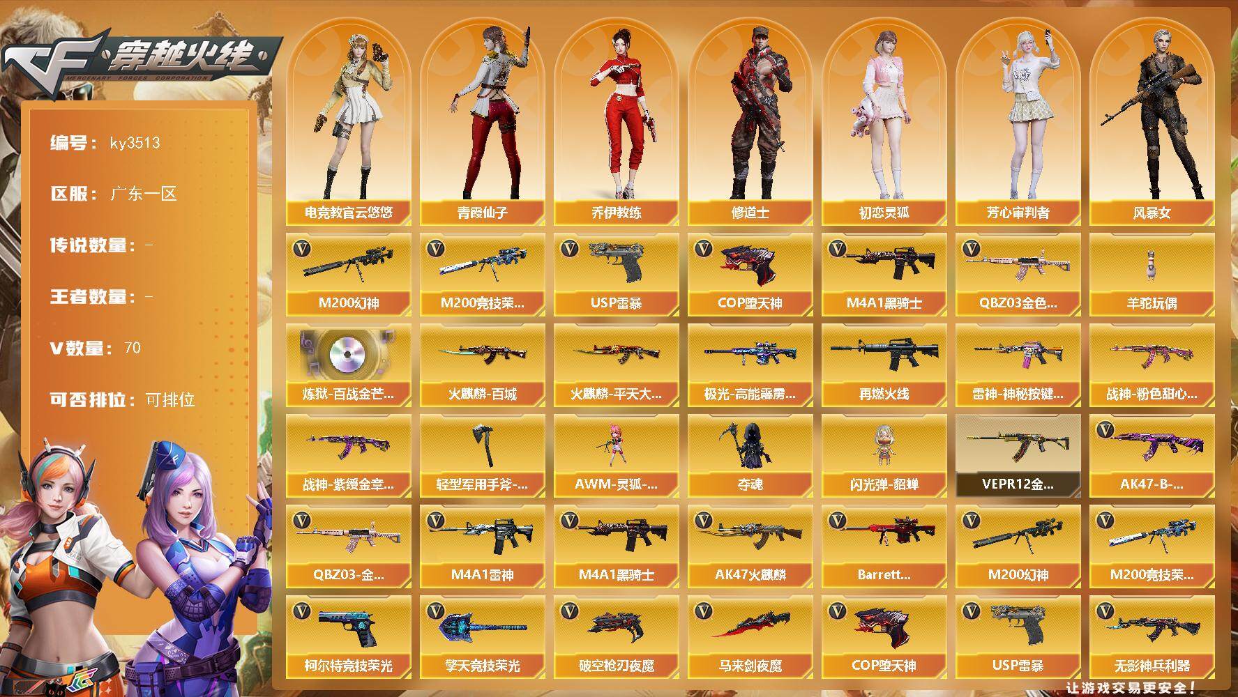 [13752316]广东一区-70V-0王者-0炫金 【热门武器】:QBZ03-金色蔷薇,M200-幻神,M200-竞技荣光,M4A1-黑骑士,羊驼玩偶,USP-雷暴,COP-堕天神 【音效卡】:炼狱-百战金芒-庆典舞曲音效卡 【皮肤】:M4A1-再燃火线,雷神-神秘按键 皮肤,火麒麟-平天大圣,火麒麟-百城,战神-粉色甜心皮肤*2,战神-紫绶金章皮肤*2,极光-高能霹雳 皮肤*2,轻型军用手斧-再燃火线 【角色】:电竞教官-云悠悠,乔伊教练,修道士,初恋灵狐,芳心审判者,风暴女,嘉年华灵狐,灵狐者-七夕宝贝,龙儿,曼陀罗-礼服,潘多拉-X,潘多拉-甜心教官,青霞仙子,雪莉杨-摸金校尉 【人偶武器】:AWM-灵狐-15周年嘉年华*2,夺魂,闪光弹-貂蝉 【挑战大师】:VEPR-12-金魔 【英雄级武器】:AK47-火麒麟,M4A1-雷神,M4A1-黑骑士,无影-神兵利器,QBZ03-云龙,黑武士-锦绣游龙,QBZ03-金色蔷薇,AK-47-猩红传说*2,AK47-B-常胜将军,Barrett-极光,M200-幻神,M200-竞技荣光,炼狱-百战金芒,USP-雷暴,COP-堕天神,柯尔特-竞技荣光,破空枪刃-夜魔,马来剑-夜魔,擎天-竞技荣光*2,麒麟刺-百战金芒,高爆手雷-夜魔*4,高爆手雷-竞技荣光*9,高爆手雷-云龙,闪光弹-夜魔*4,闪光弹-竞技荣光*8,闪光弹-云龙,烟雾弹-夜魔*4,烟雾弹-竞技荣光*9,M4A1-苍鸣雷神 【道具】:BS战队炫彩背包,亚洲杯纪念炫彩背包,百战金芒炫彩背包,超级背包,女皇终结者-魔龙之吻,绿色巨人,灵魂忍者,迷雾幽灵,夺命之镰,防化服*3,金色流光-枪王排位,星辰流光-枪王排位,枪王排位28赛季金色流光,语音特效-盛典烟火,萌萌小葵表情,防弹头盔*3,防弹衣*3,C4工具钳*3,手雷包*3 【特殊枪械】:1黑骑士