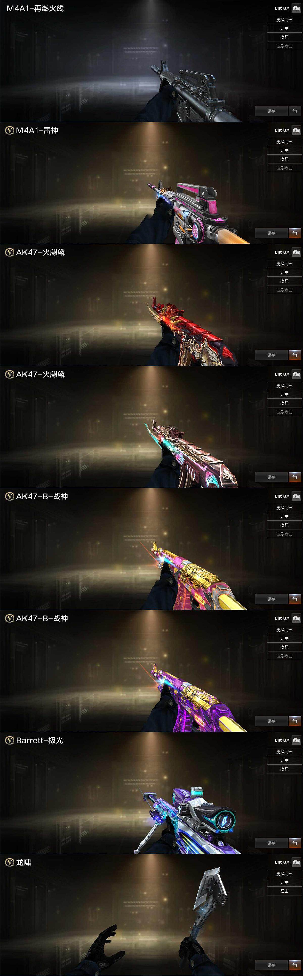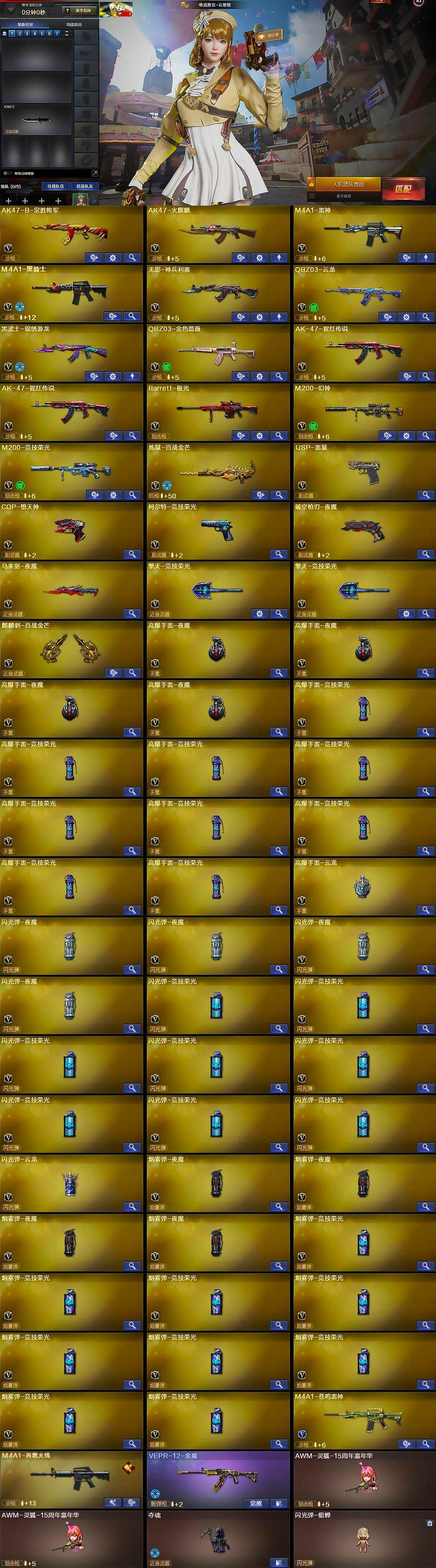 【英雄级武器】:AK47-火麒麟,M4A1-雷神,M4A1-黑骑士,无影-神兵利器,QBZ03-云龙,黑武士-锦绣游龙,QBZ03-金色蔷薇,AK-47-猩红传说*2,AK47-B-常胜将军,Barrett-极光,M200-幻神,M200-竞技荣光,炼狱-百战金芒,USP-雷暴,COP-堕天神,柯尔特-竞技荣光,破空枪刃-夜魔,马来剑-夜魔,擎天-竞技荣光*2,麒麟刺-百战金芒,高爆手雷-夜魔*4,高爆手雷-竞技荣光*9,高爆手雷-云龙,闪光弹-夜魔*4,闪光弹-竞技荣光*8,闪光弹-云龙,烟雾弹-夜魔*4,烟雾弹-竞技荣光*9,M4A1-苍鸣雷神