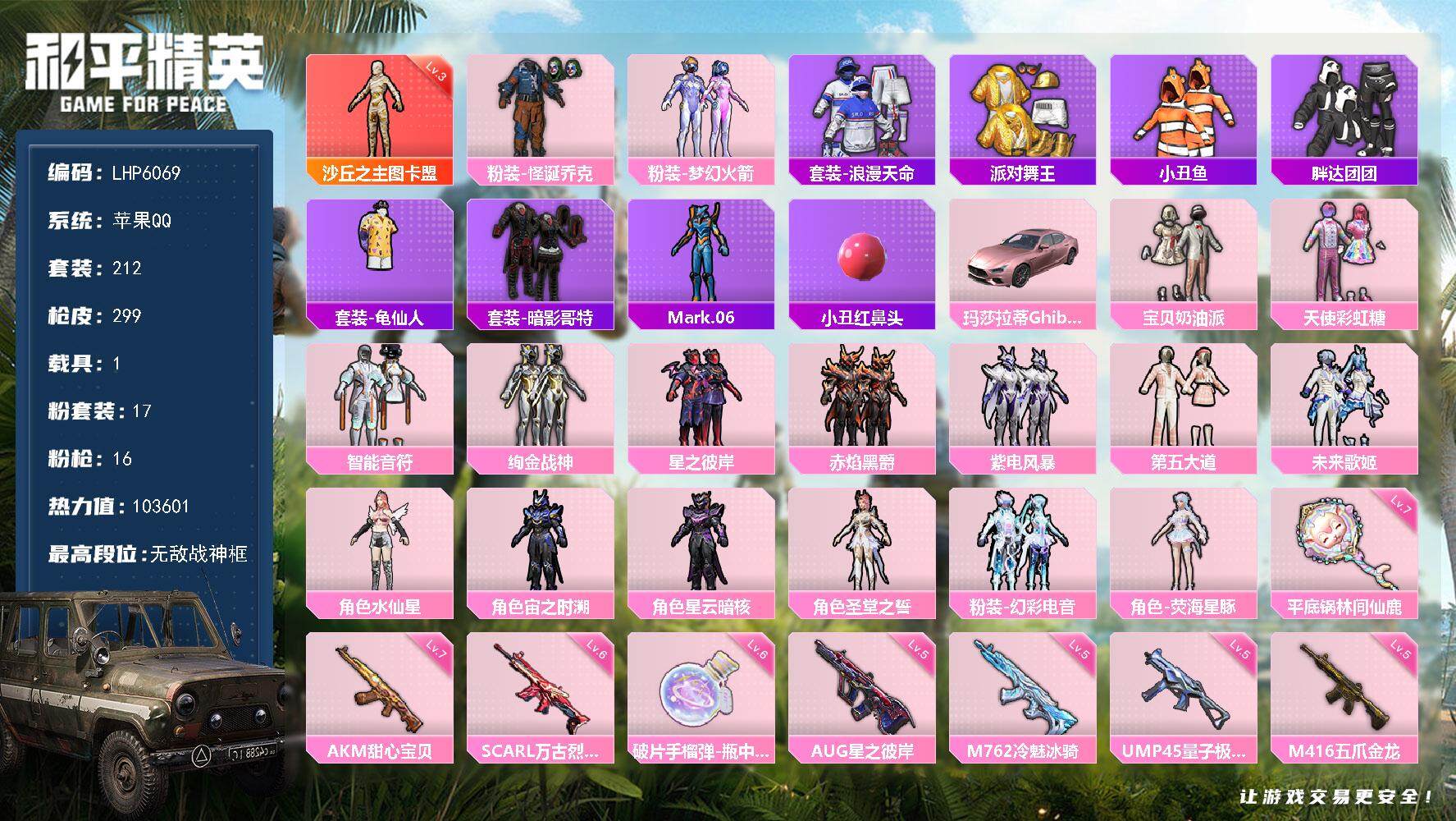 [13622618]可二次【店主推荐捡漏号!可直接换绑】/素材身法号/无敌战神框1/绝世印记4/地铁满天赋 苹果 手Q-无敌战神框-1神装-17粉装-16特效枪-1载具-8粉色飞行器-10.3w热力值-15王牌印记-212套装-299枪皮【红色神装等级】:沙丘之主-图卡盟(三级)【热门品类】:粉装-怪诞乔克,粉装-梦幻火箭,套装-浪漫天命,套装-派对舞王,套装-小丑鱼,套装-胖达团团,套装-龟仙人,套装-暗影哥特,角色-Mark.06,小丑红鼻头【粉色载具】:玛莎拉蒂Ghibli(粉)【粉色套装】:粉装-怪诞乔克,粉装-宝贝奶油派,粉装-天使彩虹糖,粉装-梦幻火箭,粉装-智能音符,粉装-绚金战神,粉装-星之彼岸,粉装-赤焰黑爵,粉装-紫电风暴,粉装-第五大道,粉装-未来歌姬,角色-水仙星,角色-宙之时溯,角色-星云暗核,角色-圣堂之誓,粉装-幻彩电音,角色-荧海星豚【粉色枪皮等级】:AKM-甜心宝贝(七级),SCAR-L-万古烈焰(六级),M416-五爪金龙(五级),AUG-星之彼岸(五级),AUG-暖羊咩咩(五级),M762-冷魅冰骑(五级),UMP45-量子极限(五级),AKS-74U-星穹咏叹调(五级),P90-沙丘之主(三级),Kar98K-未来歌姬(四级),Kar98K-巳巳如意(五级),Mk14-甜梦熊击(五级),DP-28-豹影疾电(五级),MG-36-幻彩电音(四级),平底锅-林间仙鹿(七级),破片手榴弹-瓶中星球(六级)【粉色飞行器】:梦幻火箭飞行器,齐天大圣飞行器,千面幻镜飞行器,镜光幻境飞行翼,沙丘之主天马,晶梦幻蝶飞行器,时光之吻飞行器