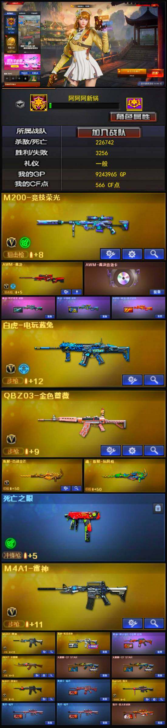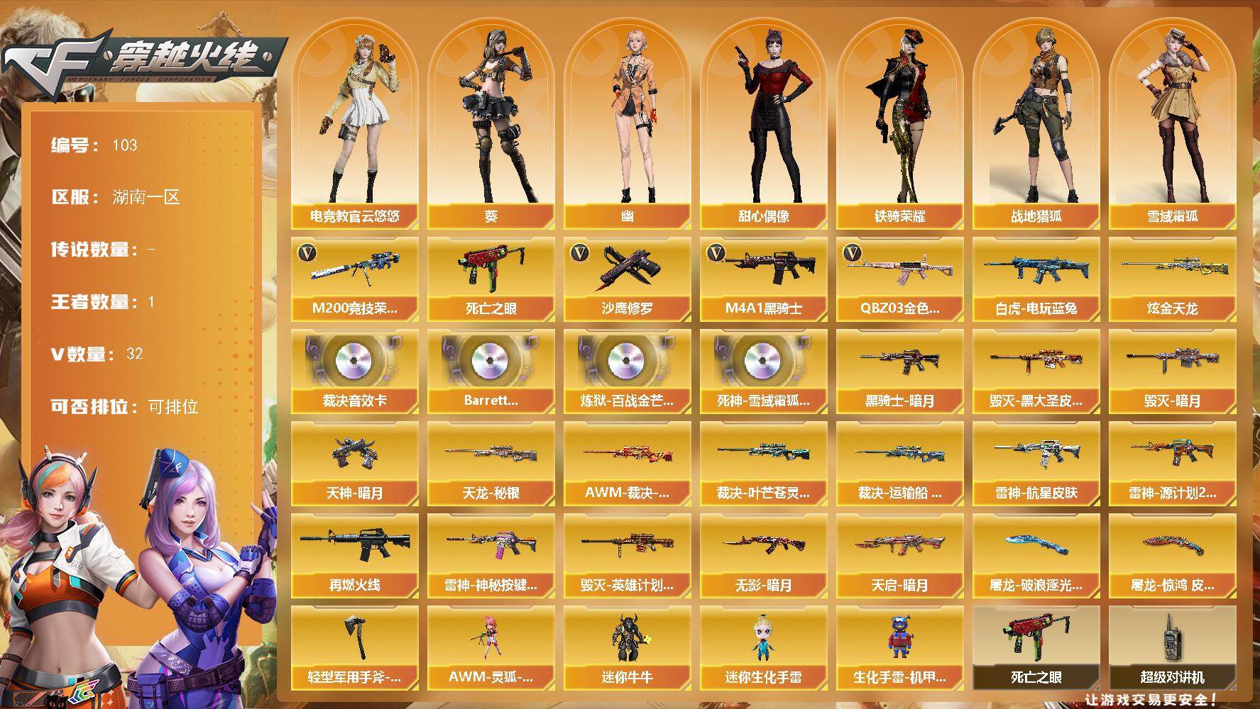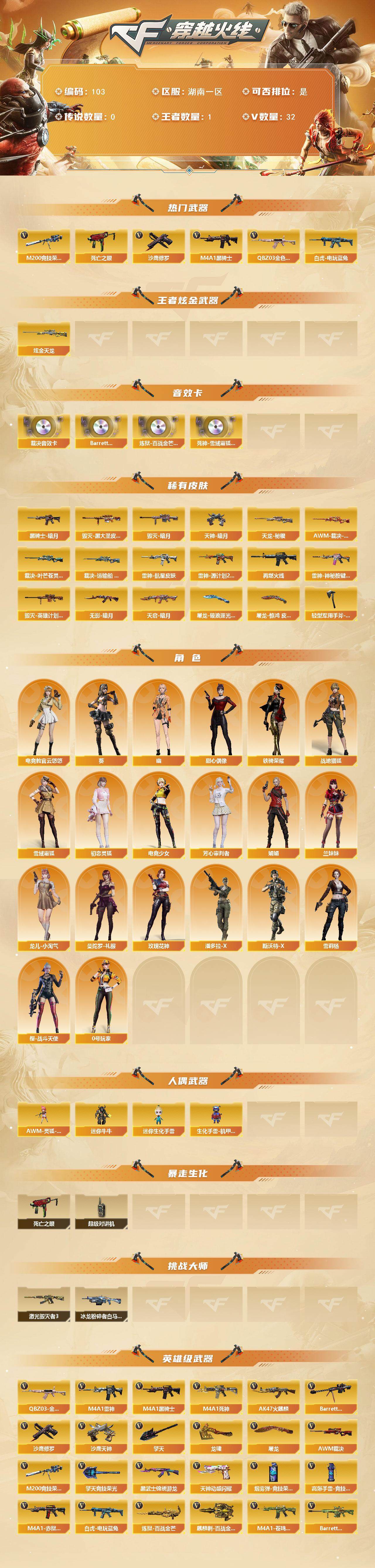 [13754506]湖南一区-32V-1王者-1炫金 【热门武器】:QBZ03-金色蔷薇,M200-竞技荣光,死亡之眼,白虎-电玩蓝兔,M4A1-黑骑士,沙鹰-修罗 【王者炫金武器】:炫金天龙 【音效卡】:AWM-裁决音效卡,Barrett-碧霄极光音效卡,炼狱-百战金芒-庆典舞曲音效卡,死神-雪域霜狐-怀旧音效卡 【皮肤】:AWM-裁决-凤灵皮肤,裁决-叶芒苍灵 皮肤,裁决-运输船 皮肤,雷神-航星皮肤,雷神-源计划2.0专属 皮肤,M4A1-再燃火线,雷神-神秘按键 皮肤,毁灭-暗月*2,毁灭-黑大圣皮肤,毁灭-英雄计划 皮肤,黑骑士-暗月,无影-暗月*2,天启-暗月,天龙-秘银,天神-暗月,屠龙-破浪逐光 皮肤,屠龙-惊鸿 皮肤,轻型军用手斧-再燃火线 【角色】:葵,电竞教官-云悠悠,战地猎狐,雪域霜狐,初恋灵狐,电竞少女,芳心审判者,娟娟,兰妹妹,0号玩家,龙儿-小淘气,曼陀罗-礼服,玫瑰花神,潘多拉-X,斯沃特-X,甜心偶像,铁骑荣耀,雪莉杨,樱-战斗天使,幽 【人偶武器】:AWM-灵狐-15周年嘉年华*3,迷你牛牛,迷你生化手雷,生化手雷-机甲核心*3 【暴走生化】:死亡之眼,超级对讲机 【挑战大师】:冰龙粉碎者-白马银枪,激光毁灭者III 【英雄级武器】:AK47-火麒麟,M4A1-雷神*2,M4A1-黑骑士,M4A1-死神,黑武士-锦绣游龙,QBZ03-金色蔷薇,白虎-电玩蓝兔,Barrett-毁灭,AWM-裁决,M200-竞技荣光,炼狱-百战金芒,沙鹰-修罗,沙鹰-天神,天神-动感闪耀,屠龙,龙啸,擎天,擎天-竞技荣光,麒麟刺-百战金芒,高爆手雷-竞技荣光*2,烟雾弹-竞技荣光,M4A1-赤狱骑士,M4A1-苍鸣雷神,Barrett-碧霄极光*2 【道具】:BS战队炫彩背包,CFS限定背包,云山科技背包,云海游龙炫彩背包,亚洲杯纪念炫彩背包,冰冰企鹅背包,战舰背包,炫彩背包,百战金芒炫彩背包,雪域霜狐炫彩背包,圣拳猎手-炽雪,女皇终结者-魔龙之吻,救世主-黑桃战神,绿色巨人,灵魂忍者*2,变异宝贝,妖姬,迷雾幽灵*2,夺命之镰,防化服*3,金色流光-枪王排位*2,星辰流光-枪王排位,枪王排位28赛季金色流光,语音特效-盛典烟火,语音特效-怀旧,雪域霜狐表情,萌萌小葵表情,斯沃特表情,CFPL选手表情-第1套,EP战队名片,EP战队喷图,EP战队击杀图标,C4-黑曜,