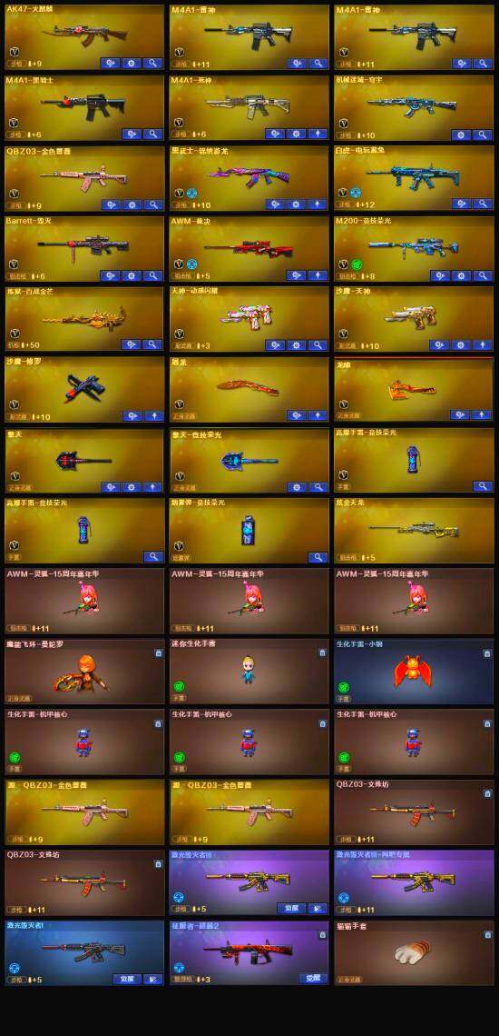 【英雄级武器】:AK47-火麒麟,M4A1-雷神*2,M4A1-黑骑士,M4A1-死神,黑武士-锦绣游龙,QBZ03-金色蔷薇,白虎-电玩蓝兔,Barrett-毁灭,AWM-裁决,M200-竞技荣光,炼狱-百战金芒,沙鹰-修罗,沙鹰-天神,天神-动感闪耀,屠龙,龙啸,擎天,擎天-竞技荣光,麒麟刺-百战金芒,高爆手雷-竞技荣光*2,烟雾弹-竞技荣光,M4A1-赤狱骑士,M4A1-苍鸣雷神,Barrett-碧霄极光*2