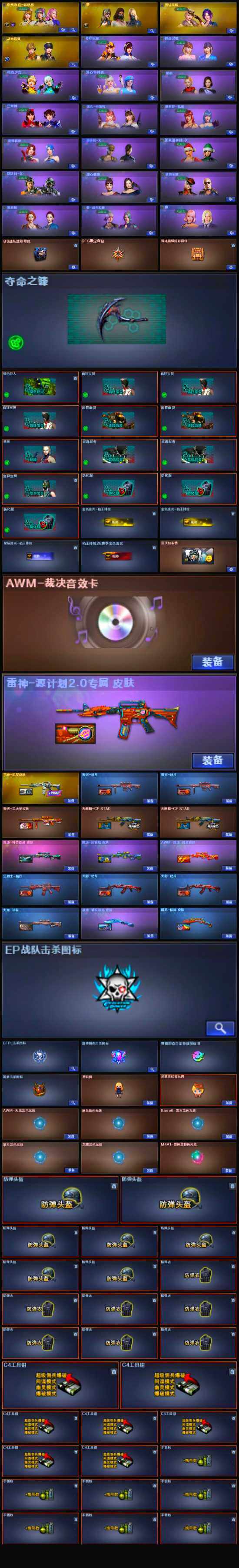 【道具】:BS战队炫彩背包,CFS限定背包,云山科技背包,云海游龙炫彩背包,亚洲杯纪念炫彩背包,冰冰企鹅背包,战舰背包,炫彩背包,百战金芒炫彩背包,雪域霜狐炫彩背包,圣拳猎手-炽雪,女皇终结者-魔龙之吻,救世主-黑桃战神,绿色巨人,灵魂忍者*2,变异宝贝,妖姬,迷雾幽灵*2,夺命之镰,防化服*3,金色流光-枪王排位*2,星辰流光-枪王排位,枪王排位28赛季金色流光,语音特效-盛典烟火,语音特效-怀旧,雪域霜狐表情,萌萌小葵表情,斯沃特表情,CFPL选手表情-第1套,EP战队名片,EP战队喷图,EP战队击杀图标,C4-黑曜,