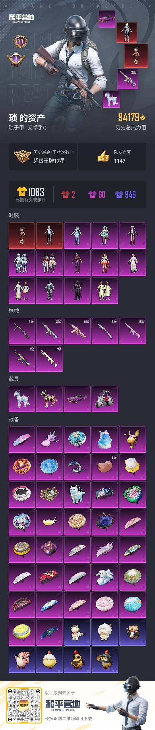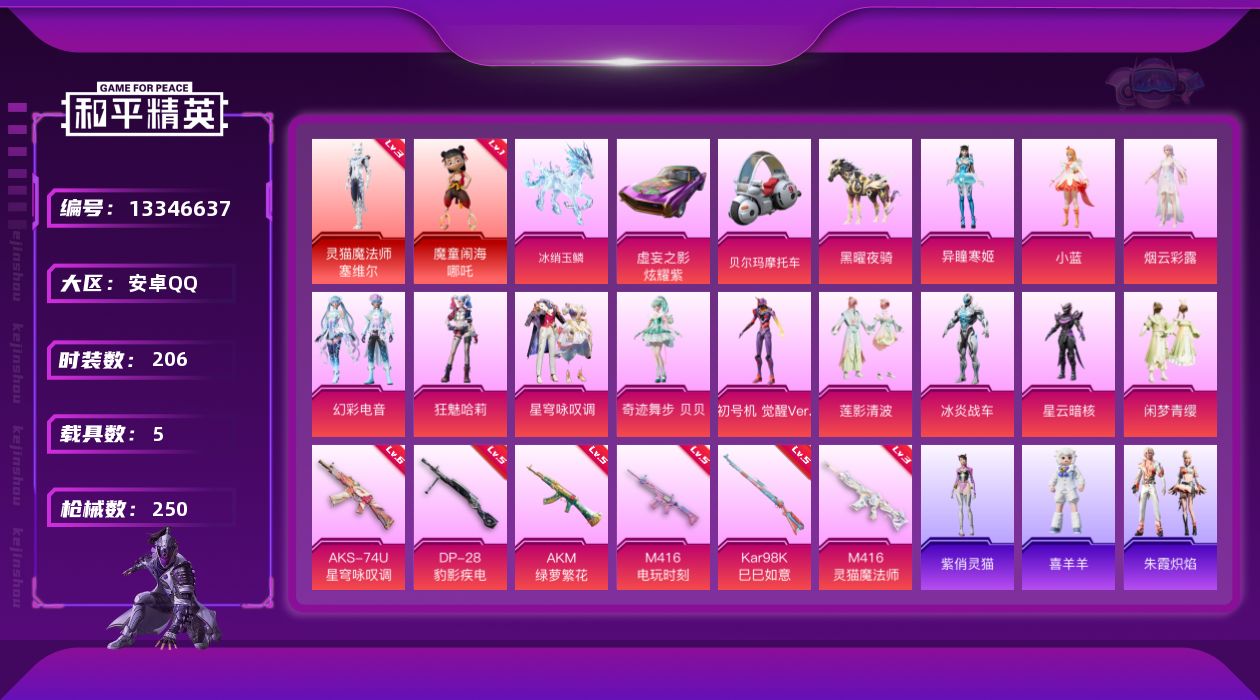 - PX_2096114- 苹果手Q-13王牌印记-11粉装-4特效枪-2载具-86535热力值-240套装-262枪皮-2卓越印记-0传奇印记 【11粉装】,初号机 觉醒Ver.,宝贝奶油派,天使彩虹糖,缤纷油彩,洛天依,星穹咏叹调,时空协奏·和音,时空协奏·回响,水曜玄武,女娲灵识,金丰海韵 【4特效枪】AKM-炫紫旋律-7级 M416-五爪金龙-7级 AUG-暖羊咩咩-5级 Kar98K-巳巳如