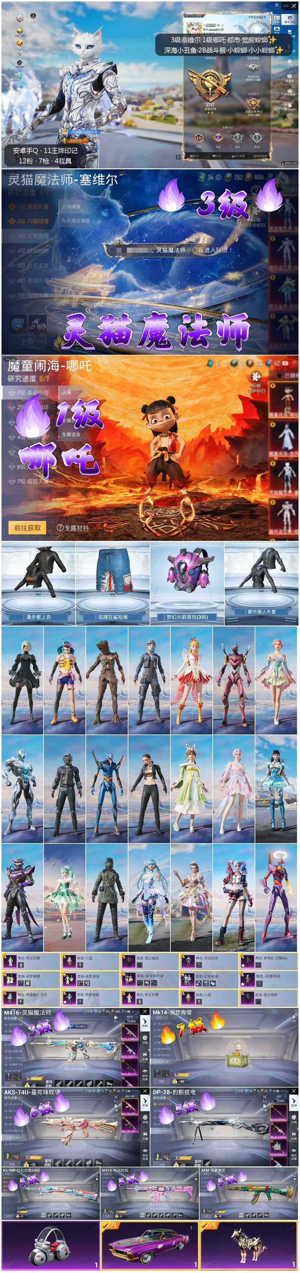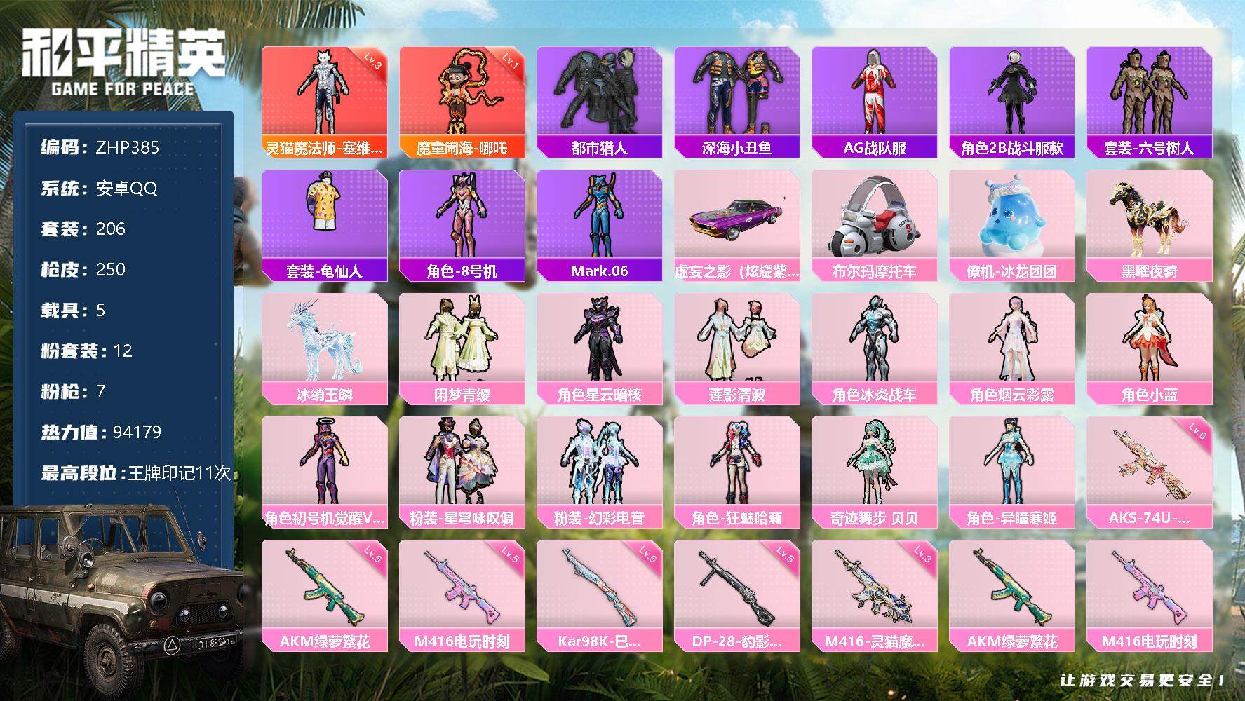 [13346637]可二次【店主推荐捡漏号!可直接换绑】/素材身法号/地铁满天赋 安卓 手Q-2神装-12粉装-7特效枪-5载具-7粉色飞行器-9.4w热力值-11王牌印记-206套装-250枪皮【红色神装等级】:魔童闹海-哪吒(一级),灵猫魔法师-塞维尔(三级)【热门品类】:套装-都市猎人,套装-深海小丑鱼,套装-AG战队服,角色-2B战斗服款,套装-六号树人,套装-龟仙人,角色-8号机,角色-Mark.06【粉色载具】:虚妄之影(炫耀紫),布尔玛摩托车,僚机-冰龙团团,黑曜夜骑,冰绡玉鳞【粉色套装】:粉装-闲梦青缨,角色-星云暗核,粉装-莲影清波,角色-冰炎战车,角色-烟云彩露,角色-小蓝,角色-初号机 觉醒Ver.,粉装-星穹咏叹调,粉装-幻彩电音,角色-狂魅哈莉,角色-奇迹舞步 贝贝,角色-异瞳寒姬【粉色枪皮等级】:AKM-绿萝繁花(五级),M416-电玩时刻(五级),M416-灵猫魔法师(三级),AKS-74U-星穹咏叹调(六级),Kar98K-巳巳如意(五级),DP-28-豹影疾电(五级)【粉色飞行器】:萌物绒绒飞行器,雀灵庇佑飞行器,灵猫魔法师飞行器,飞天猪飞行器,灵珠游龙飞行器