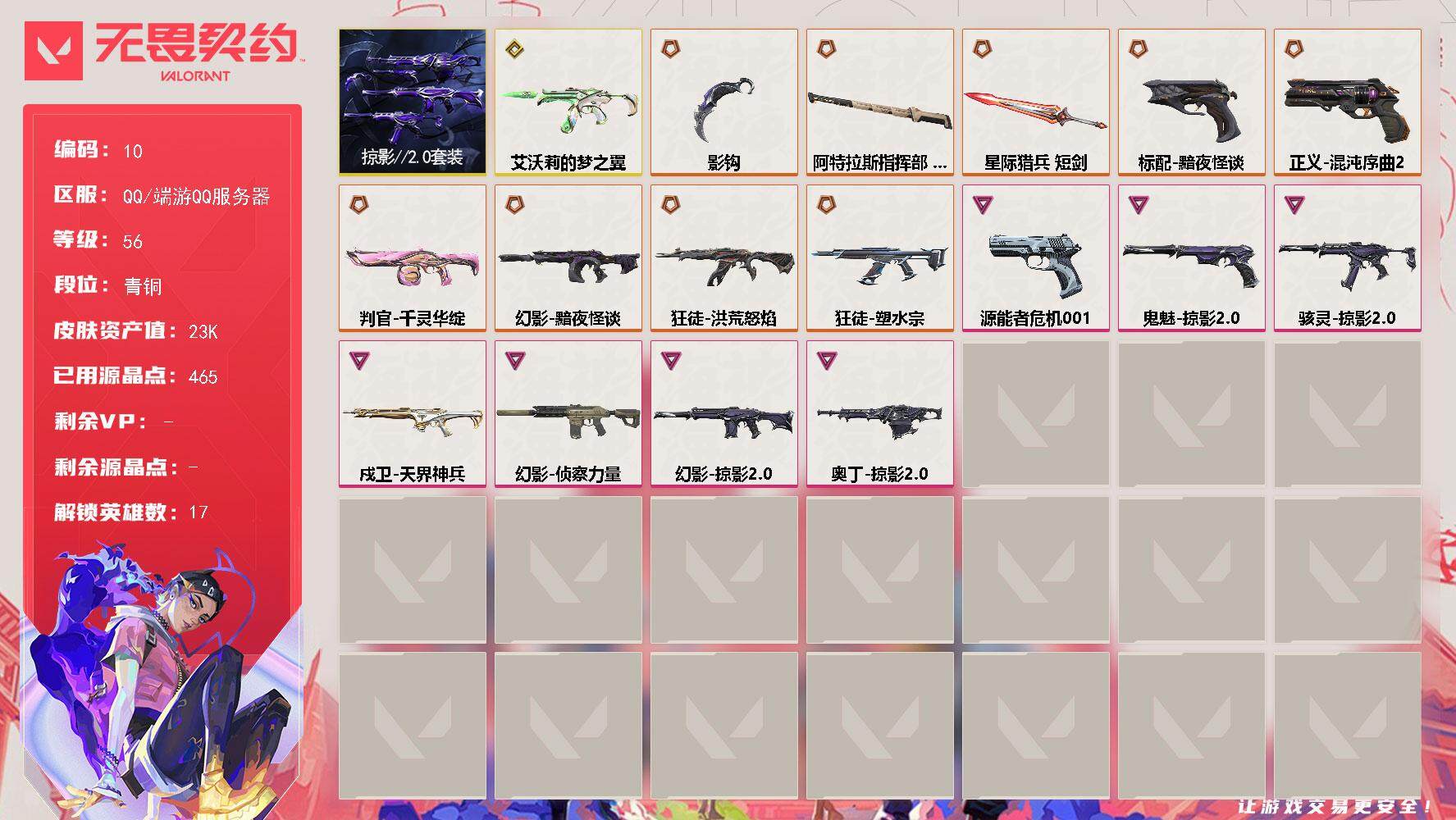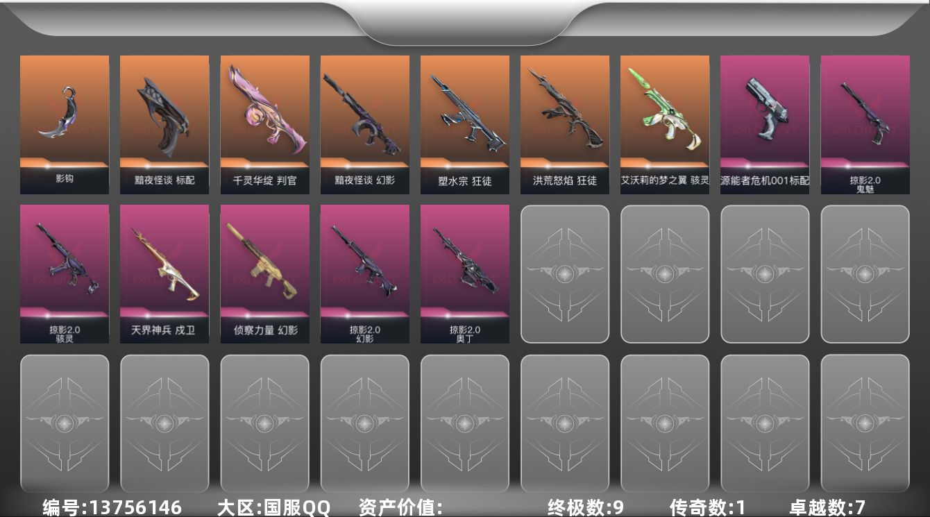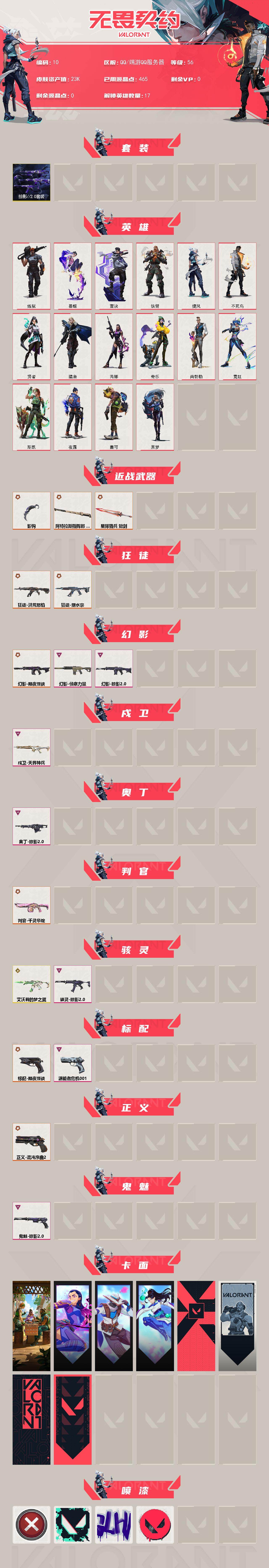 [13756146]【套装】:掠影//2.0套装 【英雄】:炼狱,暮蝶,壹决,铁臂,捷风,不死鸟,贤者,猎枭,芮娜,奇乐,尚勃勒,霓虹,斯凯,夜露,盖可,黑梦 【近战 武器】:近战武器-影钩,近战武器-阿特拉斯指挥部 甩棍,近战武器-星际猎兵 短剑 【狂徒】:狂徒-洪荒怒焰,狂徒-塑水宗 【幻影】:幻影-黯夜怪谈,幻影-侦察力量,幻影-掠影//2.0 【戍卫】:戍卫-天界神兵 【奥丁】:奥丁-掠影//2.0 【判官】:判官-千灵华绽 【骇灵】:骇灵-艾沃莉的梦之翼,骇灵-掠影//2.0 【标配】:标配-黯夜怪谈,标配-源能者危机001 【正义】:正义-混沌序曲//2.0 【鬼魅】:鬼魅-掠影//2.0 【卡面】:悠享食光 卡面,无畏契约GO!第一卷:芮娜 卡面,无畏契约GO!第一卷:零 卡面,无畏契约GO!第一卷:贤者 卡面,代号红色 卡面,新兵报到 卡面,V契约 卡面,无畏契约 卡面 【喷漆】:买装还是存钱 喷漆,胜利属于无畏契约 喷漆,GLHF 喷漆,无畏契约 喷漆 【挂饰】:薰衣草之心 挂饰,天外飞客 挂饰,《双城之战》魄罗 挂饰,无畏契约 纪念币 挂饰