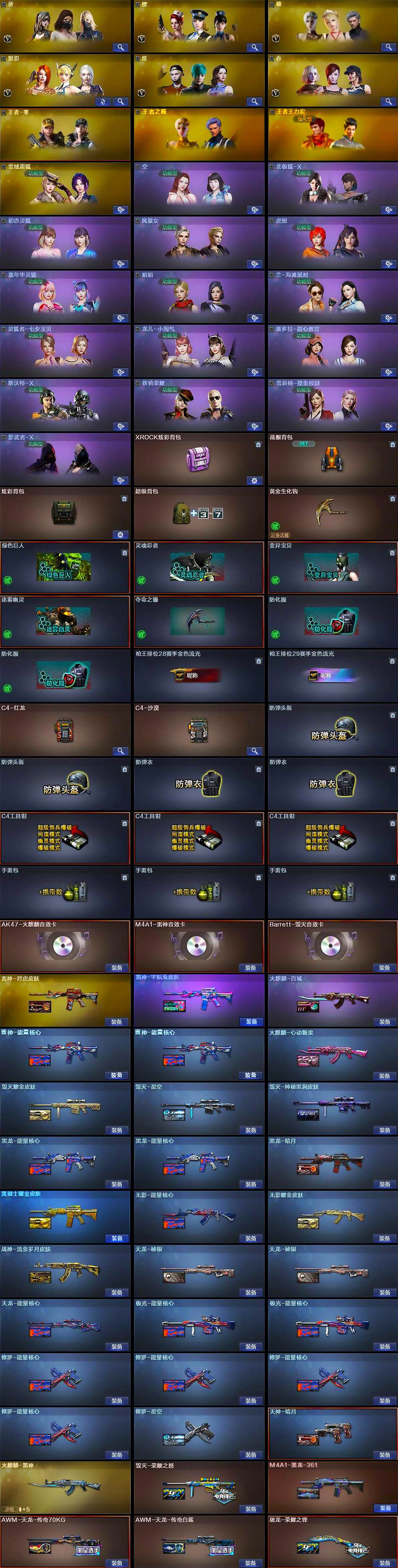 【皮肤】:雷神-能量核心*2,雷神-烈虎皮肤,雷神-宇航兔皮肤,火麒麟-雷神,火麒麟-百城,火麒麟-心动糖果,毁灭-荣耀之怒,毁灭耀金皮肤,毁灭-星空,毁灭-神秘黑洞皮肤,黑龙-能量核心*2,黑龙-暗月,M4A1-黑龙-361,黑骑士耀金皮肤,无影-能量核心,无影耀金皮肤,战神-流金岁月皮肤,AK47-B-常胜将军-孙权,天龙-秘银*2,天龙-能量核心,AWM-天龙-传奇70KG,AWM-天龙-传奇白鲨,极光-能量核心*2,修罗-能量核心*4,修罗-星空,天神-暗月,屠龙-荣耀之锋