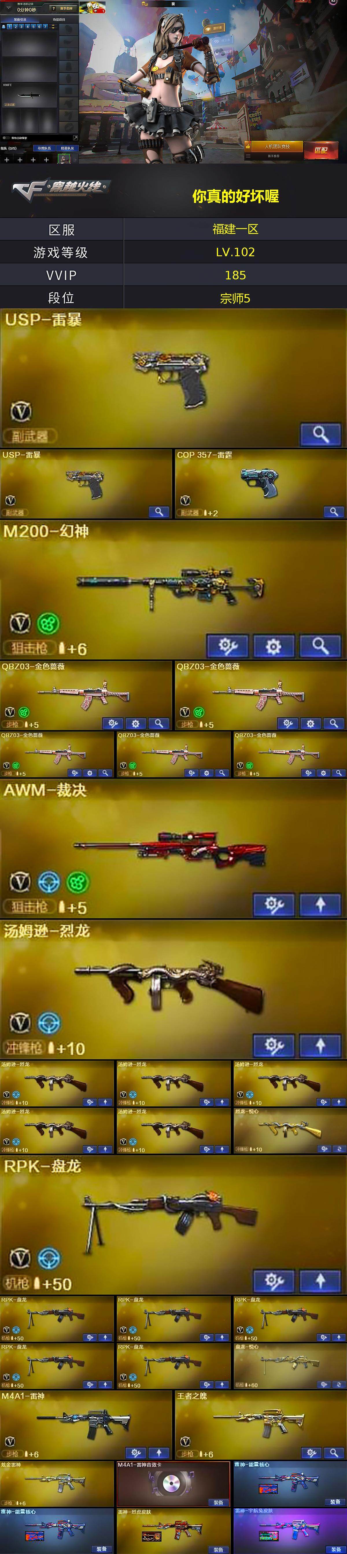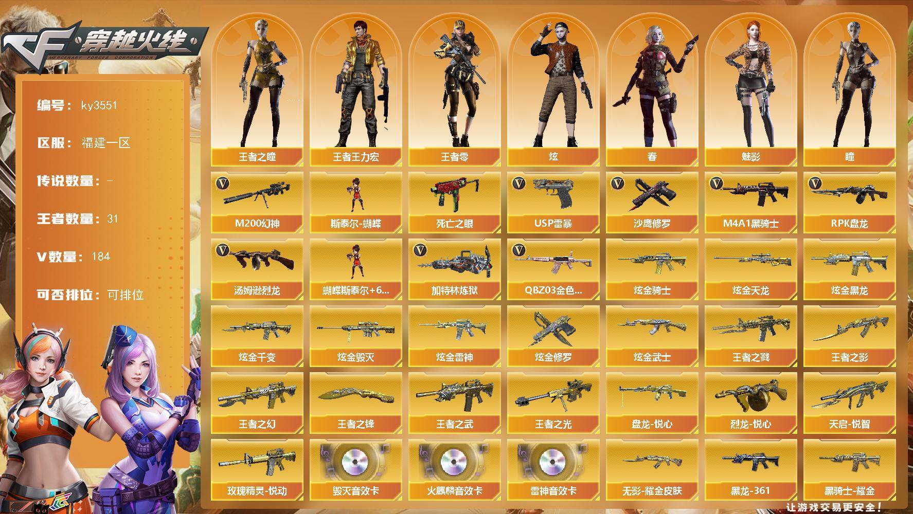 [13820604]福建一区-184V-31王者-10炫金 【热门武器】:QBZ03-金色蔷薇*5,M200-幻神,死亡之眼,M4A1-黑骑士*2,汤姆逊-烈龙*6,RPK-盘龙*6,加特林-炼狱*5,斯泰尔-蝴蝶,USP-雷暴*2,沙鹰-修罗*12 【王者炫金武器】:王者之戮*2,天启-悦智,王者之幻,王者之武,玫瑰精灵-悦动*2,王者之影,王者之光,盘龙-悦心,烈龙-悦心,王者之锋*5,炫金骑士,炫金黑龙*2,炫金千变,炫金雷神,炫金武士,炫金毁灭,炫金天龙,炫金修罗*2 【音效卡】:AK47-火麒麟音效卡,M4A1-雷神音效卡,Barrett-毁灭音效卡 【皮肤】:雷神-能量核心*2,雷神-烈虎皮肤,雷神-宇航兔皮肤,火麒麟-雷神,火麒麟-百城,火麒麟-心动糖果,毁灭-荣耀之怒,毁灭耀金皮肤,毁灭-星空,毁灭-神秘黑洞皮肤,黑龙-能量核心*2,黑龙-暗月,M4A1-黑龙-361,黑骑士耀金皮肤,无影-能量核心,无影耀金皮肤,战神-流金岁月皮肤,AK47-B-常胜将军-孙权,天龙-秘银*2,天龙-能量核心,AWM-天龙-传奇70KG,AWM-天龙-传奇白鲨,极光-能量核心*2,修罗-能量核心*4,修罗-星空,天神-暗月,屠龙-荣耀之锋 【角色】:葵,樱,瞳,魅影,炫,春,王者-零,王者之瞳,王者王力宏,狐影,雪域霜狐,空,北极狐-X,初恋灵狐,风暴女,虎妞,嘉年华灵狐,娟娟,兰-海滩派对,灵狐者-七夕宝贝,龙儿-小淘气,潘多拉-甜心教官,斯沃特-X,铁骑荣耀,雪莉杨-摸金校尉,影武者-X 【人偶武器】:M4A1-雷神-精英刀锋,斯泰尔-蝴蝶,AWM-灵狐-15周年嘉年华,M37-葵,COP-旗袍,迷你波特博士,迷你生化手雷,生化手雷-机甲核心,灵狐娃娃手雷 【暴走生化】:死亡之眼,超级对讲机 【挑战大师】:冰龙粉碎者-白马银枪,神圣爆裂者-末日III,阐释者III 【英雄级武器】:M4A1-千变,AK47-火麒麟*5,M4A1-黑龙,M4A1-雷神,M4A1-黑骑士*2,AK47-无影*3,M4A1-死神*3,AK47-黑武士*2,AK12-天启*2,AN94-超新星*4,M4A1-武圣,AK47-机械迷城*4,AK47-黑鲨*2,M4A1-龙血*4,M4A1-雷霆,AK47-雷暴,无影-神兵利器,M4A1-玫瑰精灵,QBZ03-金色蔷薇*5,M4A1-猎神,王者之心-觉醒版,王