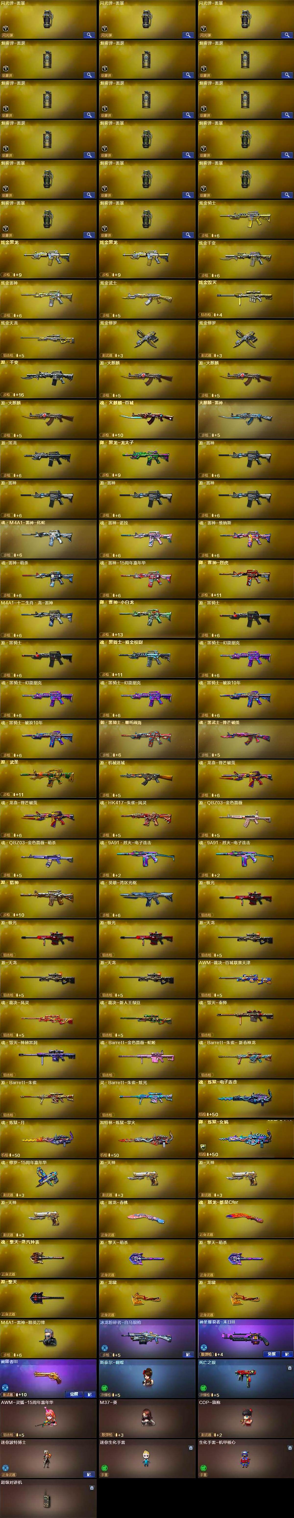 【英雄级武器】:M4A1-千变,AK47-火麒麟*5,M4A1-黑龙,M4A1-雷神,M4A1-黑骑士*2,AK47-无影*3,M4A1-死神*3,AK47-黑武士*2,AK12-天启*2,AN94-超新星*4,M4A1-武圣,AK47-机械迷城*4,AK47-黑鲨*2,M4A1-龙血*4,M4A1-雷霆,AK47-雷暴,无影-神兵利器,M4A1-玫瑰精灵,QBZ03-金色蔷薇*5,M4A1-猎神,王者之心-觉醒版,王