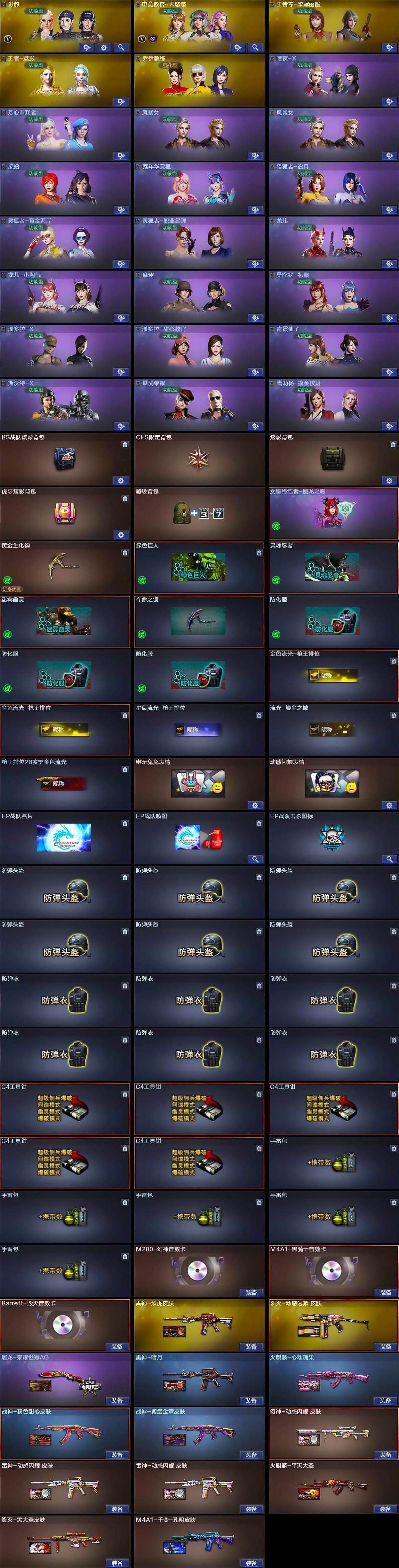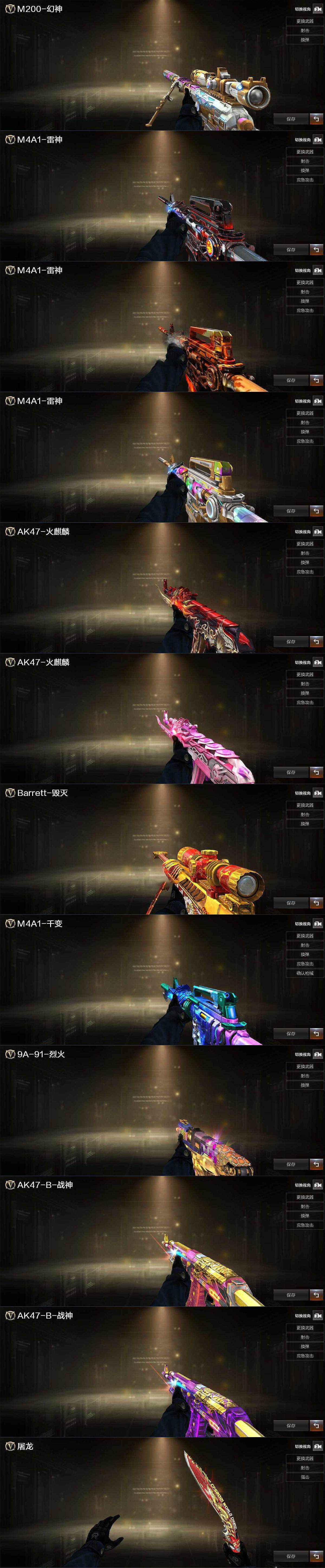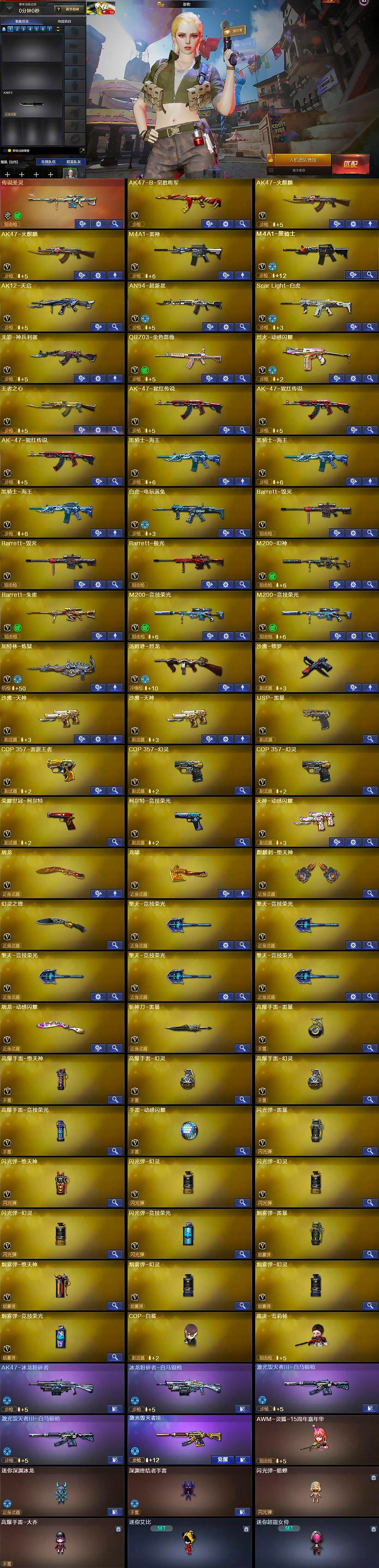 【英雄级武器】:AK47-火麒麟*2,M4A1-雷神,M4A1-黑骑士,AK12-天启,AN94-超新星,Scar Light-白虎,无影-神兵利器,QBZ03-金色蔷薇,烈火-动感闪耀,王者之心-觉醒版,AK-47-猩红传说*3,黑骑士-海王*3,AK47-B-常胜将军,白虎-电玩蓝兔,Barrett-毁灭*2,Barrett-极光,M200-幻神,Barrett-朱雀,M200-竞技荣光*2,加特林-炼狱,汤姆逊-烈龙,沙鹰-修罗,沙鹰-天神*2,USP-雷暴,COP 357-雷霆王者-觉醒版,COP 357-幻灵*2,荣耀世冠-柯尔特,柯尔特-竞技荣光,天神-动感闪耀,屠龙,龙啸,麒麟刺-堕天神,幻灵之锋,擎天-竞技荣光*5,屠龙-动感闪耀,斩神刀-雷暴,高爆手雷-雷暴,高爆手雷-