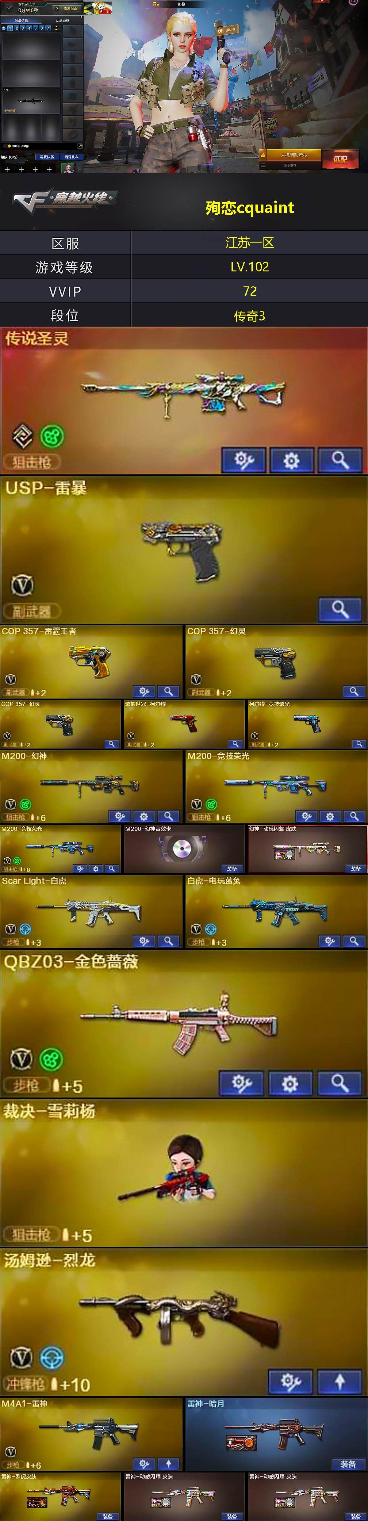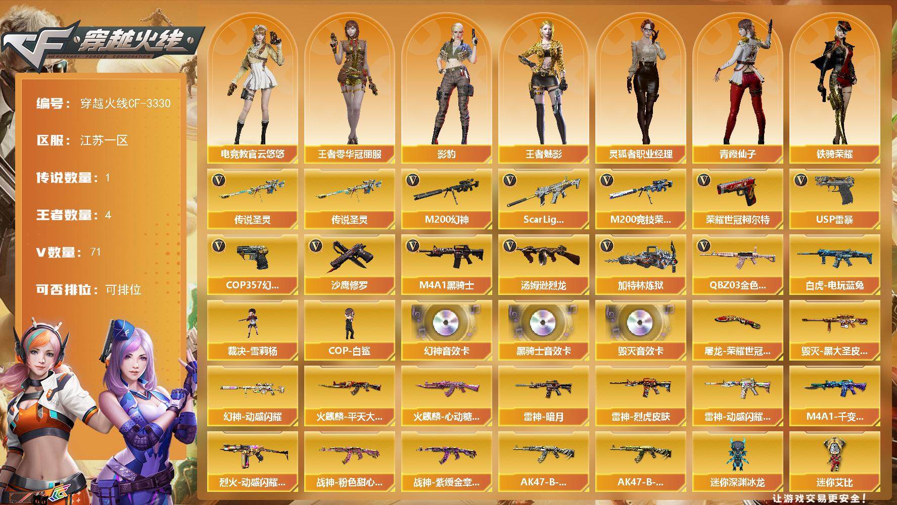 [13654518]江苏一区-71V-4王者-0炫金 【传说武器】:传说圣灵 【热门武器】:传说圣灵,QBZ03-金色蔷薇,Scar Light-白虎,M200-幻神,M200-竞技荣光*2,白虎-电玩蓝兔,荣耀世冠-柯尔特,M4A1-黑骑士,汤姆逊-烈龙,加特林-炼狱,裁决-雪莉杨,COP-白鲨,USP-雷暴,COP 357-幻灵*2,沙鹰-修罗 【音效卡】:M200-幻神音效卡,M4A1-黑骑士音效卡,Barrett-毁灭音效卡 【皮肤】:幻神-动感闪耀 皮肤,雷神-暗月,雷神-烈虎皮肤,雷神-动感闪耀 皮肤*2,火麒麟-平天大圣,火麒麟-心动糖果,毁灭-黑大圣皮肤,M4A1-千变-孔明皮肤,烈火-动感闪耀 皮肤,战神-粉色甜心皮肤,战神-紫绶金章皮肤,AK47-B-常胜将军-刘备*2,AK47-B-常胜将军-孙权*6,屠龙-荣耀世冠AG 【角色】:影豹,电竞教官-云悠悠,王者零-华冠丽服,王者-魅影,乔伊教练,暗夜-X,芳心审判者,风暴女*2,虎妞,嘉年华灵狐,猎狐者-追月,灵狐者-黄金海岸,灵狐者-职业经理,龙儿,龙儿-小淘气,麻雀,曼陀罗-礼服,潘多拉-X,潘多拉-甜心教官,邱刚敖,青霞仙子,斯沃特-X,铁骑荣耀,雪莉杨-摸金校尉 【人偶武器】:COP-白鲨,裁决-雪莉杨,AWM-灵狐-15周年嘉年华,迷你深渊冰龙,深渊终结者手雷,闪光弹-貂蝉,高爆手雷-大乔,迷你艾比,迷你超能女侍 【挑战大师】:AK47-冰龙粉碎者,冰龙粉碎者-白马银枪,激光毁灭者III-白马银枪*2,激光毁灭者III 【英雄级武器】:AK47-火麒麟*2,M4A1-雷神,M4A1-黑骑士,AK12-天启,AN94-超新星,Scar Light-白虎,无影-神兵利器,QBZ03-金色蔷薇,烈火-动感闪耀,王者之心-觉醒版,AK-47-猩红传说*3,黑骑士-海王*3,AK47-B-常胜将军,白虎-电玩蓝兔,Barrett-毁灭*2,Barrett-极光,M200-幻神,Barrett-朱雀,M200-竞技荣光*2,加特林-炼狱,汤姆逊-烈龙,沙鹰-修罗,沙鹰-天神*2,USP-雷暴,COP 357-雷霆王者-觉醒版,COP 357-幻灵*2,荣耀世冠-柯尔特,柯尔特-竞技荣光,天神-动感闪耀,屠龙,龙啸,麒麟刺-堕天神,幻灵之锋,擎天-竞技荣光*5,屠龙-动感闪耀,斩神刀-雷暴,高爆手雷-雷暴,高爆手雷-