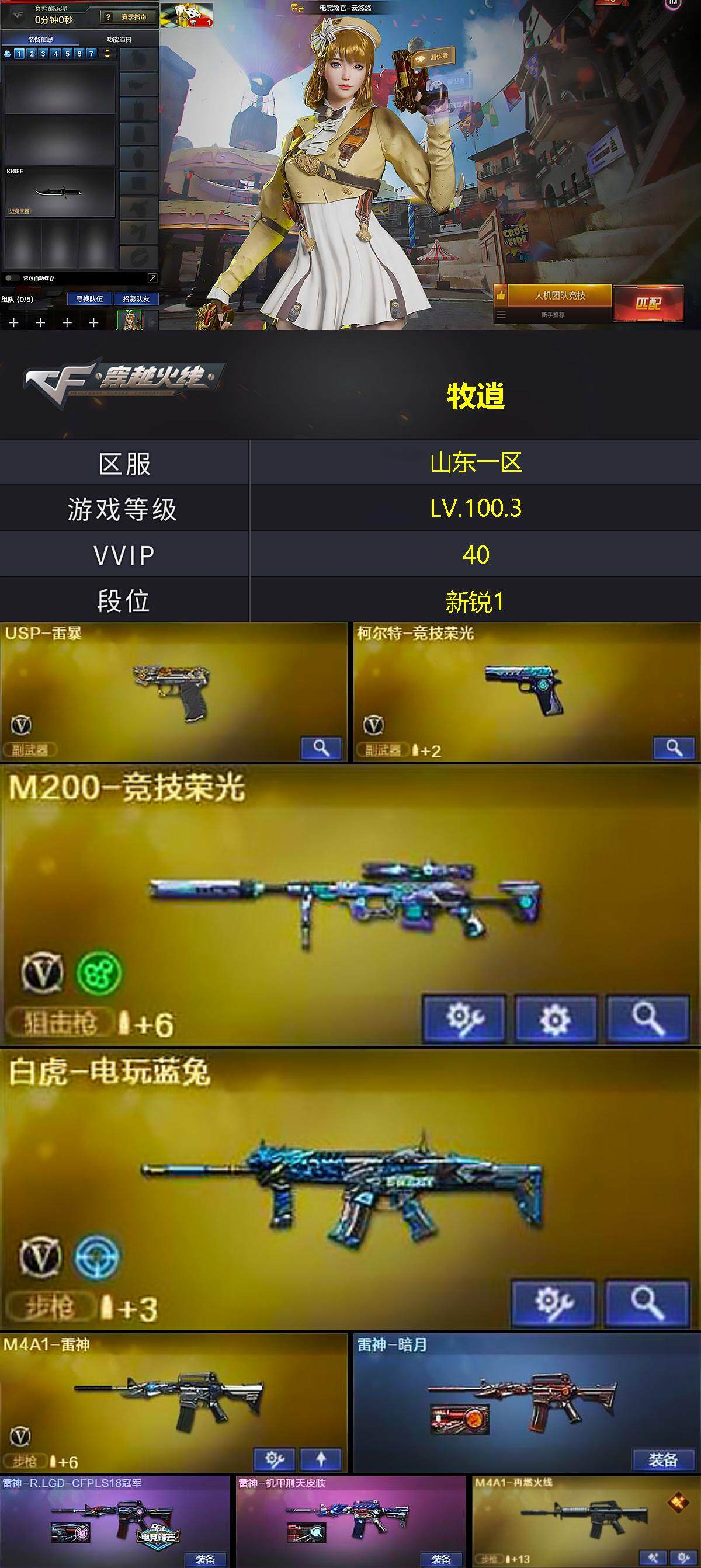 [13757386]山东一区-40V-0王者-0炫金 【热门武器】:M200-竞技荣光,死亡之眼,白虎-电玩蓝兔,USP-雷暴,沙鹰-修罗 【音效卡】:Barrett-碧霄极光音效卡*2,炼狱-百战金芒-庆典舞曲音效卡,沙鹰-修罗-盛典舞曲音效卡,AWM-昌龙-怀旧音效卡 【皮肤】:雷神-暗月,雷神-R.LGD-CFPLS18冠军,雷神-机甲刑天皮肤,M4A1-再燃火线,火麒麟-雷神,火麒麟-平天大圣,火麒麟-心动糖果,毁灭-暗月,毁灭耀金皮肤,毁灭-黑大圣皮肤,黑骑士-暗月*2,战神-粉色甜心皮肤,战神-流金岁月皮肤,修罗-百战金芒 皮肤,轻型军用手斧-再燃火线 【角色】:电竞教官-云悠悠,战地猎狐,乔伊教练,暗夜-X,初恋灵狐,芳心审判者,风暴女*2,虎妞,嘉年华灵狐,灵狐-花神,灵狐者-X,麻雀,曼陀罗-X,潘多拉-X,蛇姬,斯沃特-X,蜀雪,兔囡囡,维纳斯,樱-战斗天使 【人偶武器】:火麒麟-灵狐,AWM-灵狐-15周年嘉年华*2,海滩汪汪-巴雷特,迷你深渊冰龙,迷你波特博士*6,生化手雷-机甲核心,迷你超能女侍 【暴走生化】:死亡之眼,超级对讲机 【挑战大师】:冰龙粉碎者-白马银枪,激光毁灭者III-白马银枪*2,试炼破坏者III 【英雄级武器】:AK47-火麒麟*2,M4A1-雷神,无影-神兵利器,M4A1-玫瑰精灵,AK-47-猩红传说*2,AK47-B-战神,黑骑士-海王,白虎-电玩蓝兔,Barrett-毁灭,Barrett-朱雀,M200-竞技荣光,炼狱-百战金芒,沙鹰-修罗,USP-雷暴,柯尔特-竞技荣光,屠龙,擎天-竞技荣光,麒麟刺-百战金芒,高爆手雷-竞技荣光*5,闪光弹-竞技荣光*5,烟雾弹-竞技荣光*4,M4A1-赤狱骑士,Barrett-碧霄极光 【道具】:BS战队炫彩背包,CFS限定背包,R.LGD炫彩背包,XROCK炫彩背包,云山科技背包,亚洲杯纪念炫彩背包,炫彩背包-诺拉,百战金芒炫彩背包,背包-洛丽塔,虎牙炫彩背包,超级背包,女皇终结者-魔龙之吻,救世主-黑桃战神,绿色巨人,灵魂忍者*3,变异宝贝,妖姬,迷雾幽灵*2,夺命之镰,防化服*3,金色流光-枪王排位,流光-鎏金之域,流光-再燃火线,枪王排位29赛季金色流光,语音特效-盛典烟火,萌萌小葵表情,电玩兔兔表情,C4-再燃火线,防弹头盔*9,防弹衣*9,C4工具钳*9,手雷包*9 【特殊枪械】: