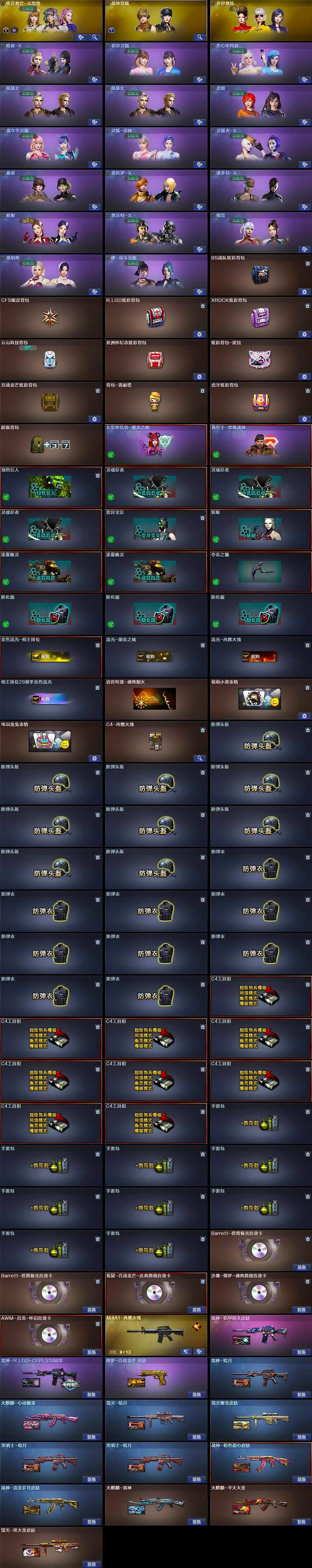 【道具】:BS战队炫彩背包,CFS限定背包,R.LGD炫彩背包,XROCK炫彩背包,云山科技背包,亚洲杯纪念炫彩背包,炫彩背包-诺拉,百战金芒炫彩背包,背包-洛丽塔,虎牙炫彩背包,超级背包,女皇终结者-魔龙之吻,救世主-黑桃战神,绿色巨人,灵魂忍者*3,变异宝贝,妖姬,迷雾幽灵*2,夺命之镰,防化服*3,金色流光-枪王排位,流光-鎏金之域,流光-再燃火线,枪王排位29赛季金色流光,语音特效-盛典烟火,萌萌小葵表情,电玩兔兔表情,C4-再燃火线,防弹头盔*9,防弹衣*9,C4工具钳*9,手雷包*9