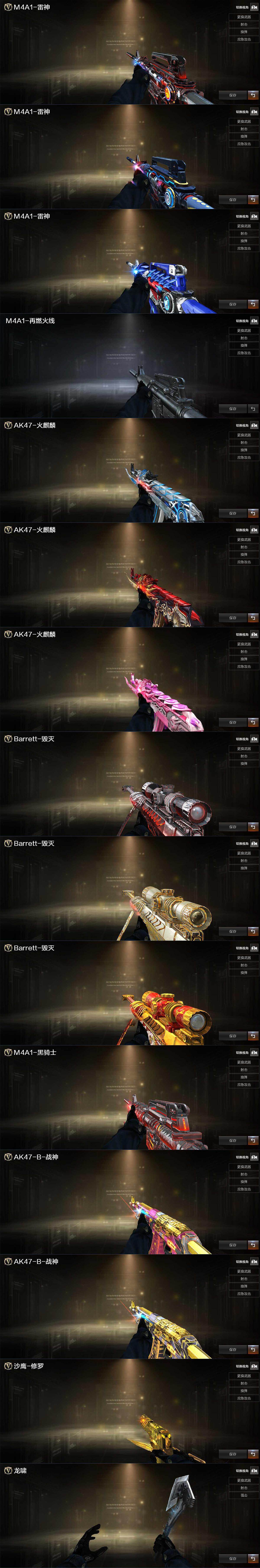 【英雄级武器】:AK47-火麒麟*2,M4A1-雷神,无影-神兵利器,M4A1-玫瑰精灵,AK-47-猩红传说*2,AK47-B-战神,黑骑士-海王,白虎-电玩蓝兔,Barrett-毁灭,Barrett-朱雀,M200-竞技荣光,炼狱-百战金芒,沙鹰-修罗,USP-雷暴,柯尔特-竞技荣光,屠龙,擎天-竞技荣光,麒麟刺-百战金芒,高爆手雷-竞技荣光*5,闪光弹-竞技荣光*5,烟雾弹-竞技荣光*4,M4A1-赤狱骑士,Barrett-碧霄极光