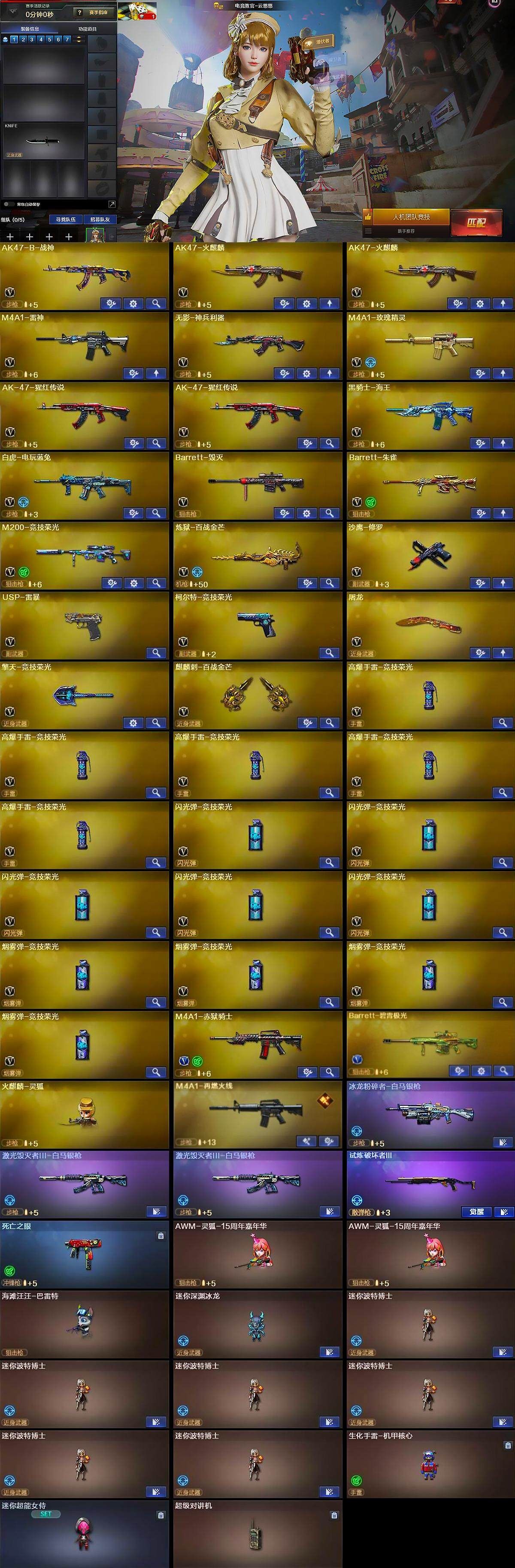 - [12321329]3粉装 10特效枪 2载具 5印记 可二次 可修改实名 优质装备:帕加尼imola(艺术银),M249彩虹甜喵(M249-彩虹甜喵),AKM绿萝繁花,SCAR-L-锦绣绵绵,M416电玩时刻,M762-青锋波束,GROZA-镜光银凌,樱桃泡泡,MK14-樱桃泡泡,羊梦糖心,Kar98K-巳巳如意 热门装扮:蜜语绒猫 载具:冰绡玉鳞 稀有枪皮:SCAR-L-魔童闹海 哪吒,DP-28-豹影疾电 五级特效枪:五级M762-青锋波束,五级GROZA-镜光银凌,五级Kar98K-巳巳如意,五级M416-电玩时刻,五级SCAR-L-锦绣绵绵,五级AKM-绿萝繁花 四级特效枪:四级DP-28-豹影疾电,四级MK14-樱桃泡泡,四级M249-彩虹甜喵 三级特效枪:三级SCAR-L-魔童闹海 哪吒 紫色装扮:SS23特训,SS31特训套装,雪绒豹,SS33特训套装,青涩时光,SS21特训,田园牧歌,轻风白浪,SS22特训,吉莉礼服,幻世战舞者,幻影武者,冰川特警,萌趣咩咩,娇憨猪猪,星辰守护者,SS16特训,SS17特训,SS14特训,SS15特训,SS20特训,醇脆可可,甜心亚梦,虚音幻奏,SS18特训,SS19特训,魅力单车,麻辣教官,黄色伏地魔,黄色运动,龙的传人,龟仙人,冰河战士,龙魂突击队,蝶变,霓虹街区,都市漫游者,酒红色名流,长空猛禽,绛羽幽主,湖蓝色名流,灰色格斗者,牛气冲天,牛气满满,海岛探路者,柠萌假日,竞技达人朋克,缤纷果语,耀眼新星,蓝彩潮人,虎虎生威吉莉,特殊使命,特训学院,王牌教练,甜蜜告白,空岛之星,疯狂小兔子,破晓战魂,破蛋小黄鸡,福星高照,萝兰蝴蝶,SS29特训,雏菊兔兔,SS28特训,湖畔霞光,鱼渊荷华,玉兔迎春,燕燕于飞,巳巳如意,海琴烟,竞技名士,惊鸿侠骨,SS24特训(SS24特训套装),SS25特训,元气发射,锦衣飞扬,冰公主,SS27特训,菲菲,焰鹰斗篷,幻羽潜行,幽夜迷踪,晨曦薄雾,SS26特训,春光漫游,快闪甜心,贝斯之夜,智慧之神,风华少年志,SS12特训,SS13特训,耀粉歌者,SS32特训服(SS32特训套装),青玉碎影,蓝冰羽,绯格组合,萌黄之夏,紫幽梦,蜜桃派对,新风雅兰,银月精灵 优质战备:圣堂之誓降落伞,精灵梦叶罗丽降落伞,电糖天使降落伞,忍者神龟降落伞,圣斗士星矢降落伞,喜羊羊与灰太狼降落伞,飞天猪飞行器,鬼刀降落伞