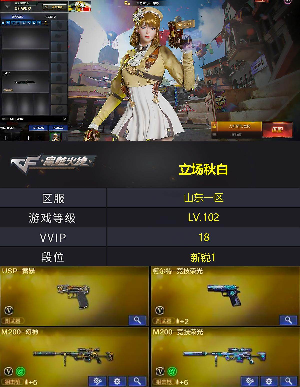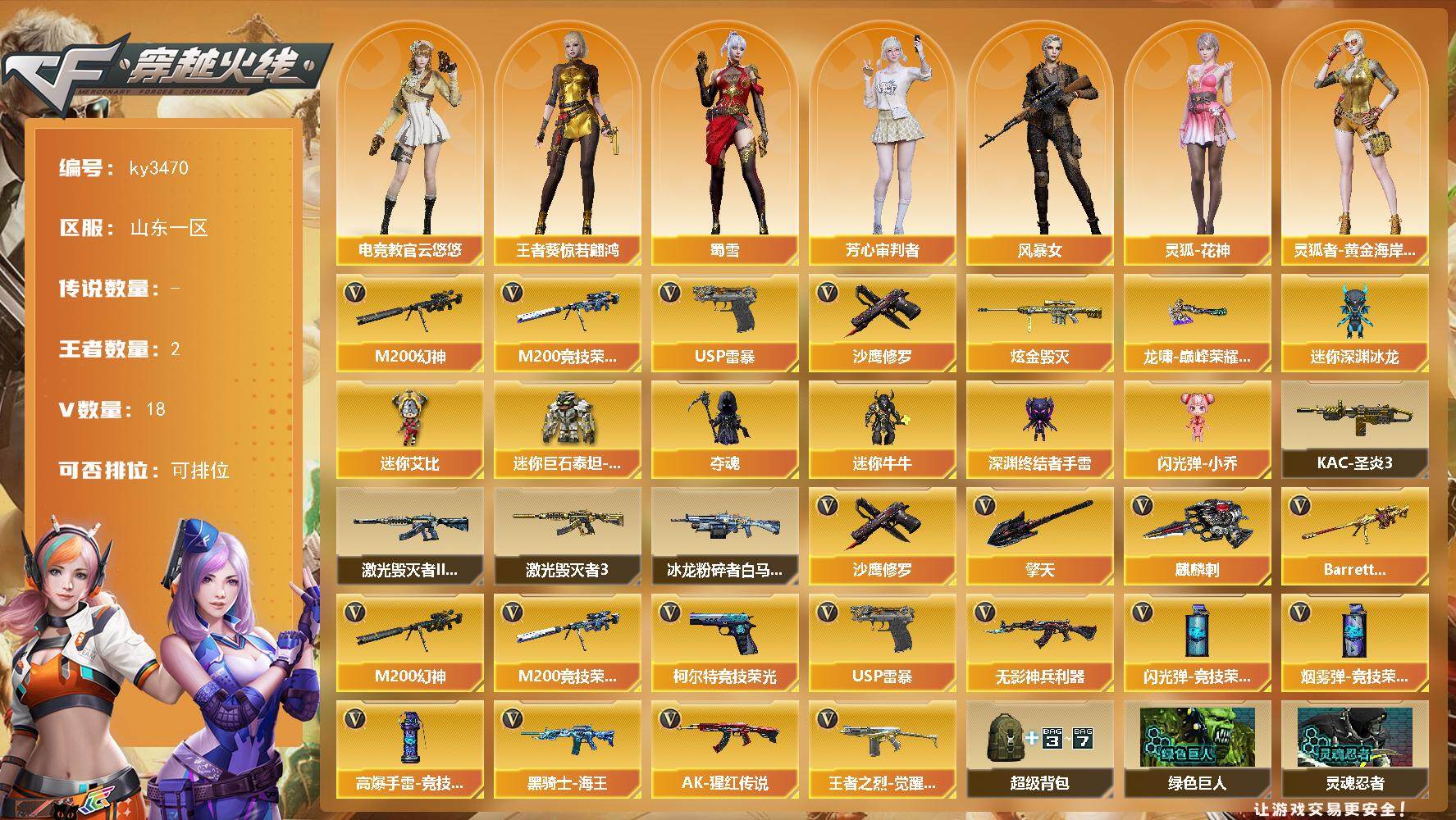[13655318]山东一区-18V-2王者-1炫金 【热门武器】:M200-幻神,M200-竞技荣光,USP-雷暴,沙鹰-修罗 【王者炫金武器】:炫金毁灭 【皮肤】:龙啸-巅峰荣耀 皮肤 【角色】:电竞教官-云悠悠,王者葵-惊若翩鸿,芳心审判者,风暴女,灵狐-花神,灵狐者-黄金海岸,灵狐者-七夕宝贝,龙儿,龙儿-小淘气,玫瑰花神,潘多拉-X,潘多拉-甜心教官,蜀雪,兔囡囡,樱-战斗天使 【人偶武器】:迷你深渊冰龙,夺魂*2,迷你牛牛,深渊终结者手雷,闪光弹-小乔,迷你艾比,迷你巨石泰坦-魔花研究所 【挑战大师】:冰龙粉碎者-白马银枪,激光毁灭者III-白马银枪,激光毁灭者III,KAC-圣炎切割者III 【英雄级武器】:无影-神兵利器,AK-47-猩红传说,黑骑士-海王*2,王者之烈-觉醒版,M200-幻神,Barrett-朱雀,M200-竞技荣光,沙鹰-修罗,USP-雷暴,柯尔特-竞技荣光,擎天,麒麟刺,高爆手雷-竞技荣光,闪光弹-竞技荣光,烟雾弹-竞技荣光*2 【道具】:超级背包,绿色巨人,灵魂忍者,迷雾幽灵,夺命之镰,防化服*2,金色流光-枪王排位,星辰流光-枪王排位,巅峰赛先锋-金色流光,枪王排位28赛季金色流光,枪王排位29赛季金色流光,防弹头盔*5,防弹衣*5,C4工具钳*5,手雷包*6 【特殊枪械】:
