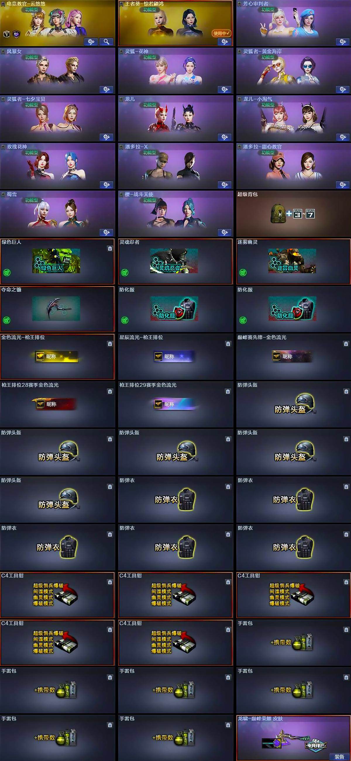 【道具】:超级背包,绿色巨人,灵魂忍者,迷雾幽灵,夺命之镰,防化服*2,金色流光-枪王排位,星辰流光-枪王排位,巅峰赛先锋-金色流光,枪王排位28赛季金色流光,枪王排位29赛季金色流光,防弹头盔*5,防弹衣*5,C4工具钳*5,手雷包*6
