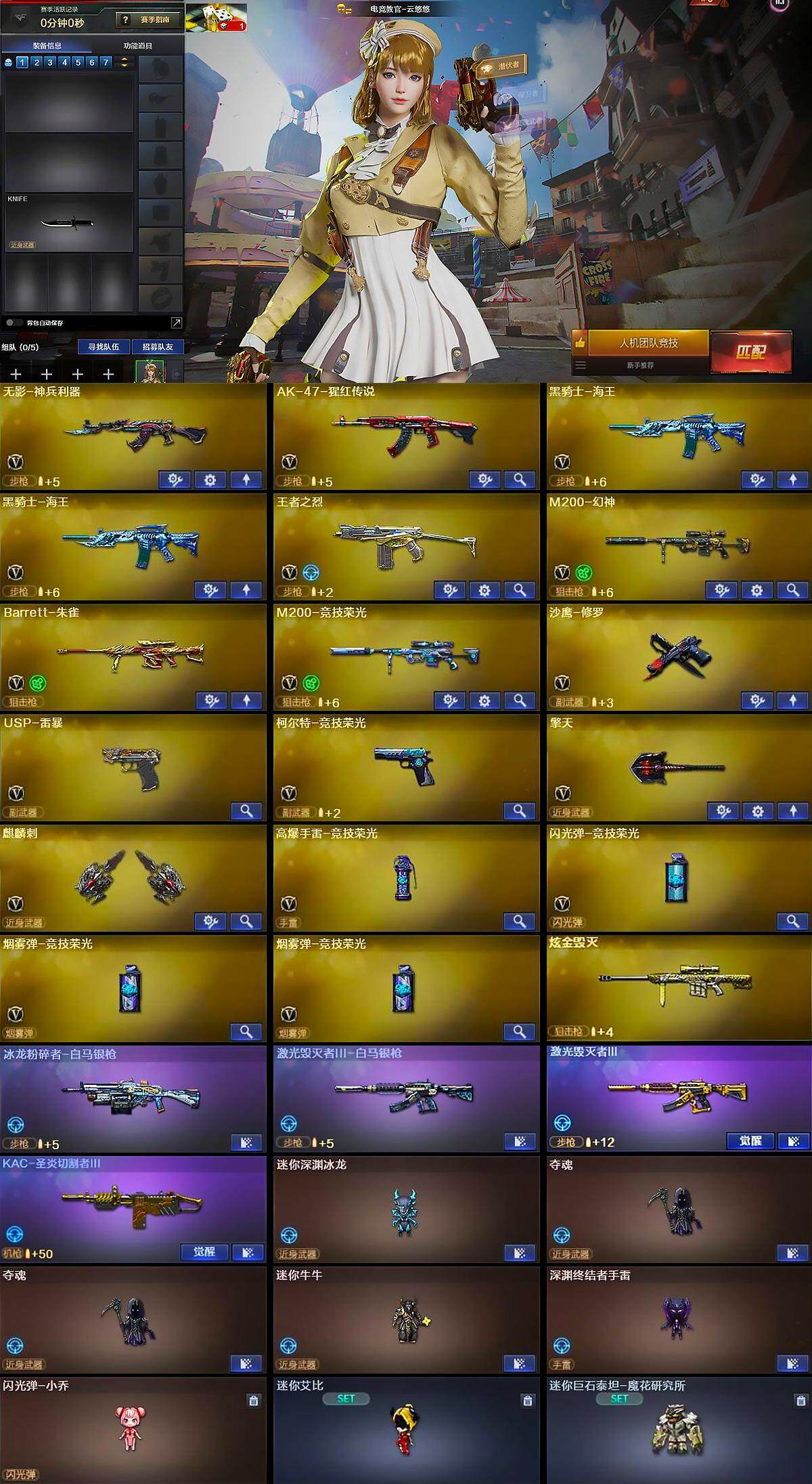 【英雄级武器】:无影-神兵利器,AK-47-猩红传说,黑骑士-海王*2,王者之烈-觉醒版,M200-幻神,Barrett-朱雀,M200-竞技荣光,沙鹰-修罗,USP-雷暴,柯尔特-竞技荣光,擎天,麒麟刺,高爆手雷-竞技荣光,闪光弹-竞技荣光,烟雾弹-竞技荣光*2