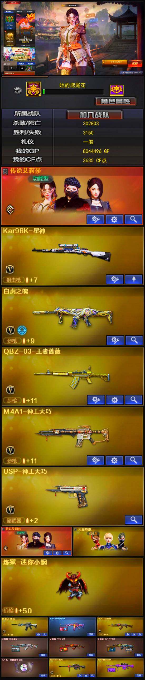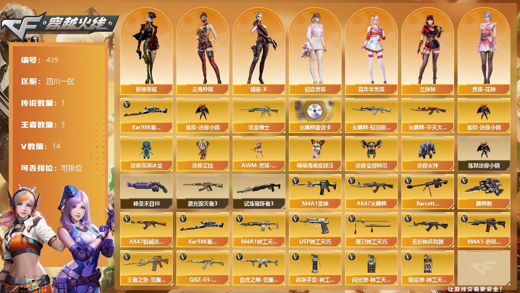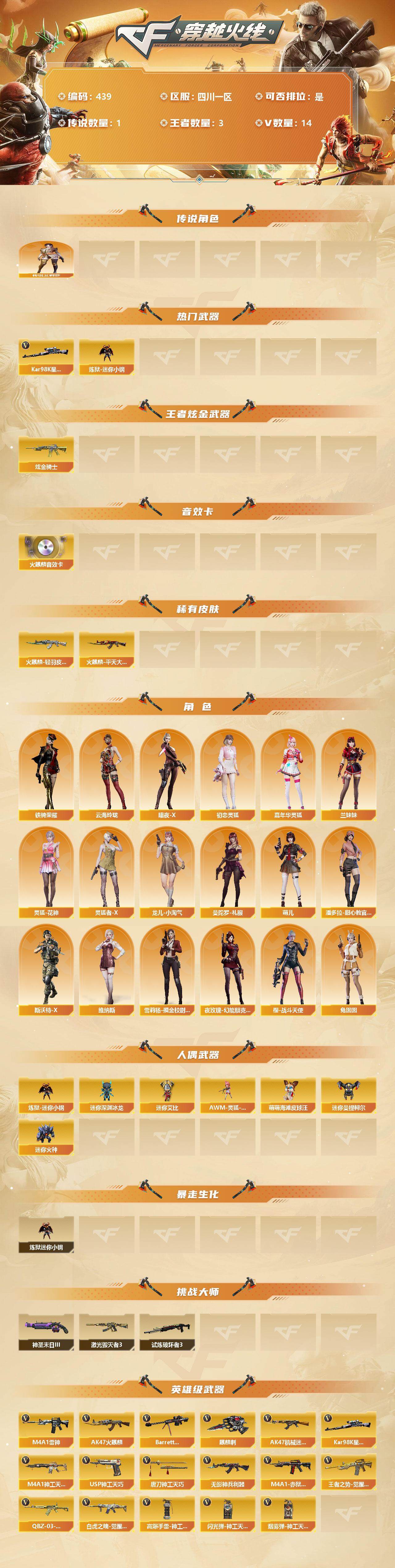 [13162012]四川一区-14V-3王者-1炫金 【传说角色】:传说艾莉莎 【热门武器】:Kar98K-星神,炼狱-迷你小钢 【王者炫金武器】:炫金骑士 【音效卡】:AK47-火麒麟音效卡 【皮肤】:雷神-维纳斯皮肤,火麒麟-轻羽皮肤,火麒麟-平天大圣,毁灭-魔灵皮肤,毁灭-黑曼巴 皮肤,M4A1-千变-孔明皮肤,无影-神兵利器 皮肤,麒麟刺-甜蜜糖果 皮肤,麒麟刺-萌杀皮肤 【角色】:云海玲珑,暗夜-X,初恋灵狐,嘉年华灵狐,兰妹妹,灵狐-花神,灵狐者-X,龙儿-小淘气,曼陀罗-礼服,萌儿,潘多拉-甜心教官,斯沃特-X,铁骑荣耀,兔囡囡,维纳斯,雪莉杨-摸金校尉,夜玫瑰-幻能朋克,樱-战斗天使 【人偶武器】:炼狱-迷你小钢,AWM-灵狐-15周年嘉年华,迷你艾比,迷你深渊冰龙,萌萌海滩皮球汪,迷你曼提柯尔,迷你火种 【暴走生化】:炼狱-迷你小钢 【挑战大师】:激光毁灭者III,试炼破坏者III,神圣爆裂者-末日III 【英雄级武器】:AK47-火麒麟,M4A1-雷神,AK47-机械迷城,M4A1-神工天巧,无影-神兵利器,王者之势-觉醒版,QBZ-03-王者蔷薇-觉醒版,白虎之魄-觉醒版,Barrett-毁灭,Kar98K-星神,USP-神工天巧,麒麟刺,唐刀-神工天巧,高爆手雷-神工天巧,闪光弹-神工天巧,烟雾弹-神工天巧,M4A1-赤狱骑士 【特殊枪械】: