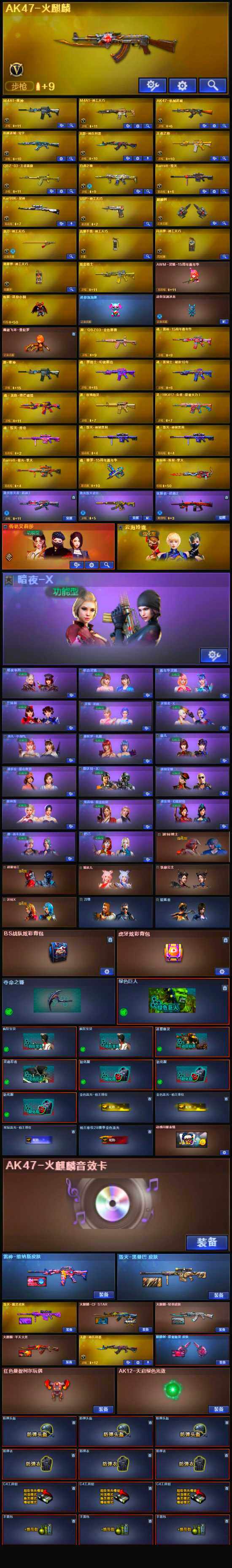 【英雄级武器】:AK47-火麒麟,M4A1-雷神,AK47-机械迷城,M4A1-神工天巧,无影-神兵利器,王者之势-觉醒版,QBZ-03-王者蔷薇-觉醒版,白虎之魄-觉醒版,Barrett-毁灭,Kar98K-星神,USP-神工天巧,麒麟刺,唐刀-神工天巧,高爆手雷-神工天巧,闪光弹-神工天巧,烟雾弹-神工天巧,M4A1-赤狱骑士