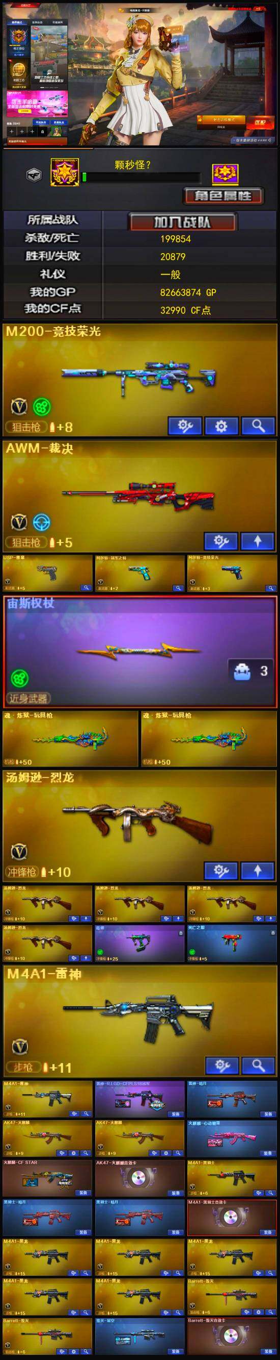 【皮肤】:雷神-暗月,雷神-R.LGD-CFPLS18冠军,火麒麟-雷神,火麒麟-心动糖果,毁灭-星空,黑骑士-暗月*2,死神-秘银,天启-暗月,战神-粉色甜心皮肤,战神-紫绶金章皮肤,战神-流金岁月皮肤,天龙-秘银*2,AWM-天龙-传奇白鲨,修罗-能量核心,天神-暗月*4