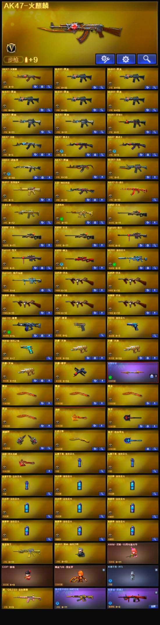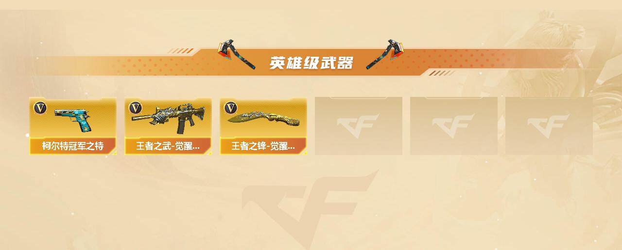 【英雄级武器】:AK47-火麒麟*2,M4A1-黑龙*5,M4A1-雷神*2,M4A1-黑骑士,AK47-无影,AK47-黑武士*2,AN94-超新星,AK47-黑鲨,M4A1-龙血,无影-神兵利器,M4A1-玫瑰精灵,王者之武-觉醒版,AK-47-猩红传说*2,AWM-天龙*3,Barrett-毁灭*2,AWM-裁决,M200-竞技荣光,汤姆逊-烈龙*5,AA-12-雷霆,沙鹰-修罗,沙鹰-天神*3,USP-雷暴,柯尔特-冠军之特,柯尔特-竞技荣光,屠龙*4,龙啸,擎天,麒麟刺,擎天-竞技荣光,王者之锋-觉醒版,高爆手雷-竞技荣光*3,闪光弹-竞技荣光*4,烟雾弹-竞技荣光*4
