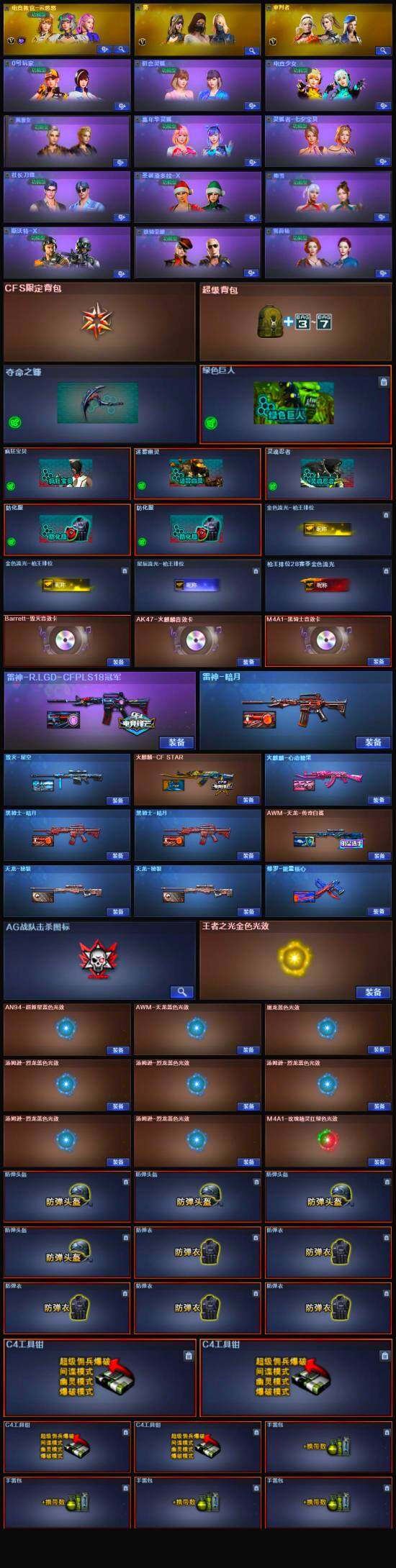 【道具】:CFS限定背包,炫彩背包,超级背包,救世主-黑桃战神,绿色巨人,灵魂忍者,迷雾幽灵,夺命之镰,防化服*2,金色流光-枪王排位*2,星辰流光-枪王排位,枪王排位28赛季金色流光,枪王排位29赛季金色流光,防弹头盔*4,防弹衣*5,C4工具钳*4,手雷包*4