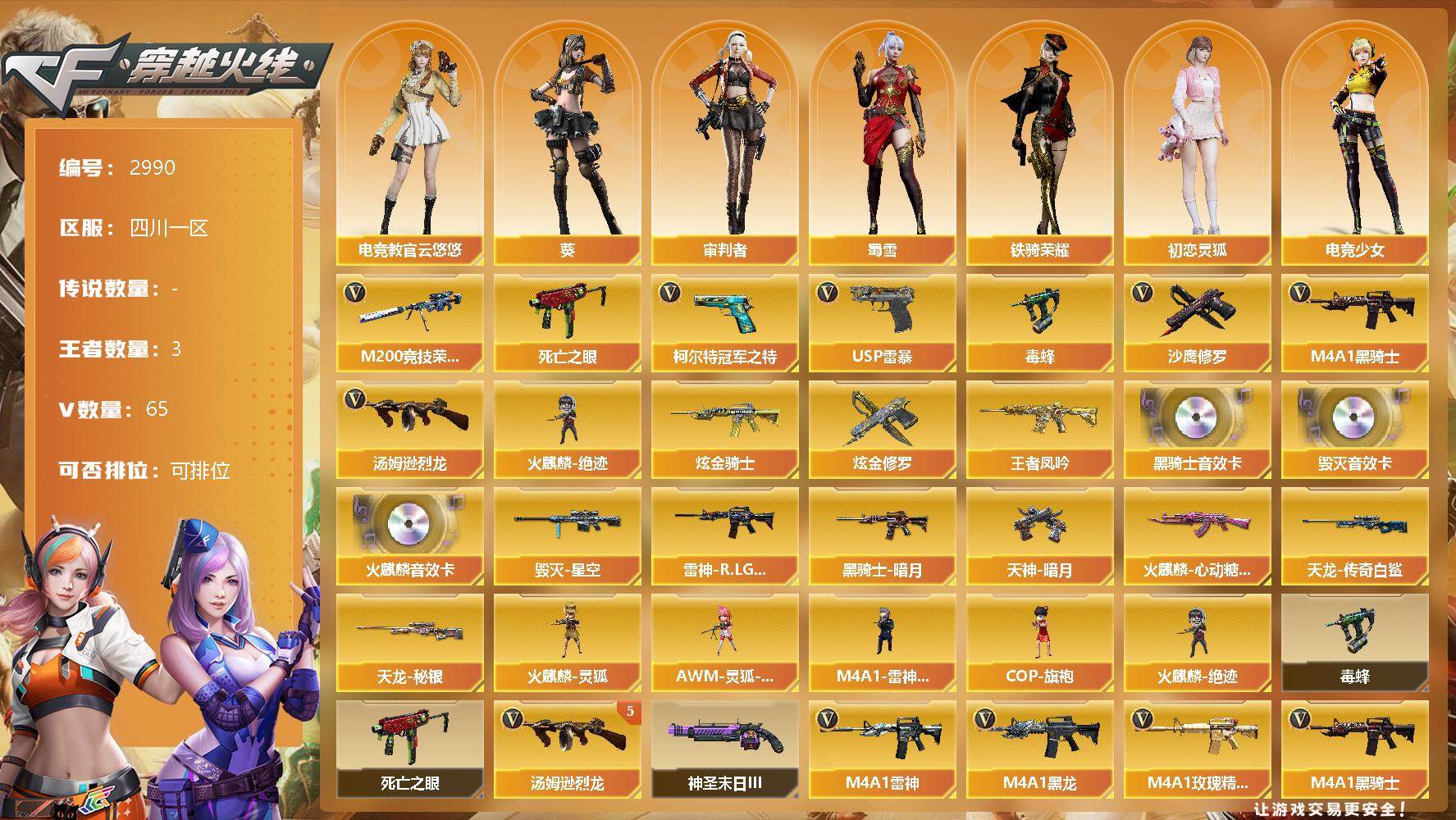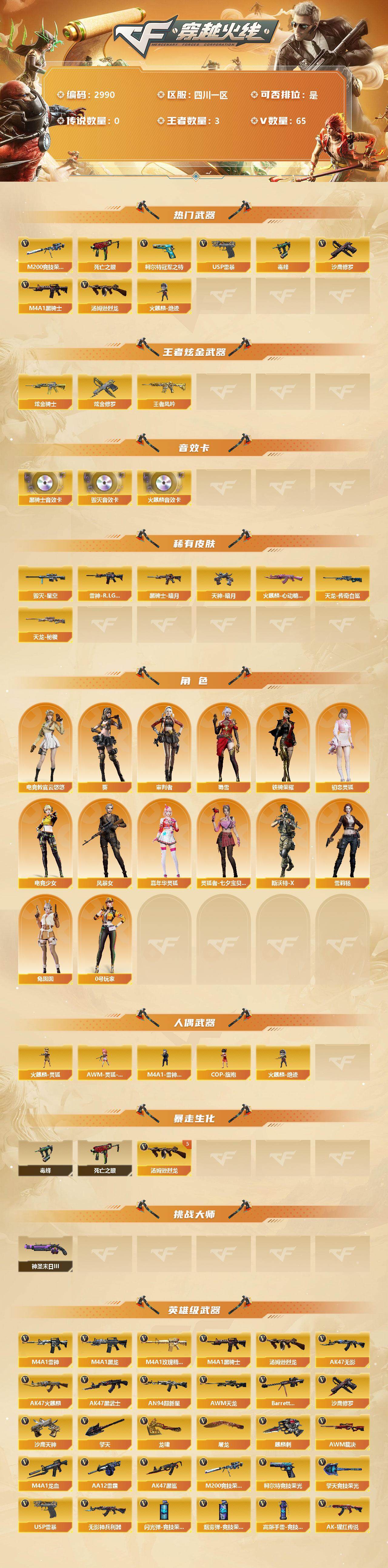 [13361607]四川一区-65V-3王者-2炫金 【热门武器】:M200-竞技荣光,死亡之眼,柯尔特-冠军之特,毒蜂,M4A1-黑骑士,汤姆逊-烈龙*5,火麒麟-绝迹,USP-雷暴,沙鹰-修罗 【王者炫金武器】:王者凤吟,炫金骑士,炫金修罗 【音效卡】:AK47-火麒麟音效卡,M4A1-黑骑士音效卡,Barrett-毁灭音效卡 【皮肤】:雷神-暗月,雷神-R.LGD-CFPLS18冠军,火麒麟-雷神,火麒麟-心动糖果,毁灭-星空,黑骑士-暗月*2,死神-秘银,天启-暗月,战神-粉色甜心皮肤,战神-紫绶金章皮肤,战神-流金岁月皮肤,天龙-秘银*2,AWM-天龙-传奇白鲨,修罗-能量核心,天神-暗月*4 【角色】:葵,电竞教官-云悠悠,审判者,初恋灵狐,电竞少女,风暴女,嘉年华灵狐,0号玩家,灵狐者-七夕宝贝,斯沃特-X,蜀雪,铁骑荣耀,兔囡囡,雪莉杨 【人偶武器】:火麒麟-绝迹,火麒麟-灵狐,M4A1-雷神-精英刀锋,AWM-灵狐-15周年嘉年华,COP-旗袍 【暴走生化】:毒蜂,死亡之眼 【挑战大师】:神圣爆裂者-末日III 【英雄级武器】:AK47-火麒麟*2,M4A1-黑龙*5,M4A1-雷神*2,M4A1-黑骑士,AK47-无影,AK47-黑武士*2,AN94-超新星,AK47-黑鲨,M4A1-龙血,无影-神兵利器,M4A1-玫瑰精灵,王者之武-觉醒版,AK-47-猩红传说*2,AWM-天龙*3,Barrett-毁灭*2,AWM-裁决,M200-竞技荣光,汤姆逊-烈龙*5,AA-12-雷霆,沙鹰-修罗,沙鹰-天神*3,USP-雷暴,柯尔特-冠军之特,柯尔特-竞技荣光,屠龙*4,龙啸,擎天,麒麟刺,擎天-竞技荣光,王者之锋-觉醒版,高爆手雷-竞技荣光*3,闪光弹-竞技荣光*4,烟雾弹-竞技荣光*4 【道具】:CFS限定背包,炫彩背包,超级背包,救世主-黑桃战神,绿色巨人,灵魂忍者,迷雾幽灵,夺命之镰,防化服*2,金色流光-枪王排位*2,星辰流光-枪王排位,枪王排位28赛季金色流光,枪王排位29赛季金色流光,防弹头盔*4,防弹衣*5,C4工具钳*4,手雷包*4 【特殊枪械】:1黑骑士,5烈龙