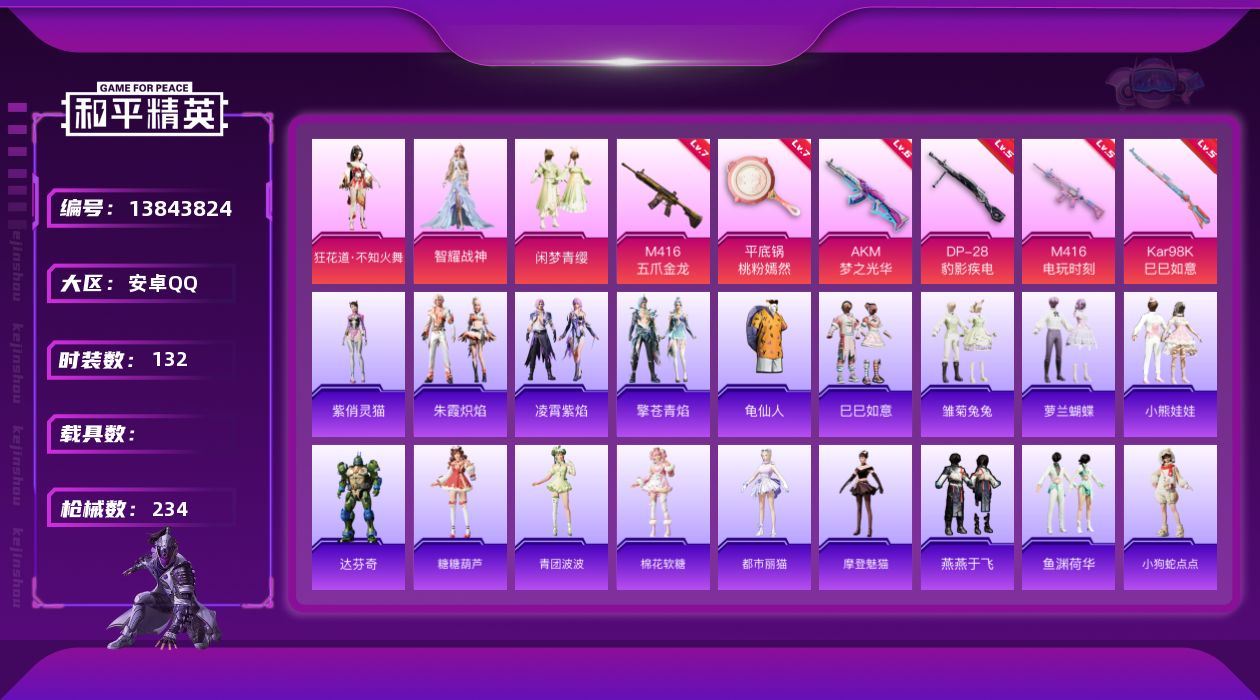 - [11521408]8粉装 4特效枪 12印记 可二次 可修改实名 身法装备:暗影哥特(红眼罩),初号机款机体服(紫螳螂) 热门装扮:幻影飞狐,奇异狩猎者,初号机款机体服(紫螳螂),极限特训,新星烈龙(小白龙),鸾凤武仙,飒粉甜心,闲梦青缨,创世·救赎,迅捷狂鲨,梦魇先生,深海小丑鱼 载具:僚机-圣域龙宝 稀有枪皮:AUG-暖羊咩咩,Kar98K-巳巳如意,Kar98K创世·救赎,M416五爪金龙 七级特效枪:七级M416-五爪金龙 六级特效枪:六级Kar98K-创世·救赎 五级特效枪:五级Kar98K-巳巳如意,五级AUG-暖羊咩咩 紫色装扮:照水倚天,和煦暖阳,田园牧歌,轻风白浪,SS22特训,萌趣咩咩,SS20特训,SS21特训,暖心橘喵,娇憨猪猪,幻彩翩翩,人气偶像,军械专家,飞狐塔尔斯,SS30特训套装,妙红点点,灵蜜圈圈,SS23特训,SS31特训套装,青涩时光,特种颜团子,SS15特训,萌趣颜团子,隐空刺,SS13特训,SS14特训,治愈之星,科技之星,飞驰魅影,SS18特训,雪兔飞飞,音速流光,极速竞梦,SS19特训,冰川特警,SS16特训,薰款战斗服,真嗣款战斗服,SS17特训,蓝色运动,虎虎生威吉莉,街头潮人,蓝彩潮人,都市漫游者,都市魅力,酒红色名流,酷潮明星,野性战心,空岛之星,竞技达人朋克,红色运动,绮丽涂鸦,缤纷果语,耀眼新星,荣耀,长空猛禽,冰河战士,龙魂突击队,蝶变,龟仙人,龙腾端午,风暴特警,雪鹰学院,霓虹街区,青年教官,龙的传人,飞行日记,魅力单车,鹤鸣,麻辣教官,黄色伏地魔,黄色名流,黄色运动,黑色伏地魔,福星高照,战地督导,极地朋克,极速红龙,柠萌假日,格斗先锋,橘黑制服,沙漠雄狮,冷焰舞者,吉莉礼服,坚韧舞者,夏日倾情,夏日音浪,完美偶像,帅气教官,幻世战舞者,幻影武者,活力之心,特战英豪,特殊使命,特训学院,狂沙舞者,猎鹰,猛禽,王牌教练,白熊同盟,白色伏地魔,破晓战魂,破蛋小黄鸡,海岛探路者,涂山之恋,深蓝色名流,湖蓝色名流,牛气满满,灼焰舞者,炫蓝之夏,热血青春,燃烧卡路里,牛气冲天,小熊娃娃,雏菊兔兔,萝兰蝴蝶,SS29特训,米开朗基罗,纯真浪花,热情海星,曼妙人鱼,SS28特训,创世·幻影,创世·追猎,燕燕于飞,暗影哥特(红眼罩),鱼渊荷华,玉兔迎春,巳巳如意,烈火街头,森林游猎者,炽纹蛇影,星途旅人,青团波波,糖糖葫芦,棉花软糖,竞