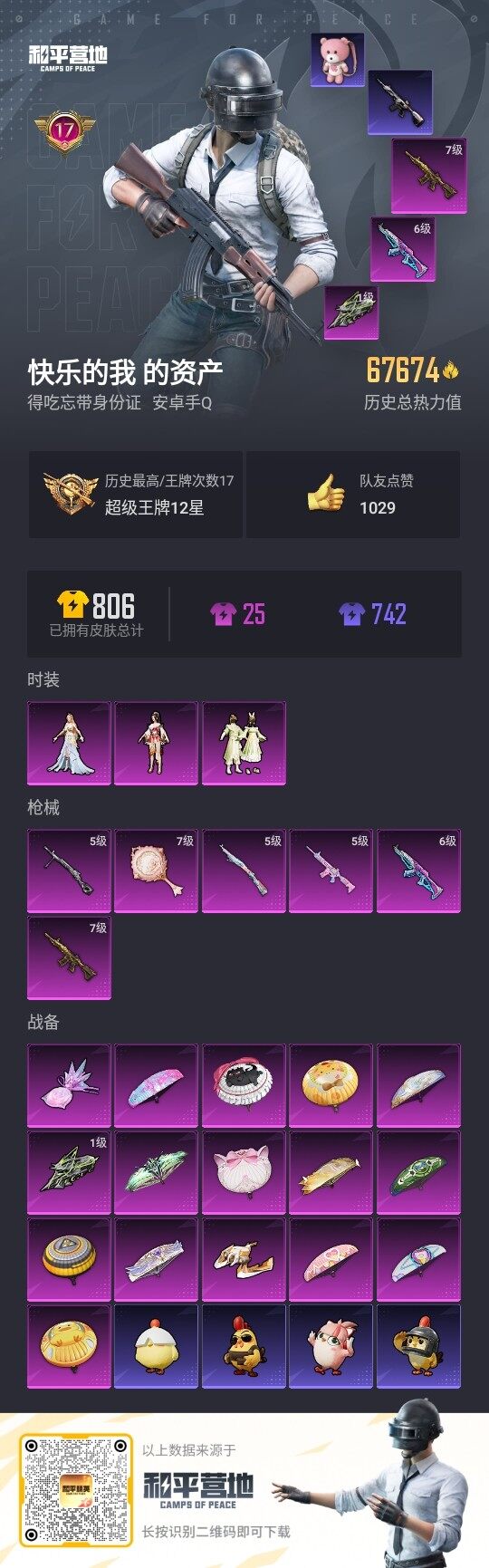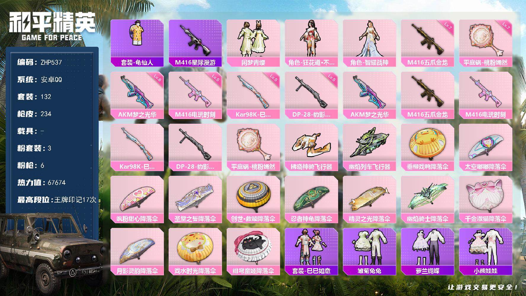 [13843824]【店主推荐捡漏号!可直接换绑】 安卓 手Q-3粉装-6特效枪-3粉色飞行器-6.7w热力值-17王牌印记-132套装-234枪皮【热门品类】:套装-龟仙人,M416-星际漫游【粉色套装】:粉装-闲梦青缨,角色-狂花道·不知火舞,角色-智耀战神【粉色枪皮等级】:AKM-梦之光华(六级),M416-五爪金龙(七级),M416-电玩时刻(五级),Kar98K-巳巳如意(五级),DP-28-豹影疾电(五级),平底锅-桃粉嫣然(七级)【粉色飞行器】:拂晓神骑飞行器,幽焰列车飞行器