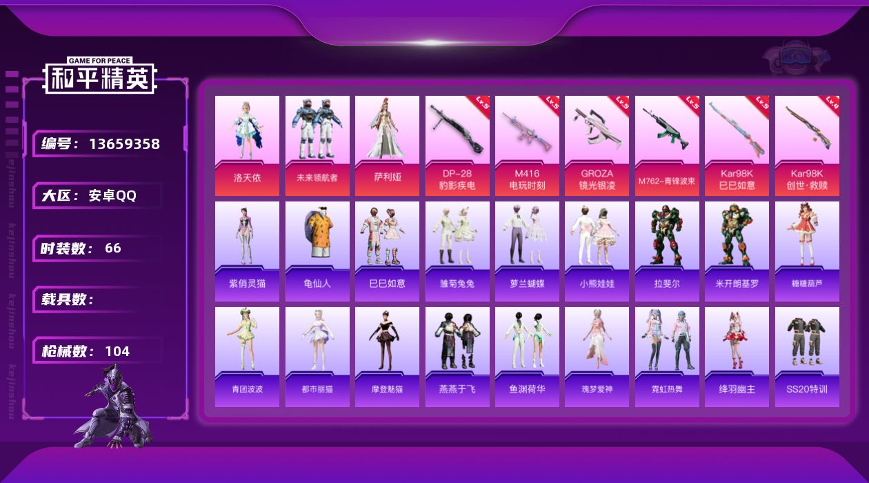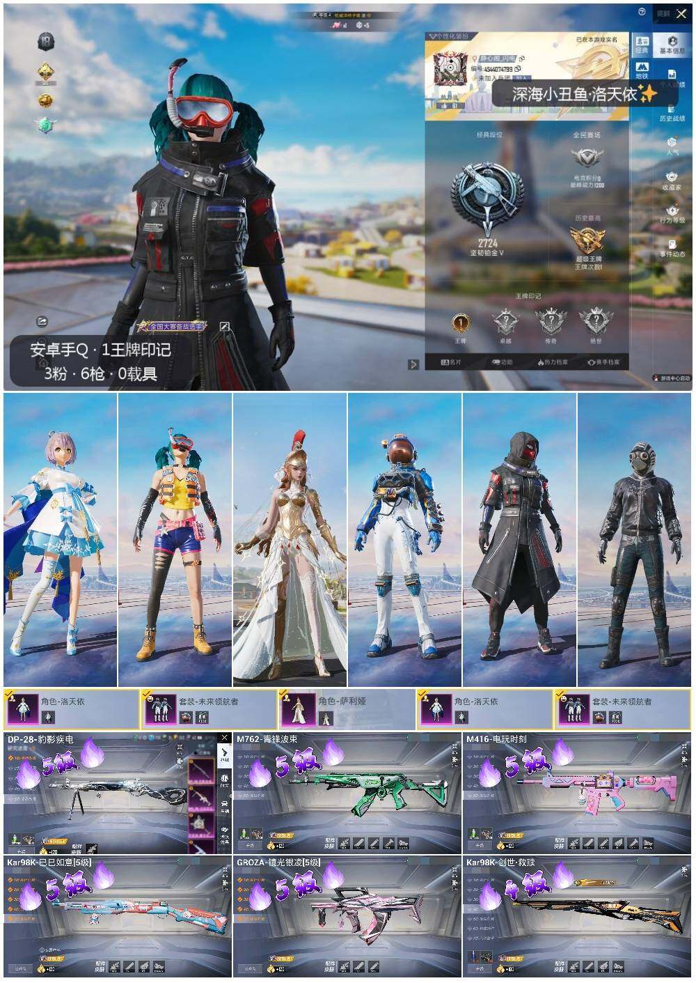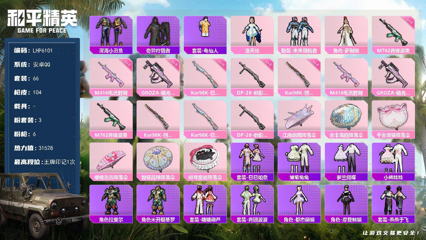 [13659358]可二次【店主推荐捡漏号!可直接换绑】地铁满天赋 安卓 手Q-3粉装-6特效枪-3.1w热力值-1王牌印记-66套装-104枪皮【热门品类】:套装-深海小丑鱼,套装-奇异狩猎者,套装-龟仙人【粉色套装】:角色-洛天依,粉装-未来领航者,角色-萨利娅【粉色枪皮等级】:M416-电玩时刻(五级),GROZA-镜光银凌(五级),M762-青锋波束(五级),Kar98K-创世·救赎(四级),Kar98K-巳巳如意(五级),DP-28-豹影疾电(五级)