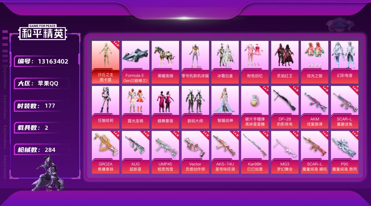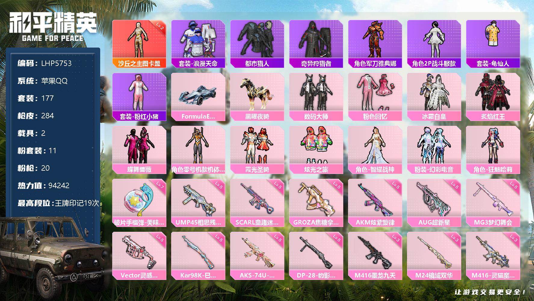 [13163402]素材身法号/绝世印记3/璀璨碎片654 苹果 手Q-1神装-11粉装-20特效枪-2载具-6粉色飞行器-9.4w热力值-19王牌印记-177套装-284枪皮【红色神装等级】:沙丘之主-图卡盟(二级)【热门品类】:套装-浪漫天命,套装-都市猎人,套装-奇异狩猎者,角色-军刀雅典娜,角色-2P战斗服款,套装-龟仙人,套装-粉红小猪【粉色载具】:Formula E Gen2(巅峰兰),黑曜夜骑【粉色套装】:粉装-数码大师,粉装-粉色回忆,粉装-冰霜白皇,粉装-炙焰红王,粉装-蝶舞蔷薇,角色-零号机款机体服,粉装-霞光圣骑,粉装-炫光之旅,角色-智耀战神,粉装-幻彩电音,角色-狂魅哈莉【粉色枪皮等级】:AKM-炫紫旋律(五级),SCAR-L-童趣迷兔(五级),SCAR-L-青春物语(一级),SCAR-L-魔童闹海 哪吒(三级),M416-心之恋语(一级),M416-墨龙九天(三级),M416-灵猫魔法师(三级),GROZA-焦糖拿铁(五级),AUG-超新星(五级),UMP45-相思残雪(五级),Vector-灵感创作师(五级),AKS-74U-星穹咏叹调(五级),P90-能量风暴(一级),P90-魔童闹海 敖丙(三级),Kar98K-巳巳如意(五级),M24-镜域双华(三级),DP-28-圣堂之誓(一级),DP-28-豹影疾电(五级),MG3-梦幻舞会(五级),破片手榴弹-美味星星糖(七级)【粉色飞行器】:拂晓神骑飞行器,沙丘之主天马,龙翔九天飞行器,灵猫魔法师飞行器,飞天猪飞行器,灵珠游龙飞行器