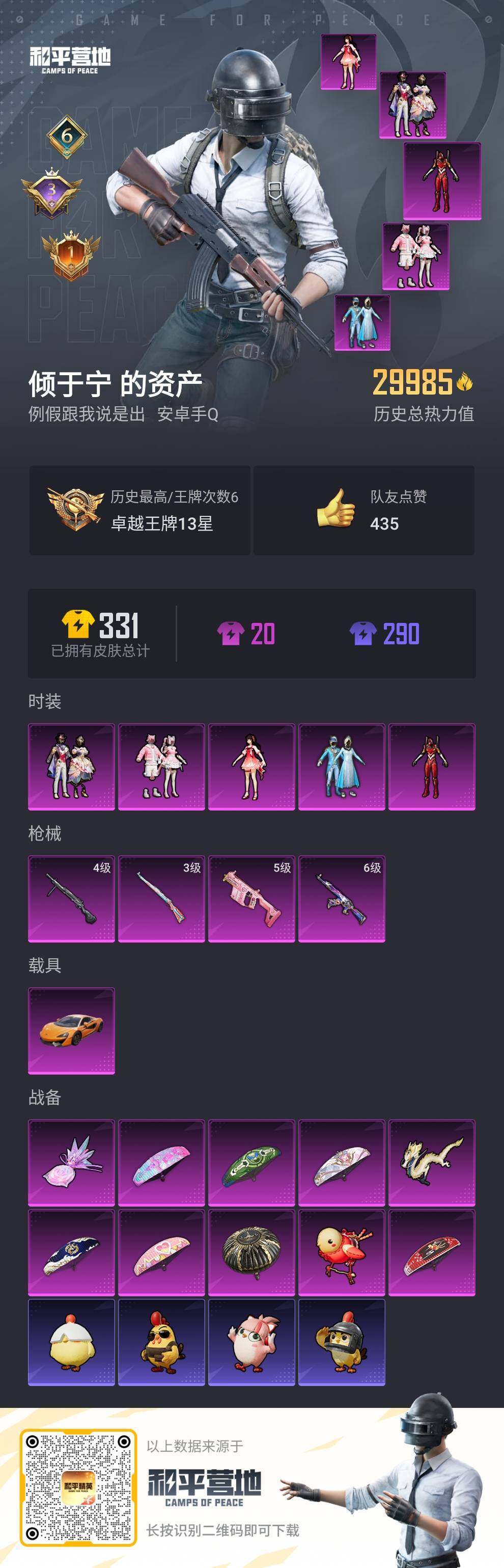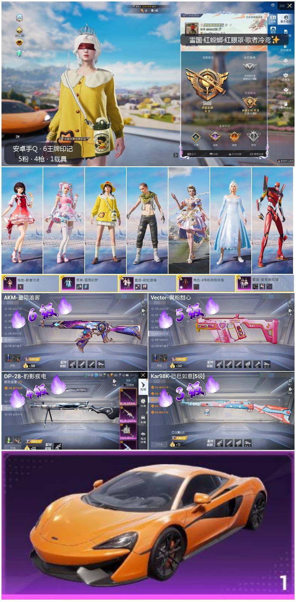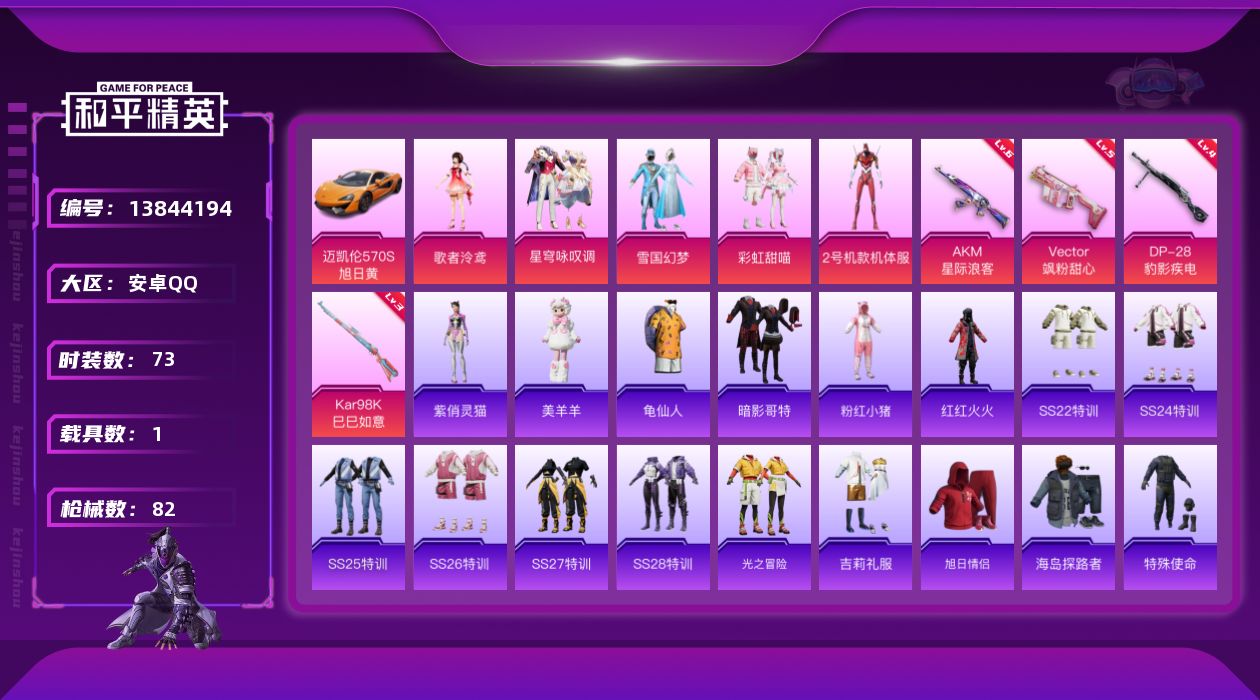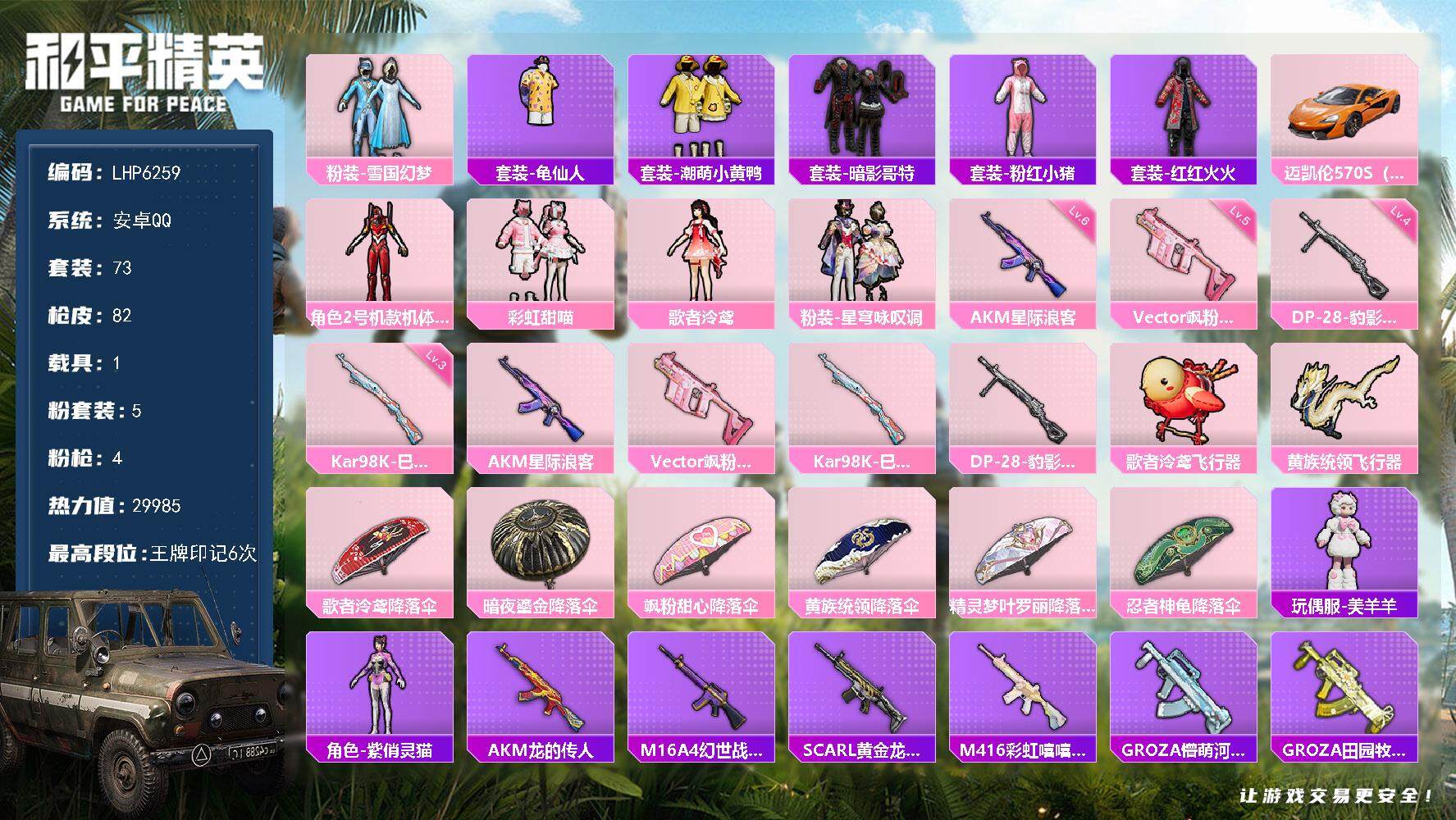 [13844194]【店主推荐捡漏号!可直接换绑】/素材身法号/地铁满天赋 安卓 手Q-5粉装-4特效枪-1载具-3粉色飞行器-2.9w热力值-6王牌印记-73套装-82枪皮【热门品类】:粉装-雪国幻梦,套装-龟仙人,套装-潮萌小黄鸭,套装-暗影哥特,套装-粉红小猪,套装-红红火火【粉色载具】:迈凯伦570S(旭日黄)【粉色套装】:粉装-雪国幻梦,角色-2号机款机体服,粉装-彩虹甜喵,角色-歌者泠鸢,粉装-星穹咏叹调【粉色枪皮等级】:AKM-星际浪客(六级),Vector-飒粉甜心(五级),Kar98K-巳巳如意(三级),DP-28-豹影疾电(四级)【粉色飞行器】:歌者泠鸢飞行器,黄族统领飞行器