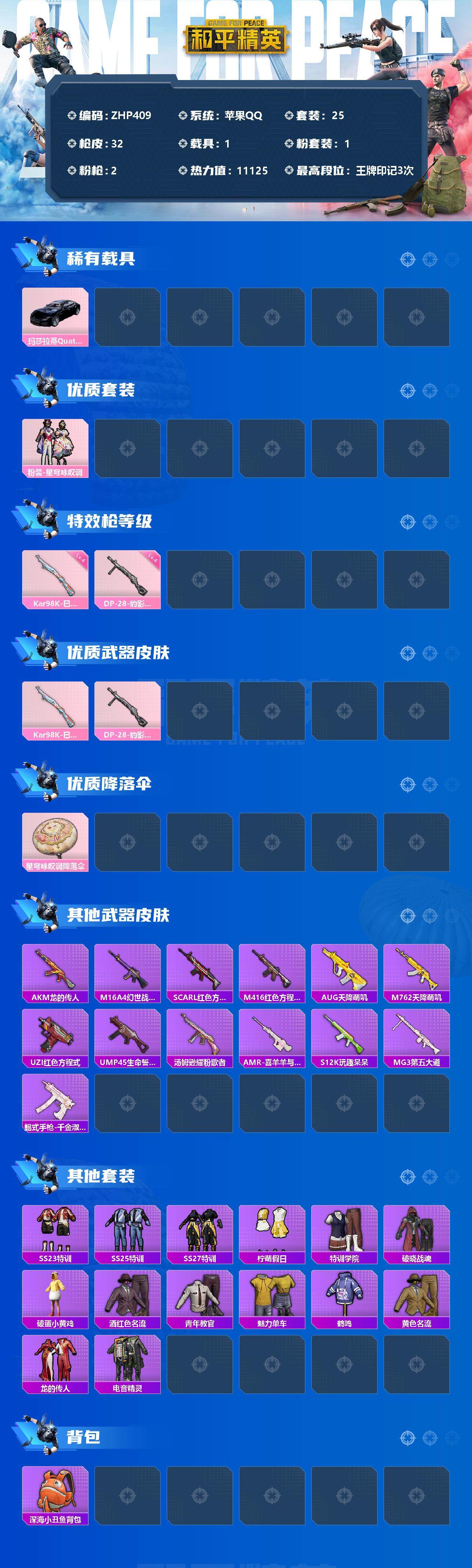 [13379877]可二次【店主推荐捡漏号!可直接换绑】 苹果 手Q-1粉装-2特效枪-1载具-1粉色飞行器-1.1w热力值-3王牌印记-25套装-32枪皮【粉色载具】:玛莎拉蒂Quattroporte(夜幕蓝)【粉色套装】:粉装-星穹咏叹调【粉色枪皮等级】:Kar98K-巳巳如意(四级),DP-28-豹影疾电(四级)