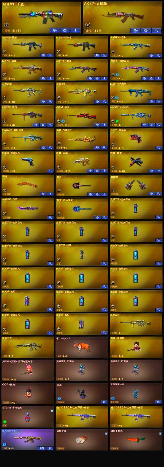 【皮肤】:QBZ03-AG-CFPLS19冠军,裁决-叶芒苍灵 皮肤,裁决-运输船 皮肤,雷神-暗月,雷神-机甲刑天皮肤,雷神-宇航兔皮肤,M4A1-再燃火线,火麒麟-平天大圣,火麒麟-百城,毁灭-黑大圣皮肤,毁灭-风暴,黑骑士-暗月,AK47-B-常胜将军-曹操,AK47-B-常胜将军-孙权*2,天神-暗月,屠龙-惊鸿 皮肤,轻型军用手斧-再燃火线