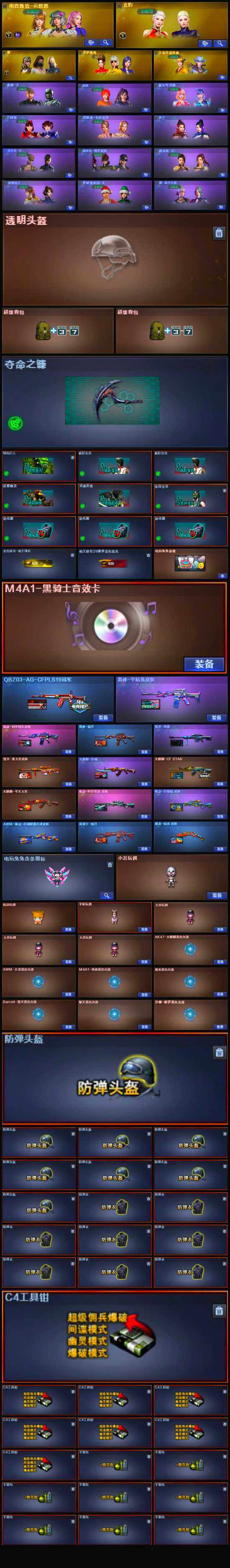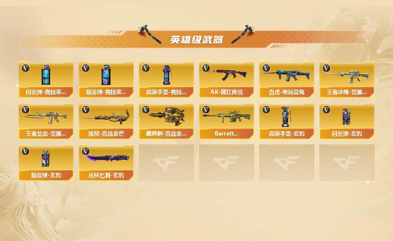 【英雄级武器】:M4A1-千变,AK47-火麒麟,M4A1-雷神,M4A1-黑骑士,无影-神兵利器,黑武士-锦绣游龙,M4A1-猎神,AK-47-猩红传说*3,王者冰魄-觉醒版,王者龙血-觉醒版,白虎-电玩蓝兔,Barrett-毁灭,AWM-裁决,M200-竞技荣光,炼狱-百战金芒,沙鹰-修罗,沙鹰-天神,COP-堕天神,柯尔特-竞技荣光,屠龙,擎天,麒麟刺,擎天-竞技荣光,麒麟刺-百战金芒,丛林匕首-玄豹,高爆手雷-竞技荣光*5,高爆手雷-玄豹,闪光弹-竞技荣光*4,闪光弹-玄豹,烟雾弹-竞技荣光*3,烟雾弹-玄豹,Barrett-碧霄极光