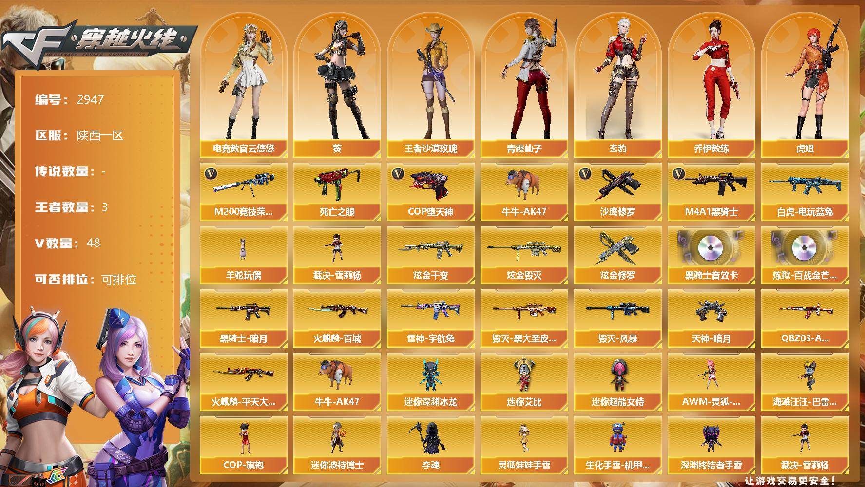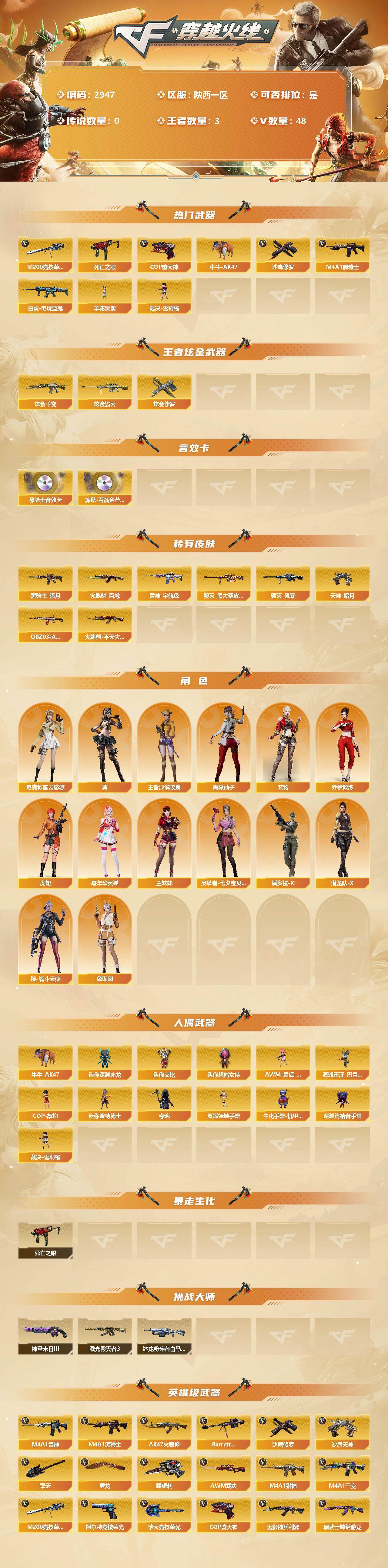 [13173342]陕西一区-48V-3王者-3炫金 【热门武器】:M200-竞技荣光,死亡之眼*2,白虎-电玩蓝兔,牛牛-AK47,M4A1-黑骑士,羊驼玩偶,裁决-雪莉杨,COP-堕天神,沙鹰-修罗 【王者炫金武器】:炫金千变,炫金毁灭,炫金修罗 【音效卡】:M4A1-黑骑士音效卡,炼狱-百战金芒-庆典舞曲音效卡 【皮肤】:QBZ03-AG-CFPLS19冠军,裁决-叶芒苍灵 皮肤,裁决-运输船 皮肤,雷神-暗月,雷神-机甲刑天皮肤,雷神-宇航兔皮肤,M4A1-再燃火线,火麒麟-平天大圣,火麒麟-百城,毁灭-黑大圣皮肤,毁灭-风暴,黑骑士-暗月,AK47-B-常胜将军-曹操,AK47-B-常胜将军-孙权*2,天神-暗月,屠龙-惊鸿 皮肤,轻型军用手斧-再燃火线 【角色】:葵,电竞教官-云悠悠,玄豹,王者沙漠玫瑰,乔伊教练,虎妞,嘉年华灵狐,兰妹妹,灵狐者-七夕宝贝,潘多拉-X,潜龙队-X,青霞仙子,兔囡囡,樱-战斗天使 【人偶武器】:裁决-雪莉杨,AWM-灵狐-15周年嘉年华,海滩汪汪-巴雷特*2,COP-旗袍,迷你艾比,牛牛-AK47,迷你超能女侍,迷你深渊冰龙,迷你波特博士,夺魂,灵狐娃娃手雷,生化手雷-机甲核心,深渊终结者手雷 【暴走生化】:死亡之眼*2 【挑战大师】:冰龙粉碎者-白马银枪*2,激光毁灭者III,神圣爆裂者-末日III 【英雄级武器】:M4A1-千变,AK47-火麒麟,M4A1-雷神,M4A1-黑骑士,无影-神兵利器,黑武士-锦绣游龙,M4A1-猎神,AK-47-猩红传说*3,王者冰魄-觉醒版,王者龙血-觉醒版,白虎-电玩蓝兔,Barrett-毁灭,AWM-裁决,M200-竞技荣光,炼狱-百战金芒,沙鹰-修罗,沙鹰-天神,COP-堕天神,柯尔特-竞技荣光,屠龙,擎天,麒麟刺,擎天-竞技荣光,麒麟刺-百战金芒,丛林匕首-玄豹,高爆手雷-竞技荣光*5,高爆手雷-玄豹,闪光弹-竞技荣光*4,闪光弹-玄豹,烟雾弹-竞技荣光*3,烟雾弹-玄豹,Barrett-碧霄极光 【特殊枪械】:1黑骑士
