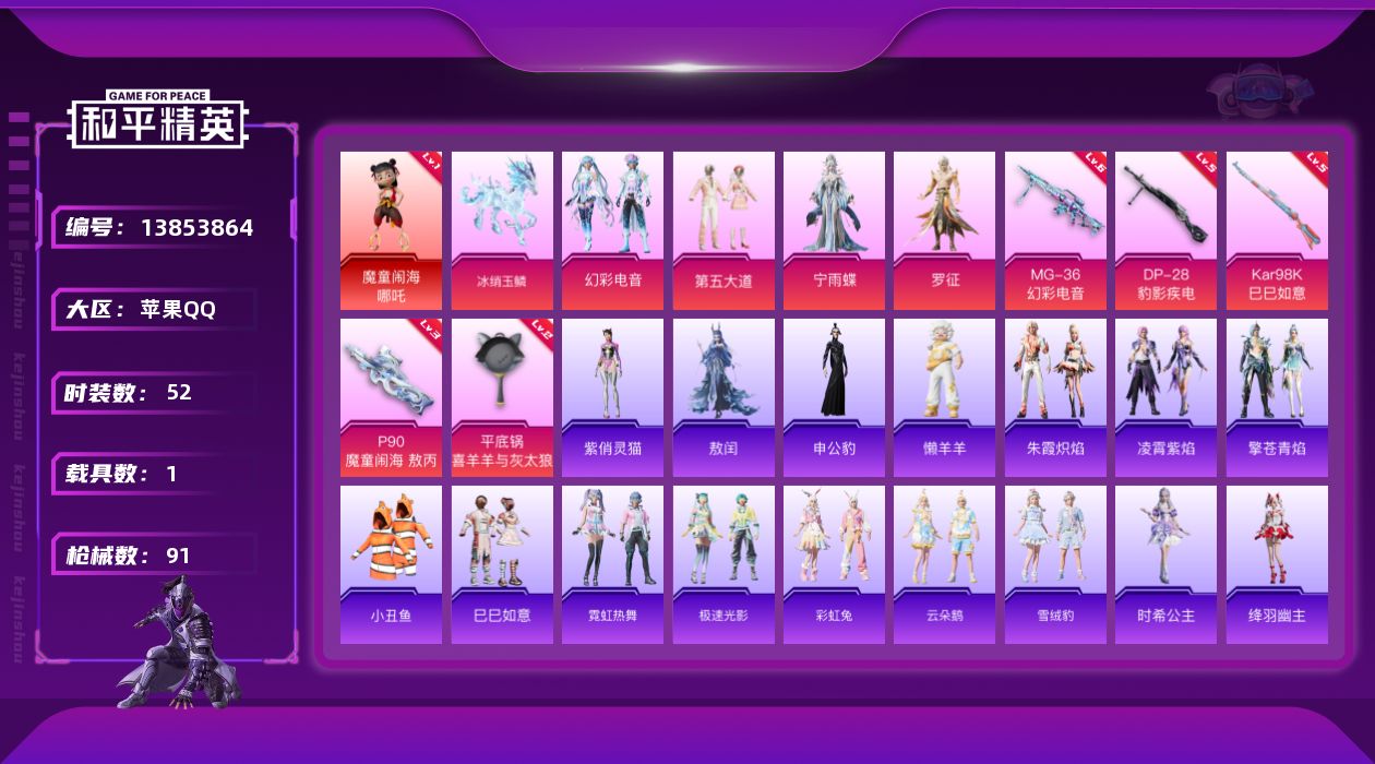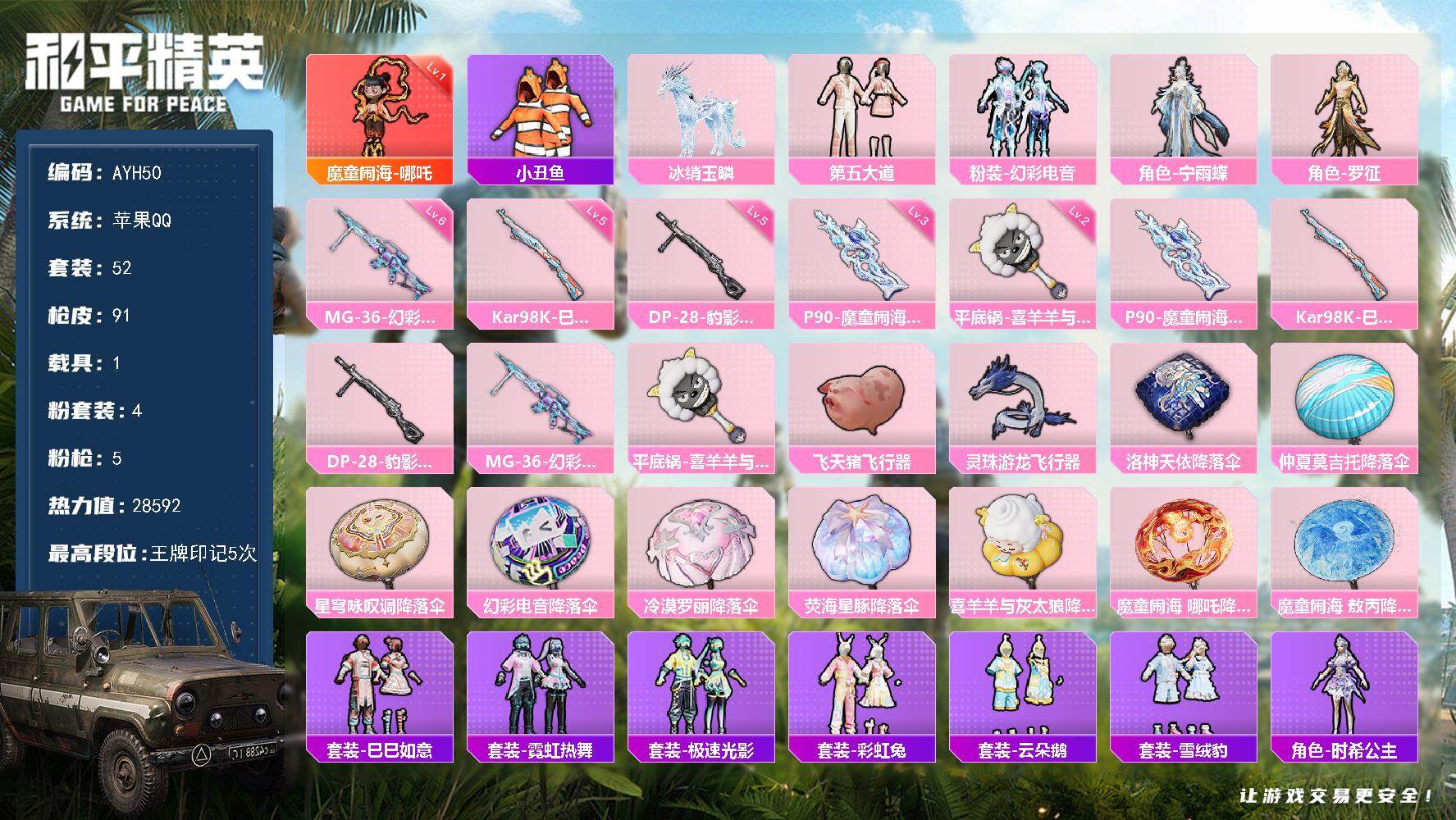 [13853864]可二次【店主推荐捡漏号!可直接换绑苹果 地铁满天赋 手Q-1神装-4粉装-5特效枪-1载具-2粉色飞行器-28592热力值-5王牌印记-52套装-91枪皮【红色神装等级】:魔童闹海-哪吒(一级)【红色角色神装】:魔童闹海-哪吒【热门品类】:套装-小丑鱼【粉色载具】:冰绡玉鳞粉色套装】:粉装-第五大道,粉装-幻彩电音,角色-宁雨蝶,角色-罗征【粉色枪皮等级】:P90-魔童闹海 敖丙(三级),Kar98K-巳巳如意(五级),DP-28-豹影疾电(五级),MG-36-幻彩电音(六级),平底锅-喜羊羊与灰太狼(二级)【粉色枪皮】:P90-魔童闹海 敖丙,Kar98K-巳巳如意,DP-28-豹影疾电,MG-36-幻彩电音,平底锅-喜羊羊与灰太狼【粉色飞行器】:飞天猪飞行器,灵珠游龙飞行器