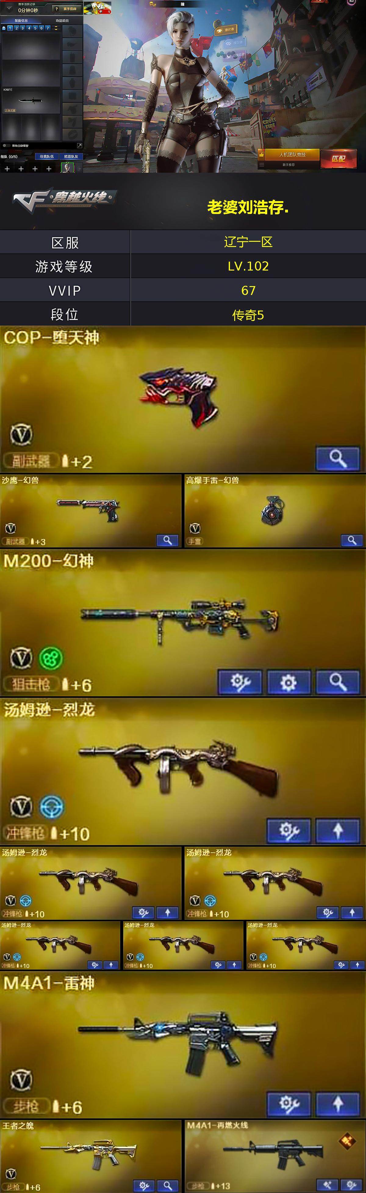 【热门武器】:HK417-朱雀,M200-幻神,死亡之眼,M4A1-黑骑士,汤姆逊-烈龙*6,COP-堕天神,沙鹰-修罗*2,高爆手雷-幻兽