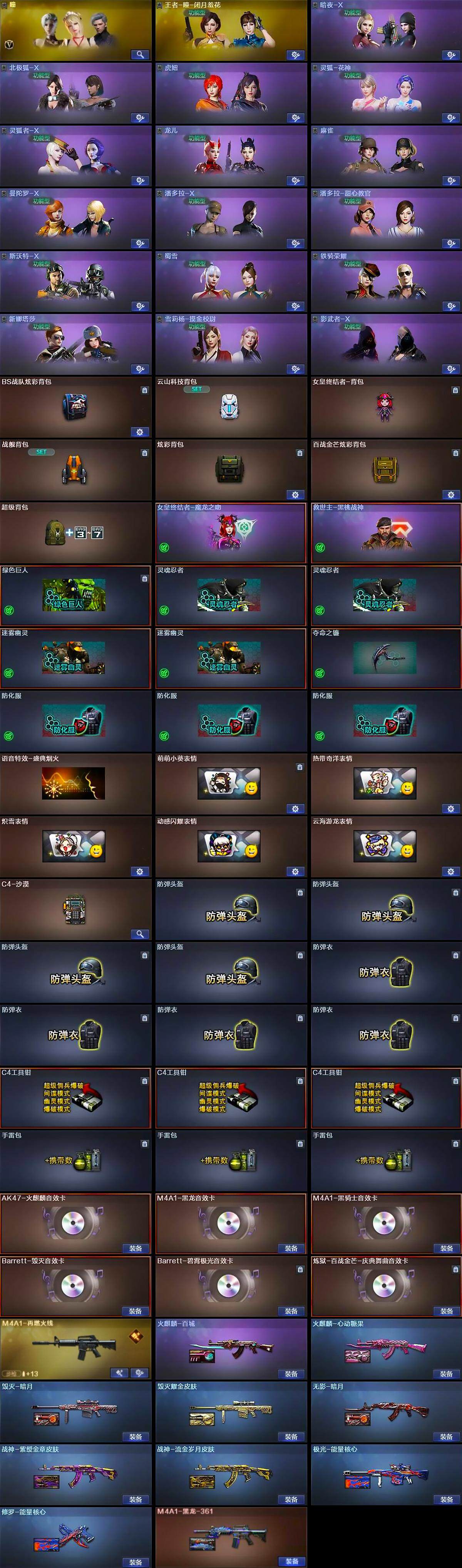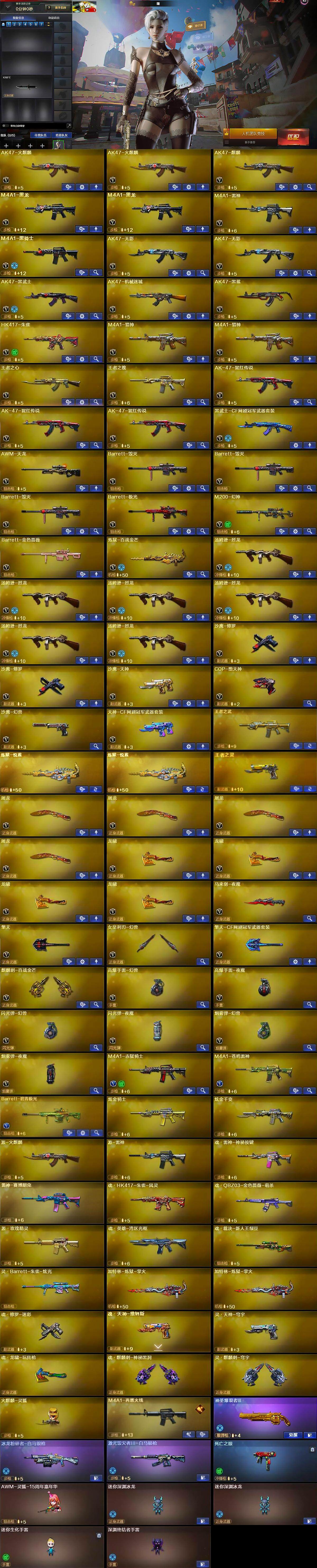 【英雄级武器】:AK47-火麒麟*2,AK47-麒麟,M4A1-黑龙*2,M4A1-雷神,M4A1-黑骑士,AK47-无影*2,AK47-黑武士,AK47-机械迷城,AK47-黑鲨,HK417-朱雀,M4A1-猎神*2,王者之心-觉醒版,王者之魄-觉醒版,AK-47-猩红传说*3,黑武士-CF网剧冠军,AWM-天龙,Barrett-毁灭*3,Barrett-极光,M200-幻神,Barrett-金色蔷薇,炼狱-百战金芒,汤姆逊-烈龙*6,沙鹰-修罗*2,沙鹰-天神,COP-堕天神,沙鹰-幻兽,天神-CF网剧冠军,屠龙*4,龙啸*4,马来剑-夜魔,擎天,女皇利刃-幻兽,擎天-CF网剧冠军,麒麟刺-百战金芒,高爆手雷-幻兽,高爆手雷-夜魔,闪光弹-幻兽,闪光弹-夜魔,烟雾弹-幻兽,烟雾弹-夜魔,M4A1-赤狱骑士,M4A1-苍鸣雷神,Barrett-碧霄极光