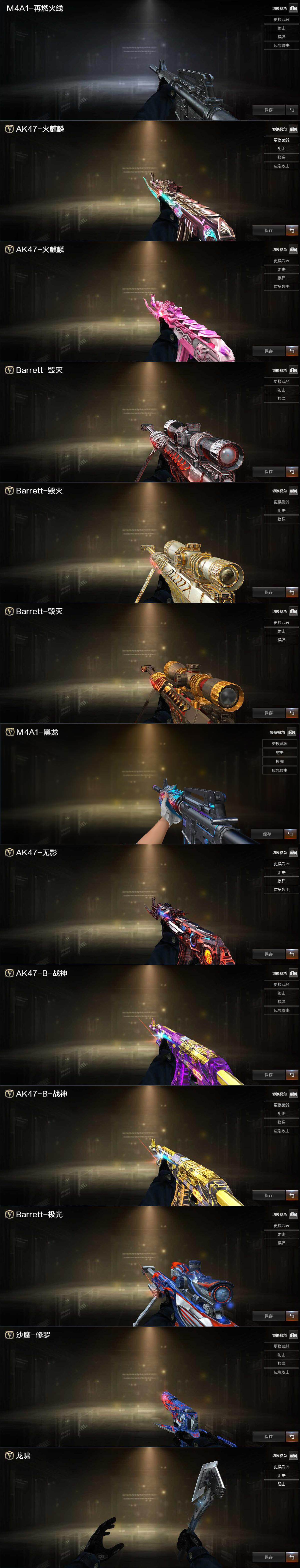【音效卡】:AK47-火麒麟音效卡,M4A1-黑龙音效卡,M4A1-黑骑士音效卡,Barrett-毁灭音效卡,Barrett-碧霄极光音效卡,炼狱-百战金芒-庆典舞曲音效卡