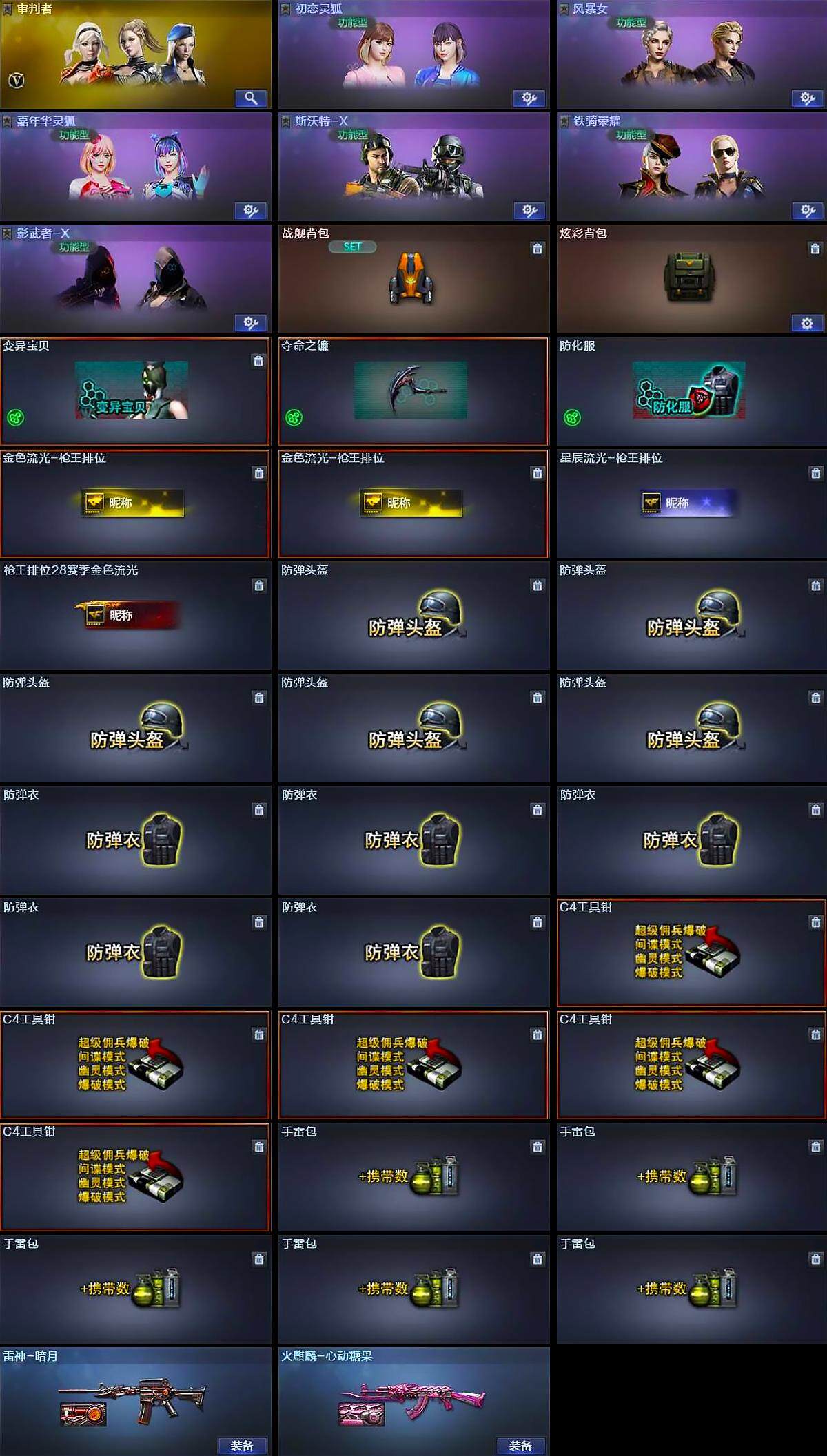 【道具】:战舰背包,炫彩背包,变异宝贝,夺命之镰,防化服,金色流光-枪王排位*2,星辰流光-枪王排位,枪王排位28赛季金色流光,防弹头盔*5,防弹衣*5,C4工具钳*5,手雷包*5
