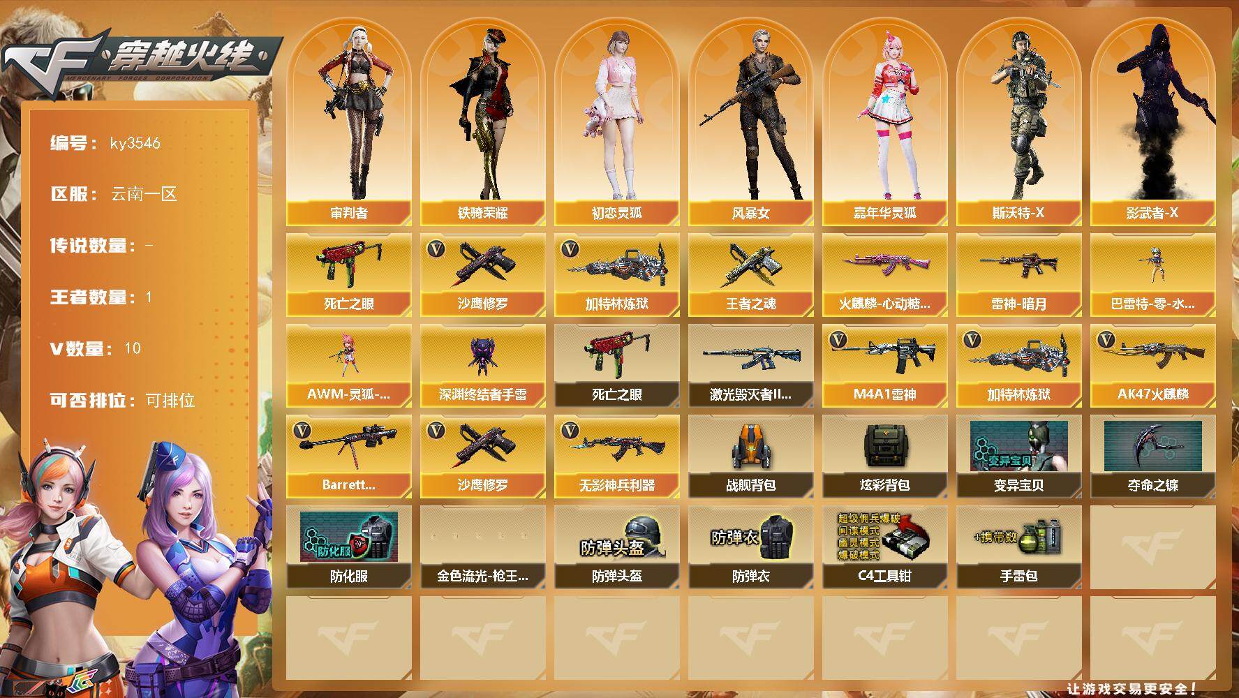 [13785346]云南一区-10V-1王者-0炫金 【热门武器】:死亡之眼,加特林-炼狱*2,沙鹰-修罗 【王者炫金武器】:王者之魂 【皮肤】:雷神-暗月,火麒麟-心动糖果 【角色】:审判者,初恋灵狐,风暴女,嘉年华灵狐,斯沃特-X,铁骑荣耀,影武者-X 【人偶武器】:巴雷特-零-水下丽影,AWM-灵狐-15周年嘉年华,深渊终结者手雷 【暴走生化】:死亡之眼 【挑战大师】:激光毁灭者III-白马银枪 【英雄级武器】:AK47-火麒麟*2,M4A1-雷神*2,无影-神兵利器,Barrett-毁灭,加特林-炼狱*2,沙鹰-修罗 【道具】:战舰背包,炫彩背包,变异宝贝,夺命之镰,防化服,金色流光-枪王排位*2,星辰流光-枪王排位,枪王排位28赛季金色流光,防弹头盔*5,防弹衣*5,C4工具钳*5,手雷包*5 【特殊枪械】:2炼狱