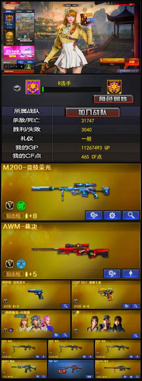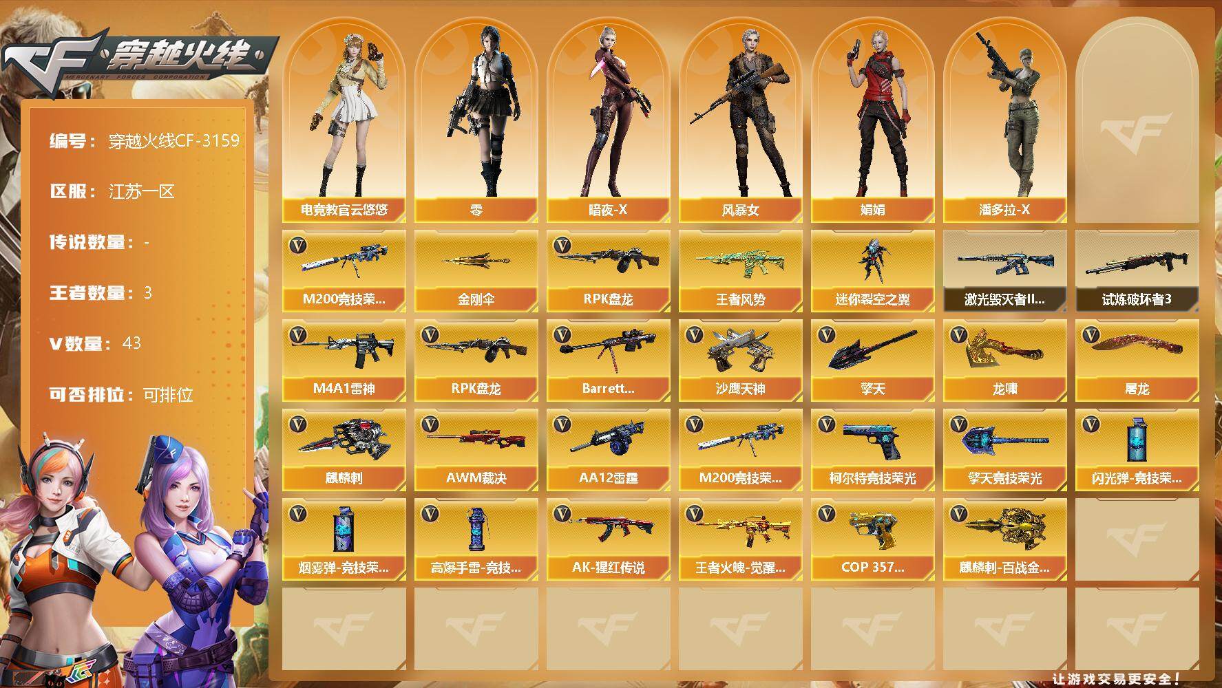 [13174902]江苏一区-43V-3王者-0炫金 【热门武器】:M200-竞技荣光,RPK-盘龙*3,金刚伞 【王者炫金武器】:王者风势 【皮肤】:雷神-暗月,M4A1-千变-孔明皮肤,战神-紫绶金章皮肤,轻型军用手斧-再燃火线 【角色】:零,电竞教官-云悠悠,暗夜-X,风暴女,娟娟,潘多拉-X 【人偶武器】:迷你裂空之翼 【挑战大师】:激光毁灭者III-白马银枪*2,试炼破坏者III 【英雄级武器】:M4A1-雷神,AK-47-猩红传说,王者火魄-觉醒版,Barrett-毁灭,AWM-裁决,M200-竞技荣光,RPK-盘龙*3,AA-12-雷霆,沙鹰-天神,COP 357-雷霆王者-觉醒版,柯尔特-竞技荣光,屠龙,龙啸,擎天*3,麒麟刺,擎天-竞技荣光,麒麟刺-百战金芒,高爆手雷-竞技荣光*7,闪光弹-竞技荣光*7,烟雾弹-竞技荣光*7 【特殊枪械】:3盘龙